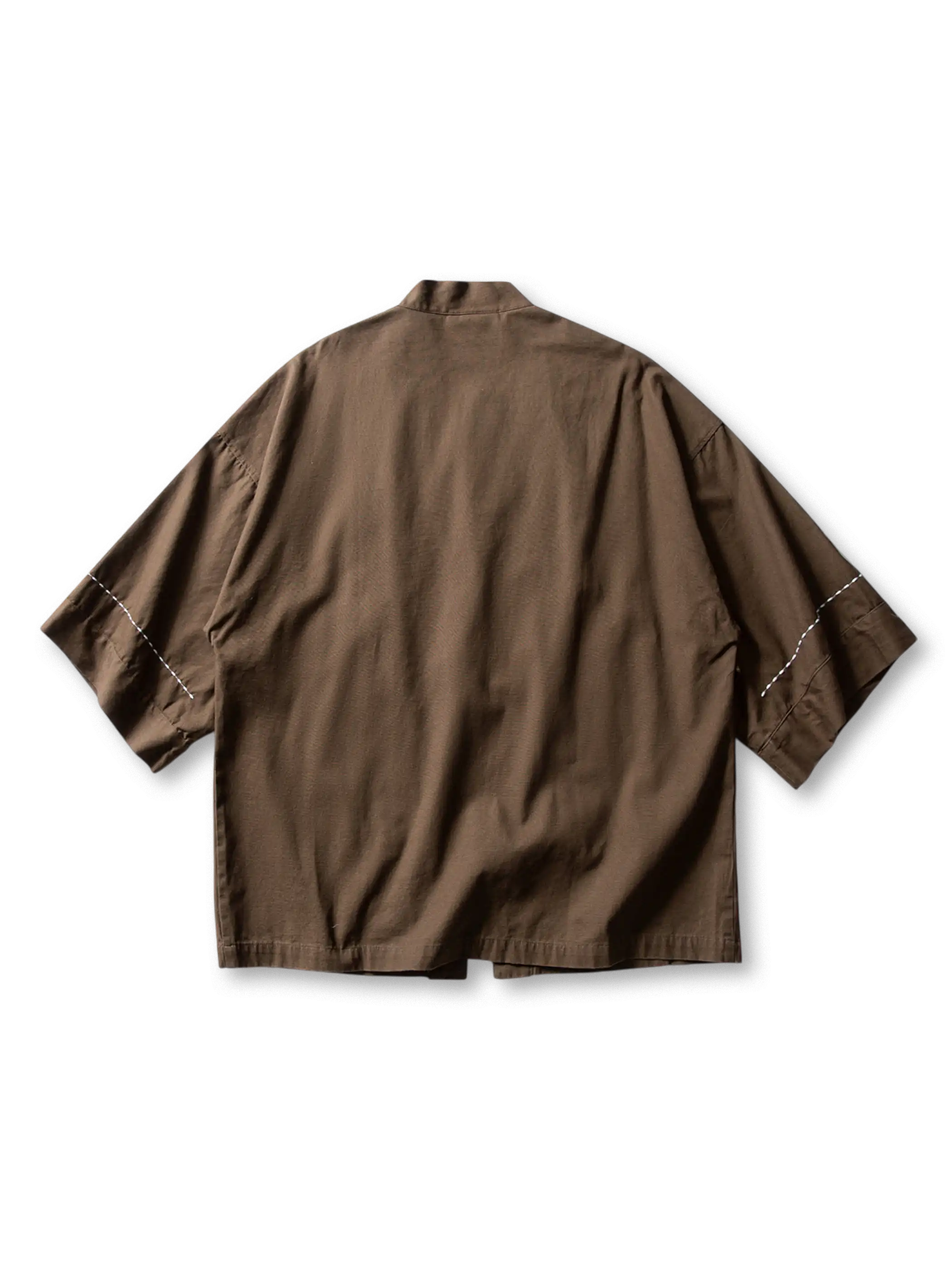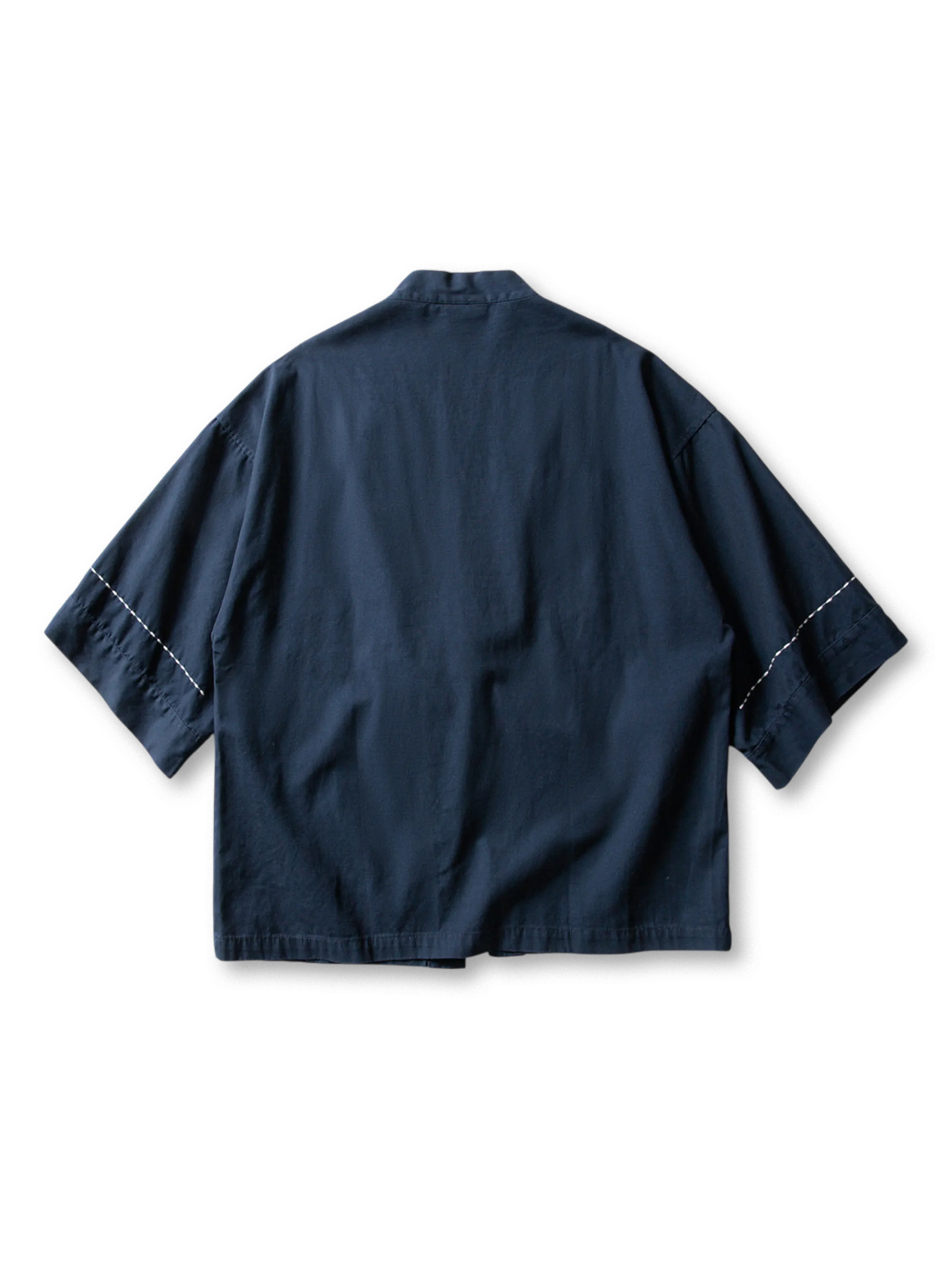 水洗い刺し子生地を使った七分袖のはんてんで、独特の配色とデザインによって、日常の着こなしに快適さとヴィンテージ感をプラスする一着。
