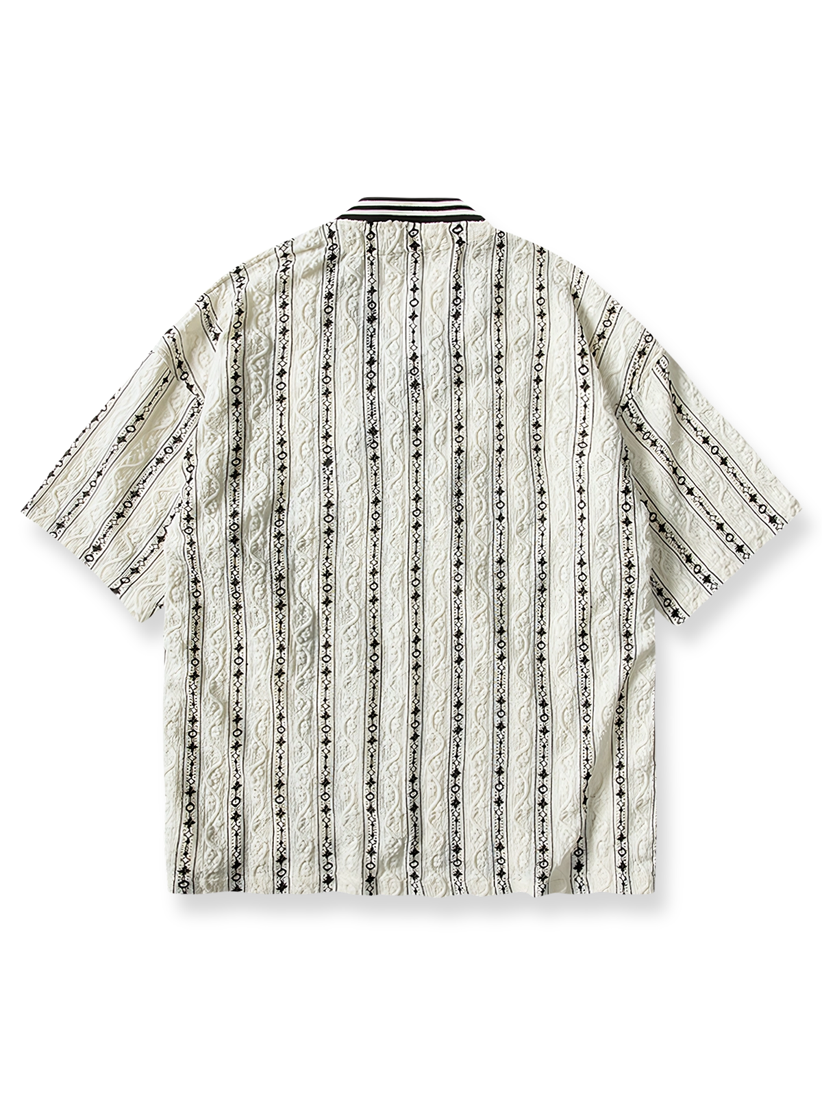 ストライプデザインとはんてんスタイルを組み合わせた、レトロでおしゃれな半袖シャツ。