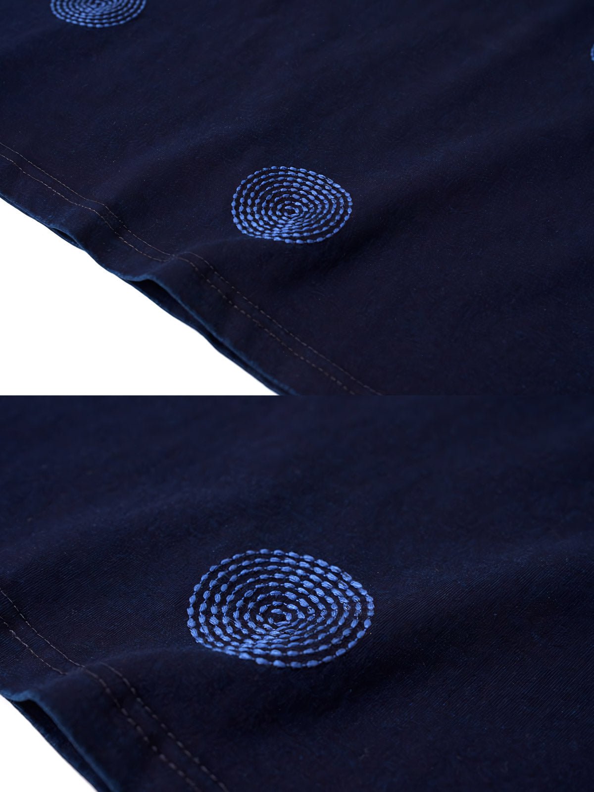 この短袖Tシャツは、100%コットンのインディゴウォッシュ生地を使用しており、柔らかく快適で、独特のヴィンテージ感があります。独特な刺し子エンブロイダリーデザインが全体に施され、視覚的な面白さとディテール感を増しています。ゆったりとしたクルーネックデザインは、高い快適性と通気性を提供し、日常のカジュアルな着こなしに最適です。シングルでもジャケットとのコーディネートでも、ファッション性と個性を示します。