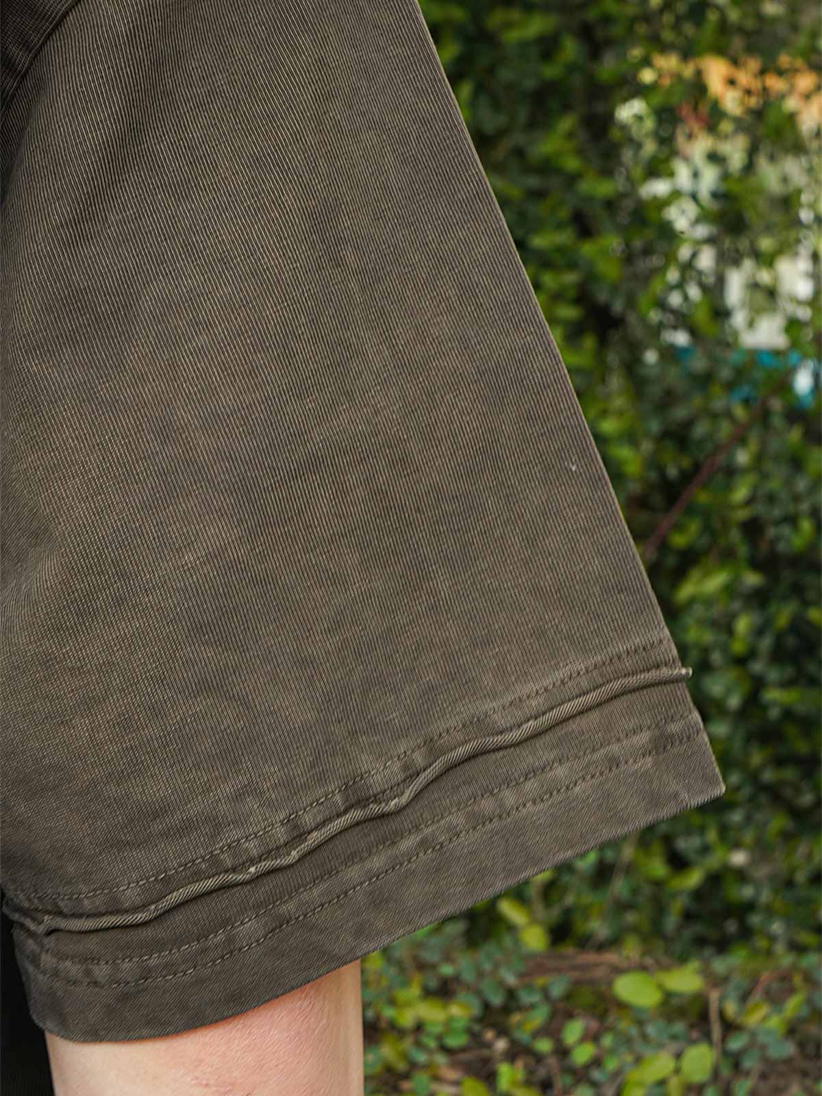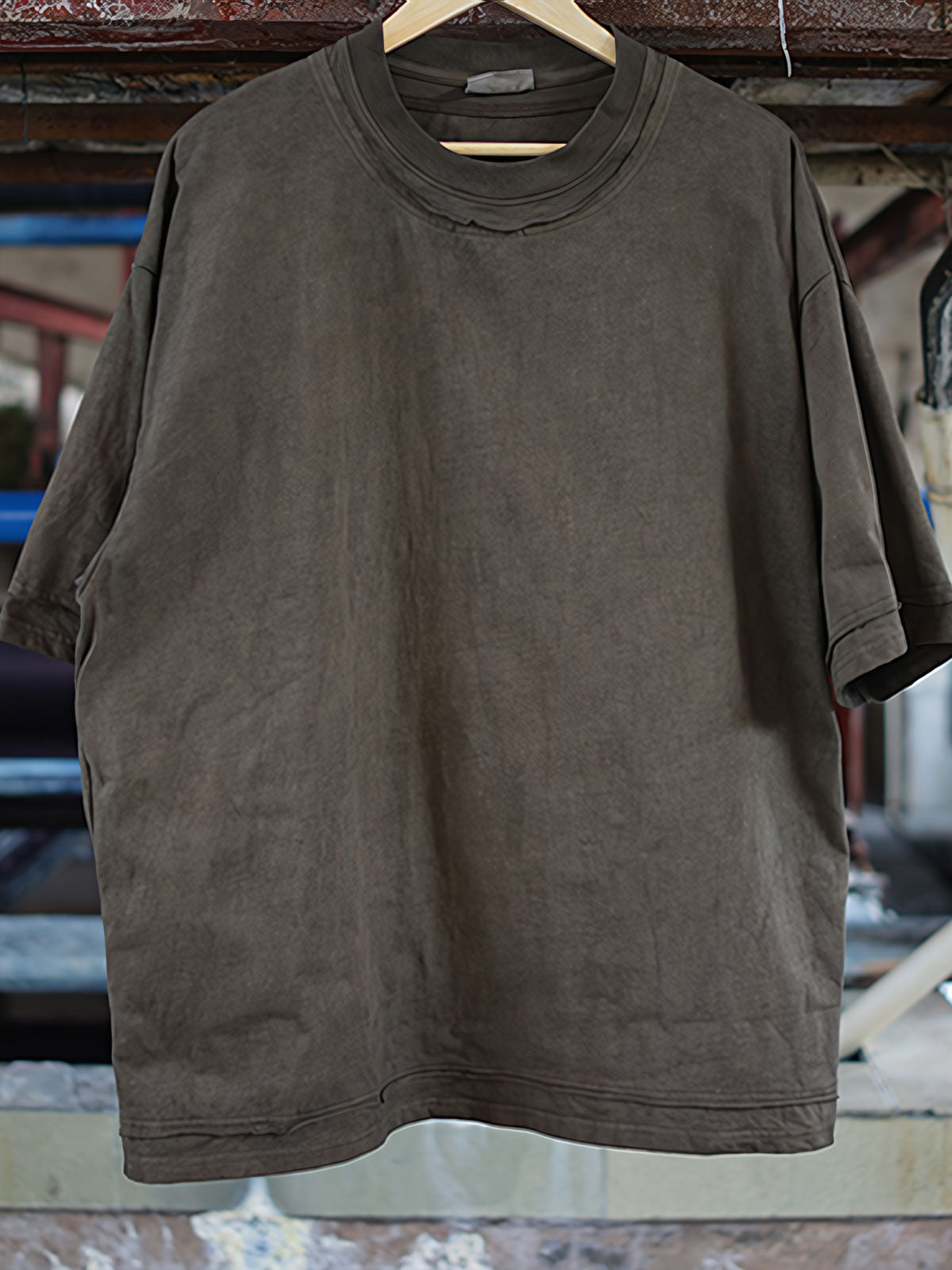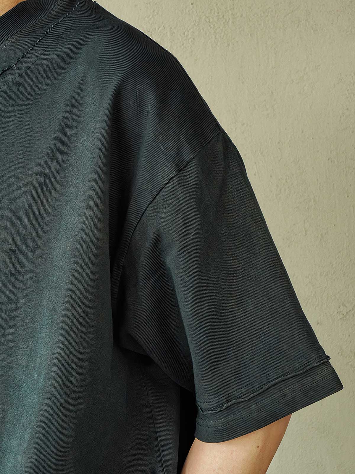この半袖Tシャツは、手作業による古法植物染色工法を採用しています。クリの殻から抽出した染料を使用し、独特な風合いを表現しています。生地は特別に織られた330グラムのコットンで、最初はやや硬いですが、着用と洗濯を重ねると徐々に柔らかくなり、独特な質感と色落ちを楽しむことができます。切りっぱなしのデザインがファッショナブルな要素を加え、ゆったりとしたシルエットが体をスッキリと見せます。藍色は植物染色と古法藍染の処理を経ており、細部には不均一な模様が見られます。洗うごとに色が徐々にベースカラーを現し、藍色との融合で独特の色落ちが楽しめます。