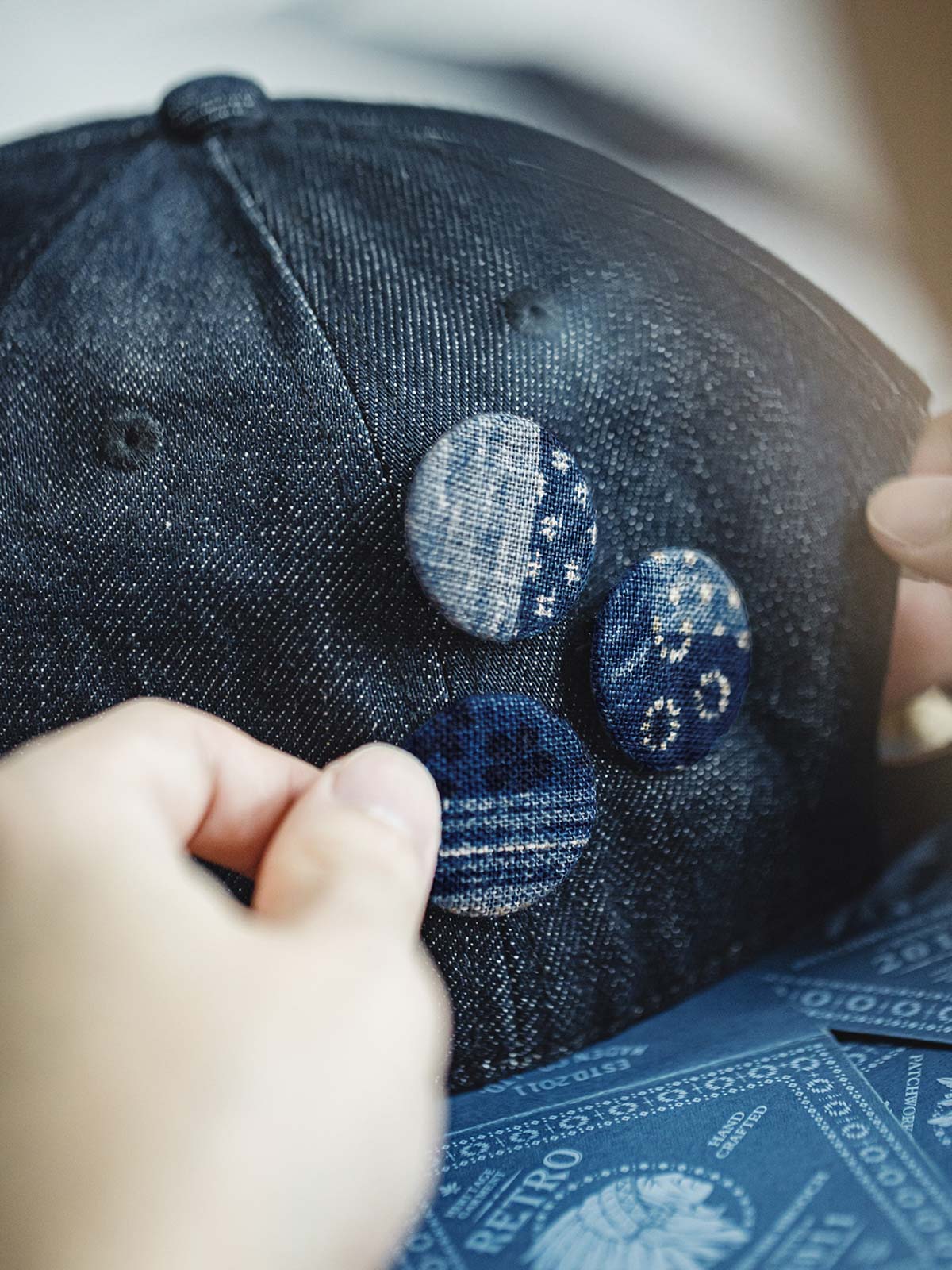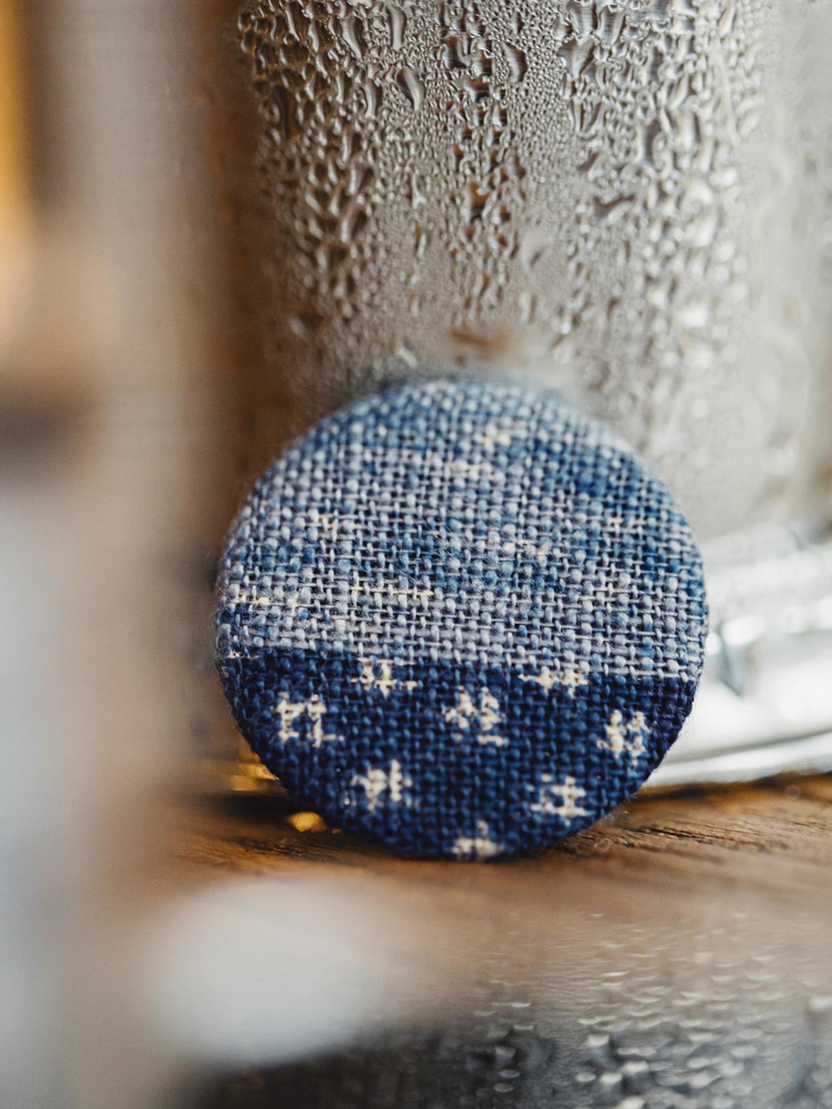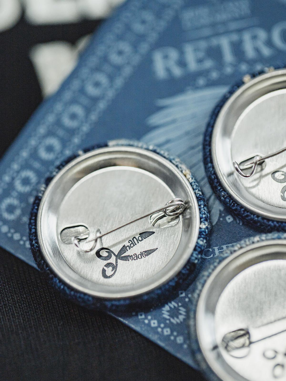 この古布プリントピンバッジは、輸入古布とブリキで作られ、独特なヴィンテージスタイルを提供。