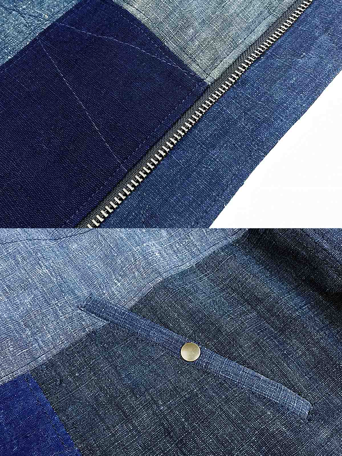 このジャケットには、刺子布を使用しています。これは丈夫で耐久性のある綿素材で、表面には顕著なテクスチャーがあり、粗野な手触りと視覚効果を提供します。刺子布の使用は、服の耐久性と手工芸の価値を強調しています。