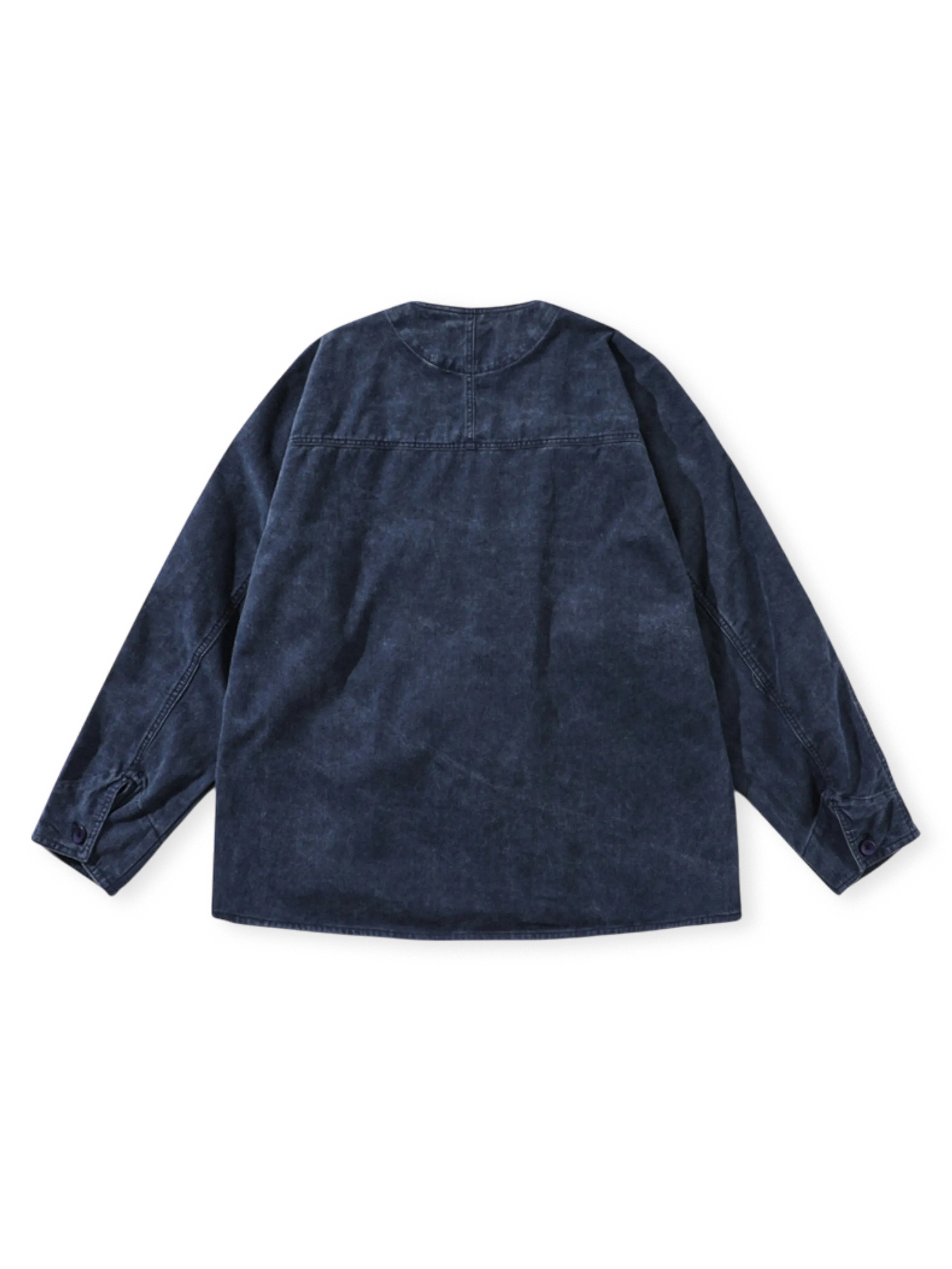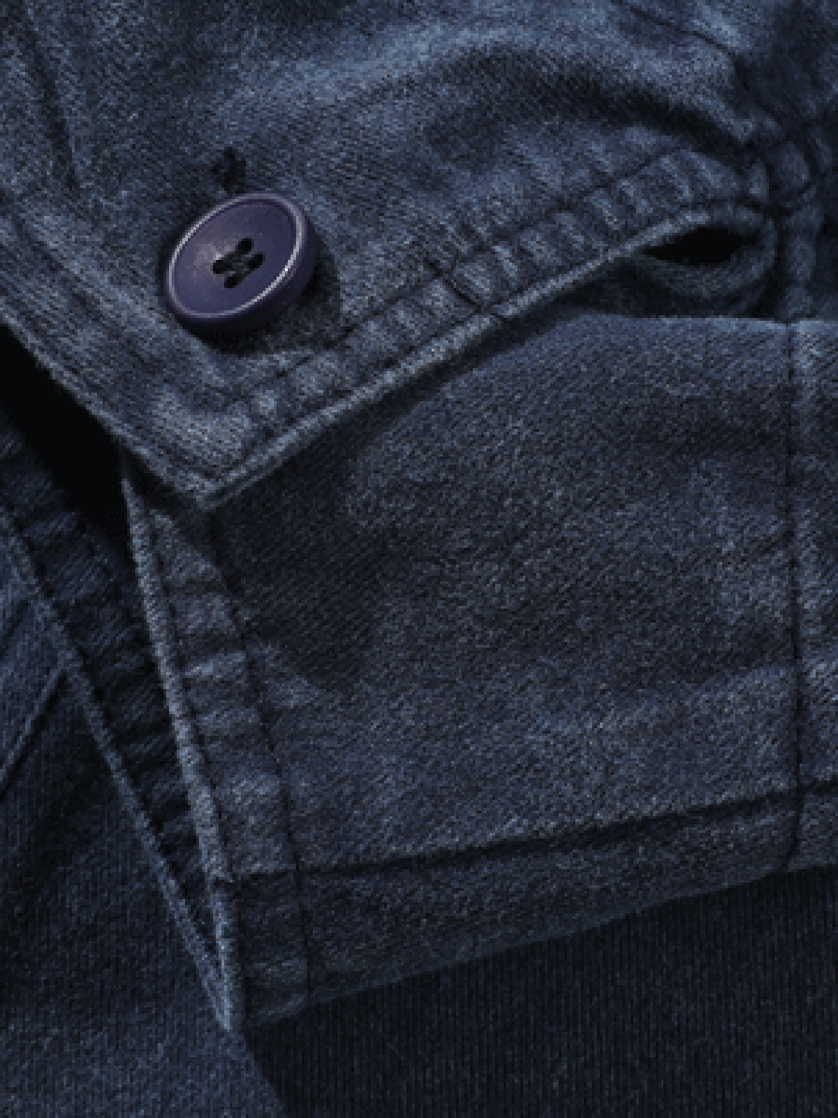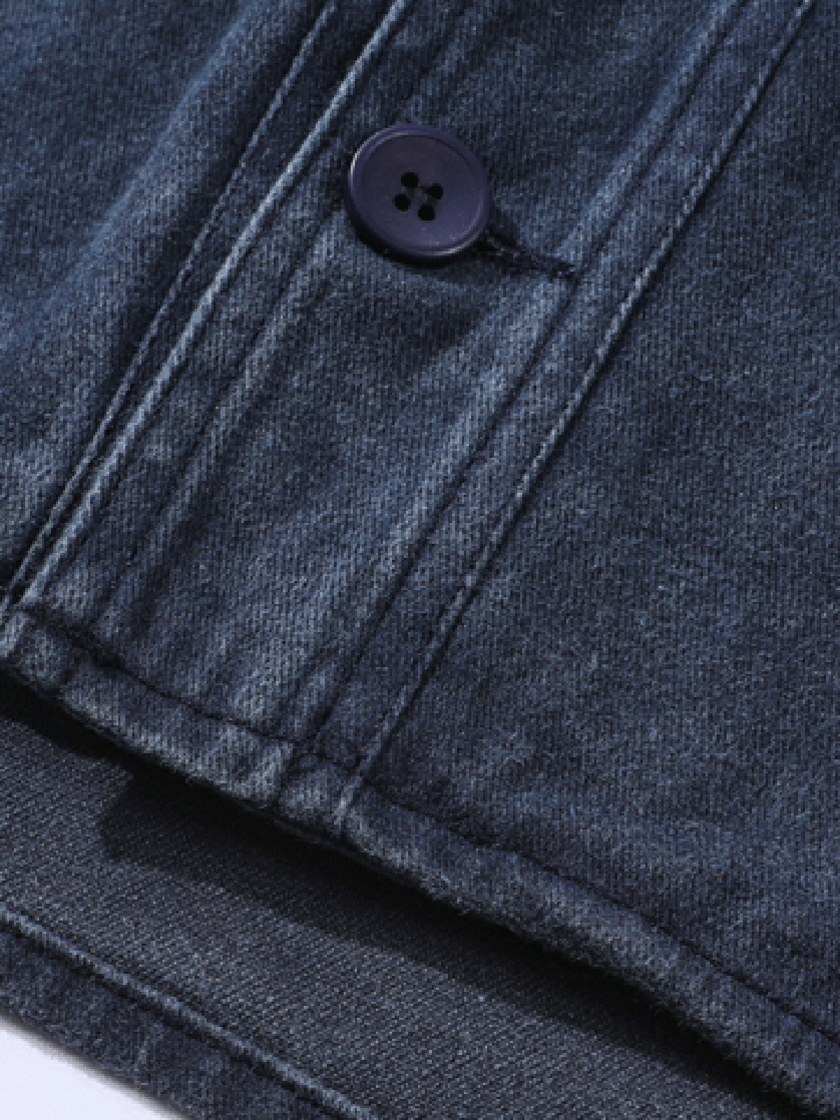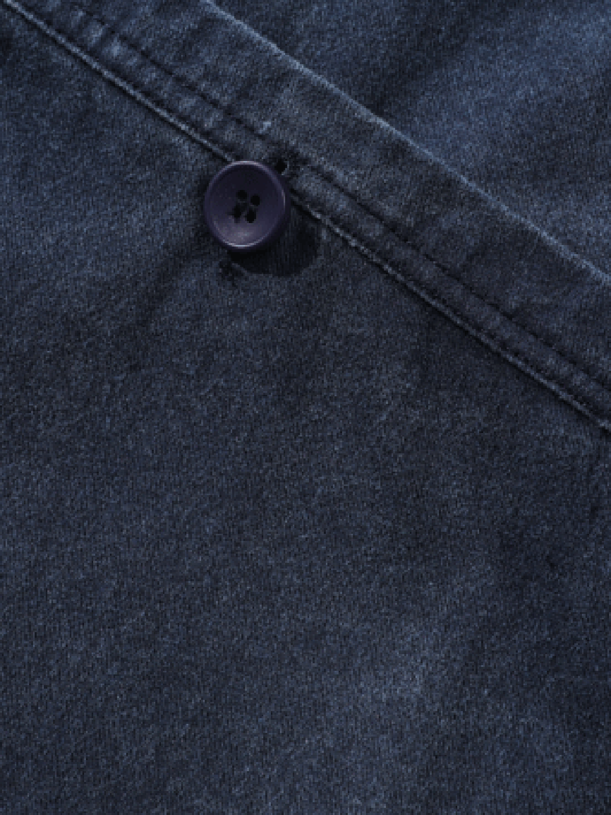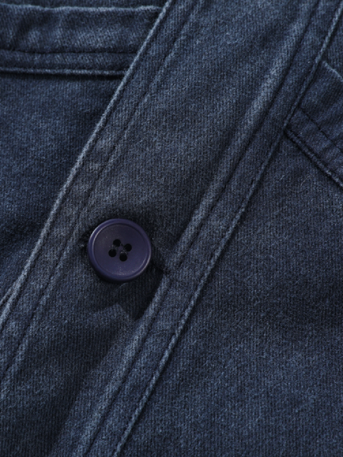 このジャケットは、80%コットンと20%モダールの混紡素材を使用し、柔らかくしなやかな肌触りと高い耐久性を兼ね備えています。ウォッシュ加工とブルー染め技法により、ナチュラルながらも力強いヴィンテージ感が表現され、Vネックがシンプルなスタイルを引き立てます。ボタン付きフロントは着脱しやすく、ルーズなシルエットは単体での着用はもちろん、インナーとのレイヤードスタイルにも最適です。シンプルながらも、ストリートや作業服テイストにも合わせやすい万能なデザインで、どんなシーンでも快適に着こなせます。