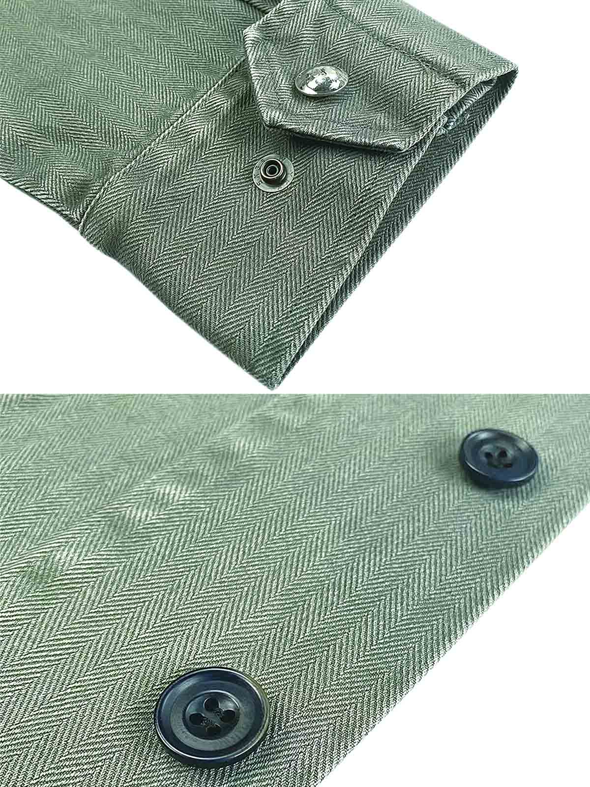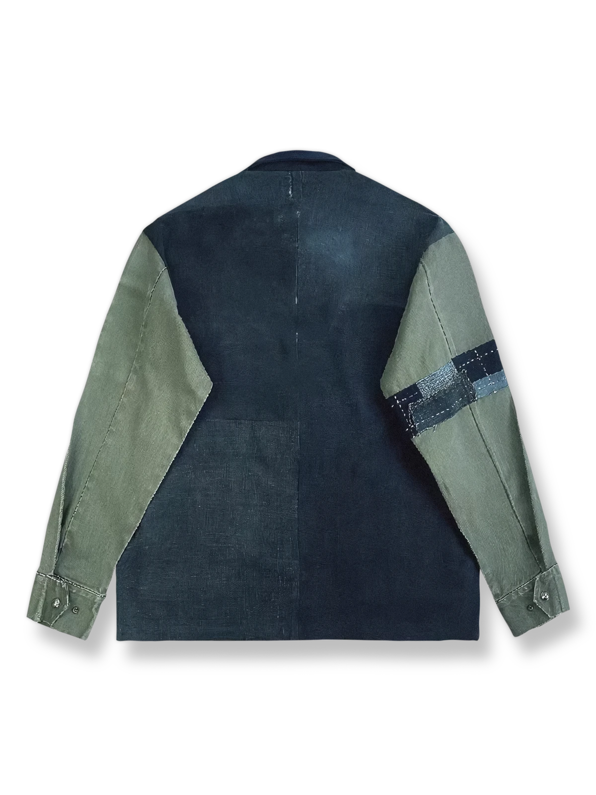 このジャケットは、軍事ワークウェアの実用的な精神を取り入れ、日本の伝統的な藍染め技術と刺し子刺繍工芸を融合させています。藍染めは数百年の歴史を持つ染色技法で、独特の青色調と自然なテクスチャで価値を見出されています。刺し子刺繍は日本の伝統的な刺繍技法で、しばしば生地の耐久性を高めるために使用され、衣服に装飾を施します。