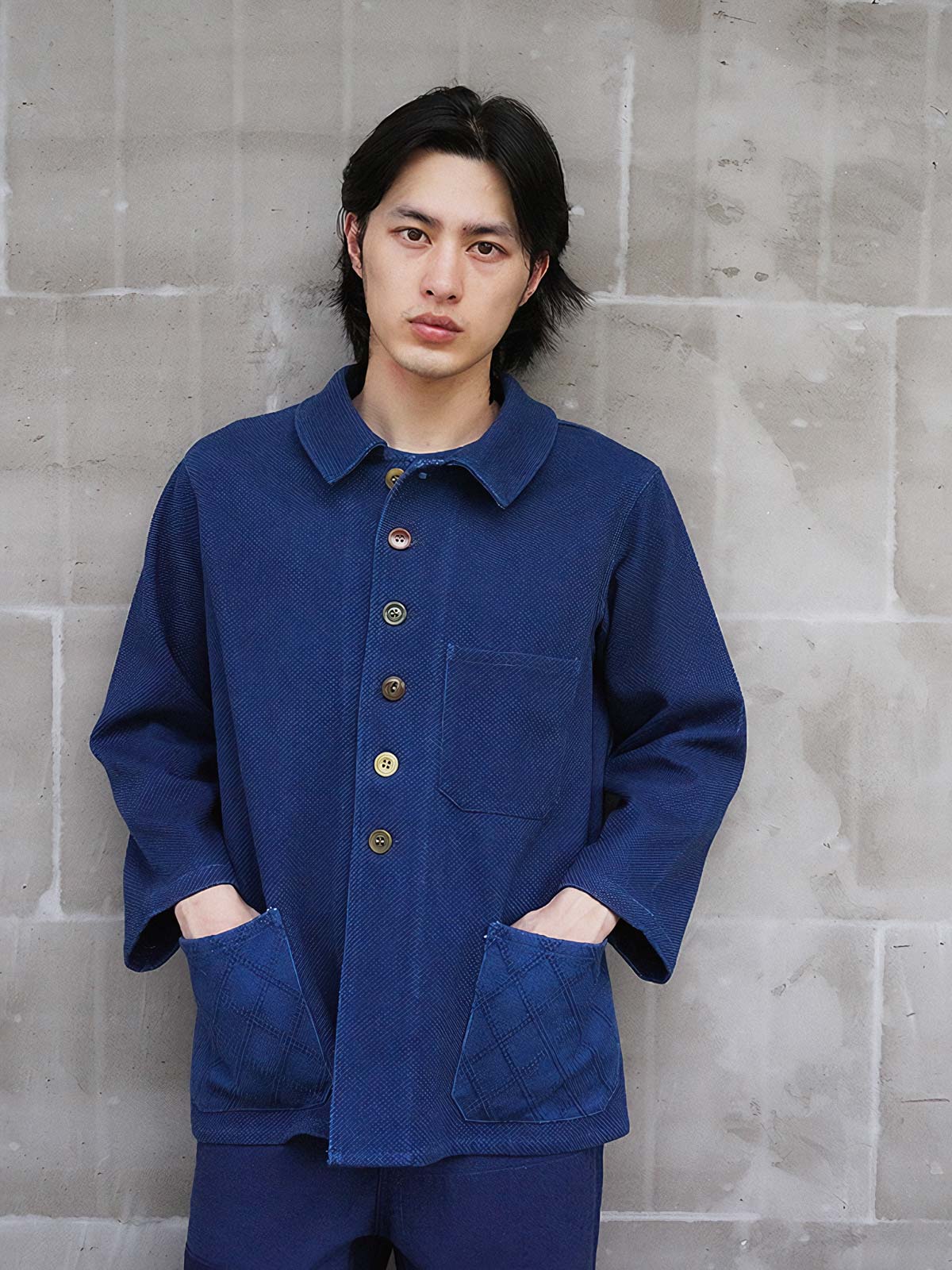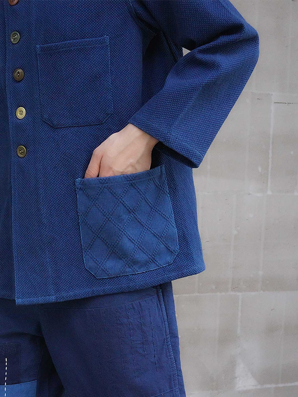このジャケットは、フランスの労働者の制服「ブルー・ド・トラヴァイユ」に着想を得たデザインです。19世紀から20世紀初頭にかけての手工業者やアーティスト向けに開発された耐久性と実用性を兼ね備えた服装の伝統を受け継ぎます。伝統的な植物染料を用いた染色方法は、製品にユニークな色合いを与えるだけでなく、環境に優しい製造姿勢と歴史的な衣服製造法への敬意を示しています。時間と共に色合いが深まり、独自の風合いを増していくでしょう。