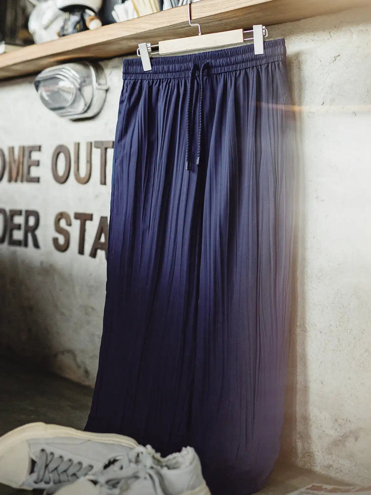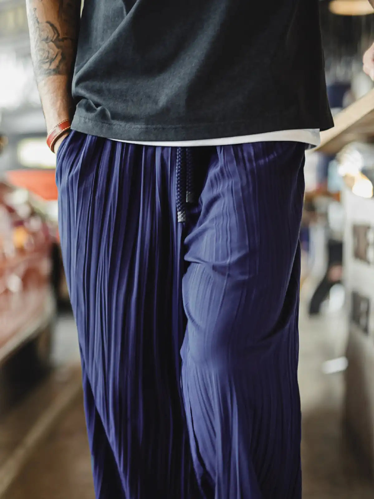 120g/m²の超軽量ポリエステル製プリーツ素材を使用し、足を動かすたびに水面のように揺れる美しいテクスチャーを実現。ドローコード付きの伸縮ウエストと、微テーパードのシルエットがラクな履き心地を保ちつつも野暮ったく見せず、両サイドのシームポケットと片側のバックポケットが日常の小物をスマートに収納します。Zazen Pantsの名の通り座禅やヨガにも適しつつ、ルームウェアからタウンユースまで幅広く活躍する一着です。
