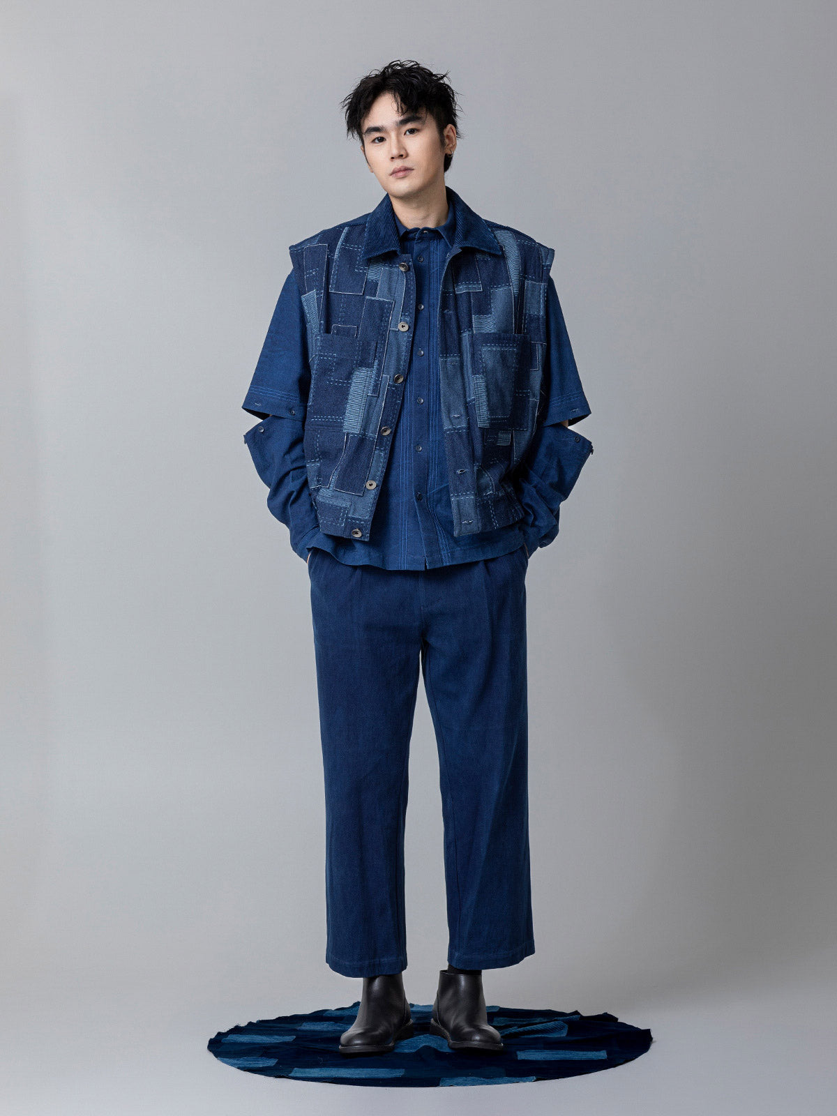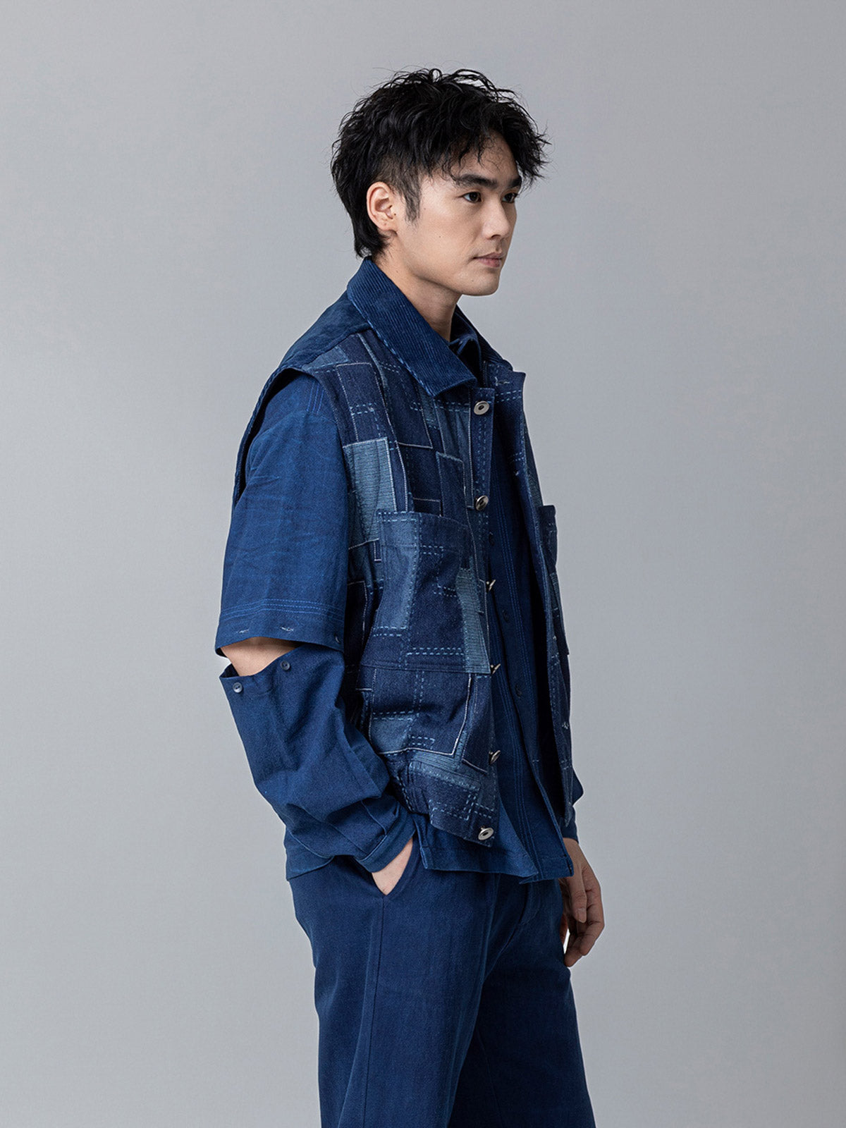 このベストは、パッチワークアートにインスピレーションを得て、伝統的な手工芸技術と現代美学を見事に組み合わせています。素材の再利用と伝統工芸への尊重を象徴するパッチワークデザインが特徴です。コーデュロイ素材は、そのレトロな魅力と共に、20世紀の流行を現代に再現しています。