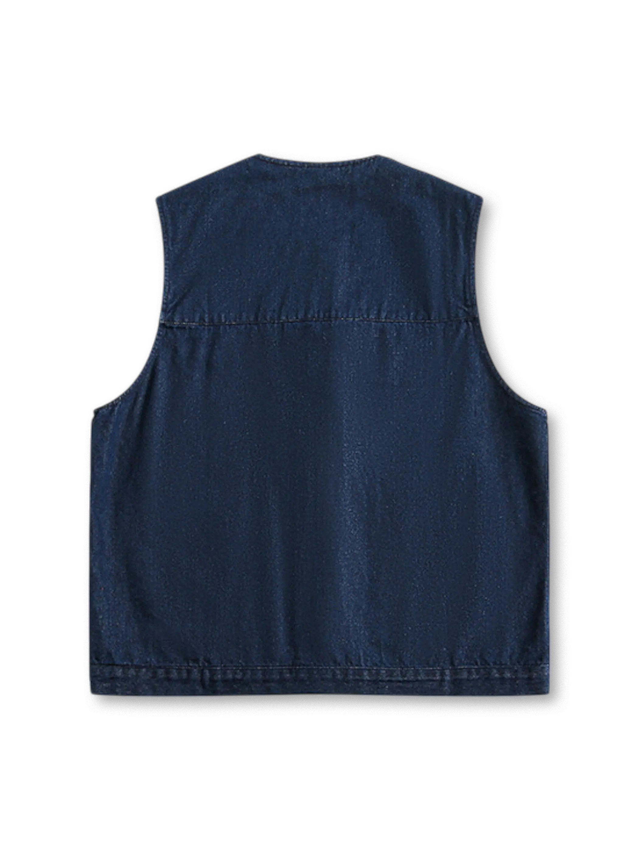 植物染めの深い色合いと実用的な4ポケットを備えた、100%コットン無袖ワークベスト。