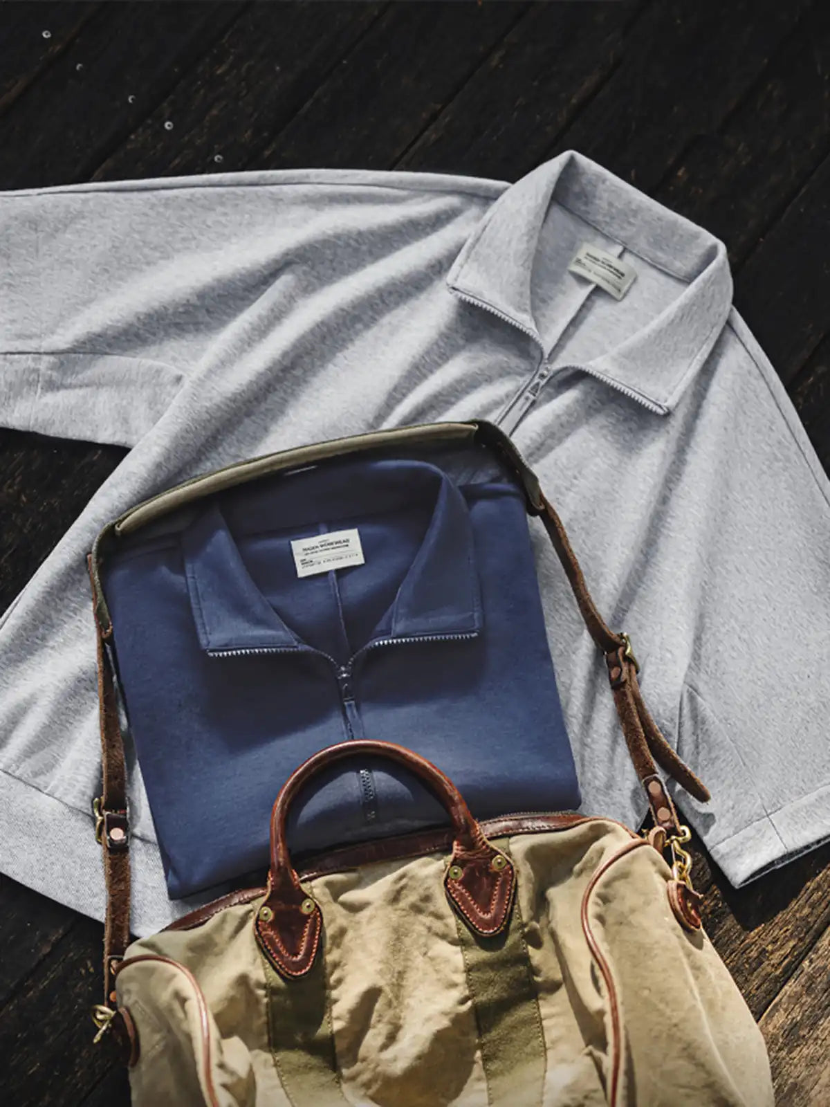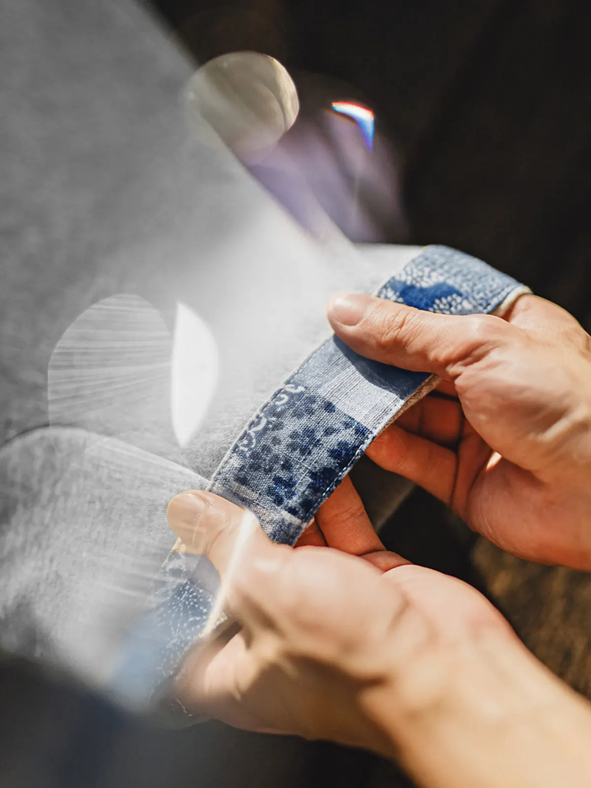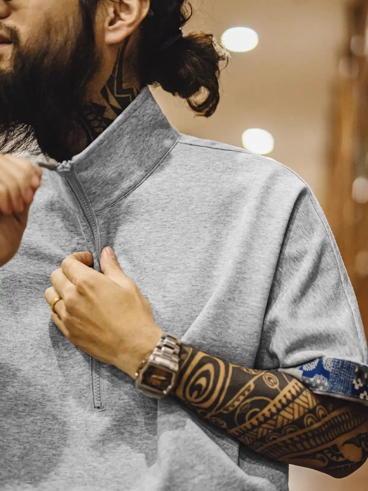 BORO風の古布パターンをデジタルプリントで再現し、袖口の裏側に縫い込むことで、折り返すとヴィンテージ感あふれるアクセントを演出。折り返さずに着用すればシンプルなソリッドデザインとして、よりクリーンな印象に。ハーフジップ仕様の襟元がカジュアルながらも洗練された雰囲気を醸し出し、ゆったりとしたシルエットが動きやすくストレスフリーな着心地を実現します。