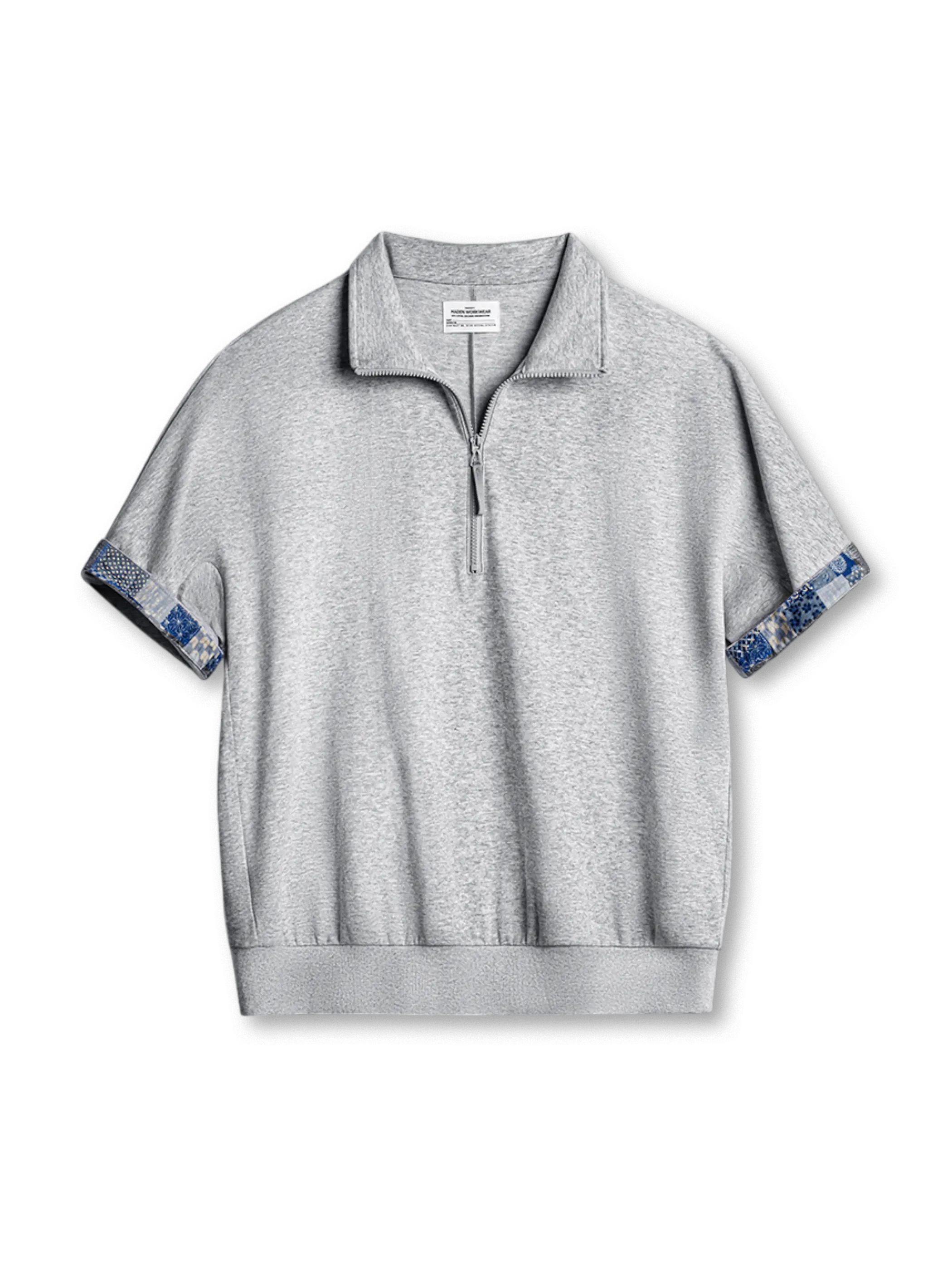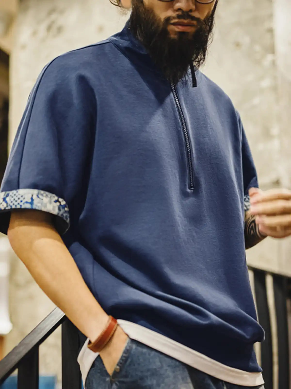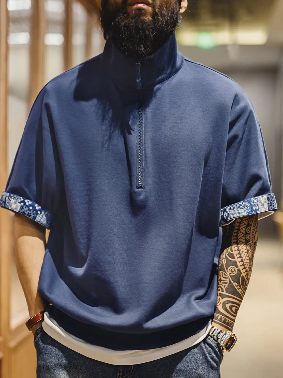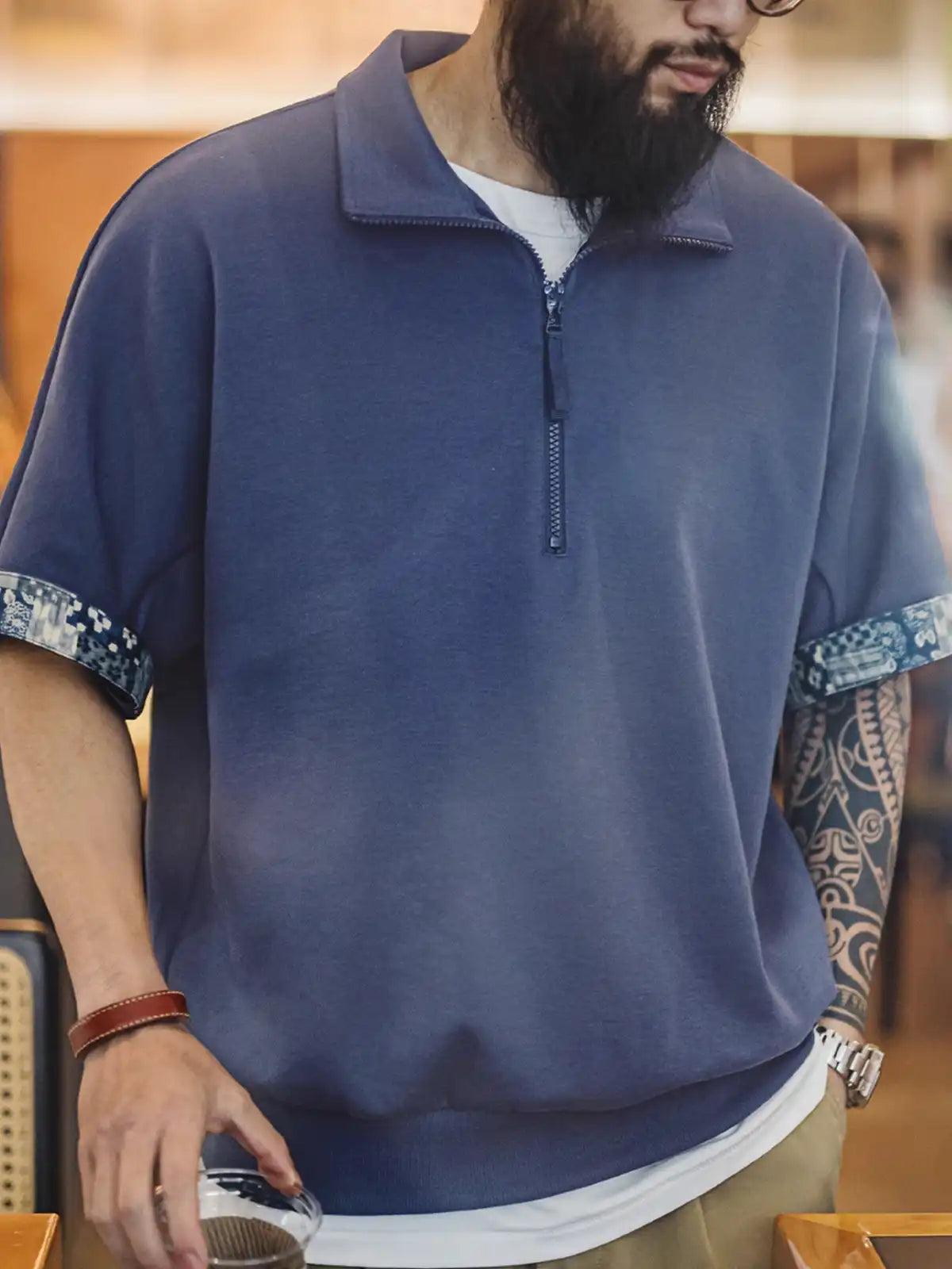 袖口裏に江戸時代の藍染古布モチーフをあしらい、A面・B面で異なるスタイルが楽しめるルーズシルエットの半開襟ポロシャツ。