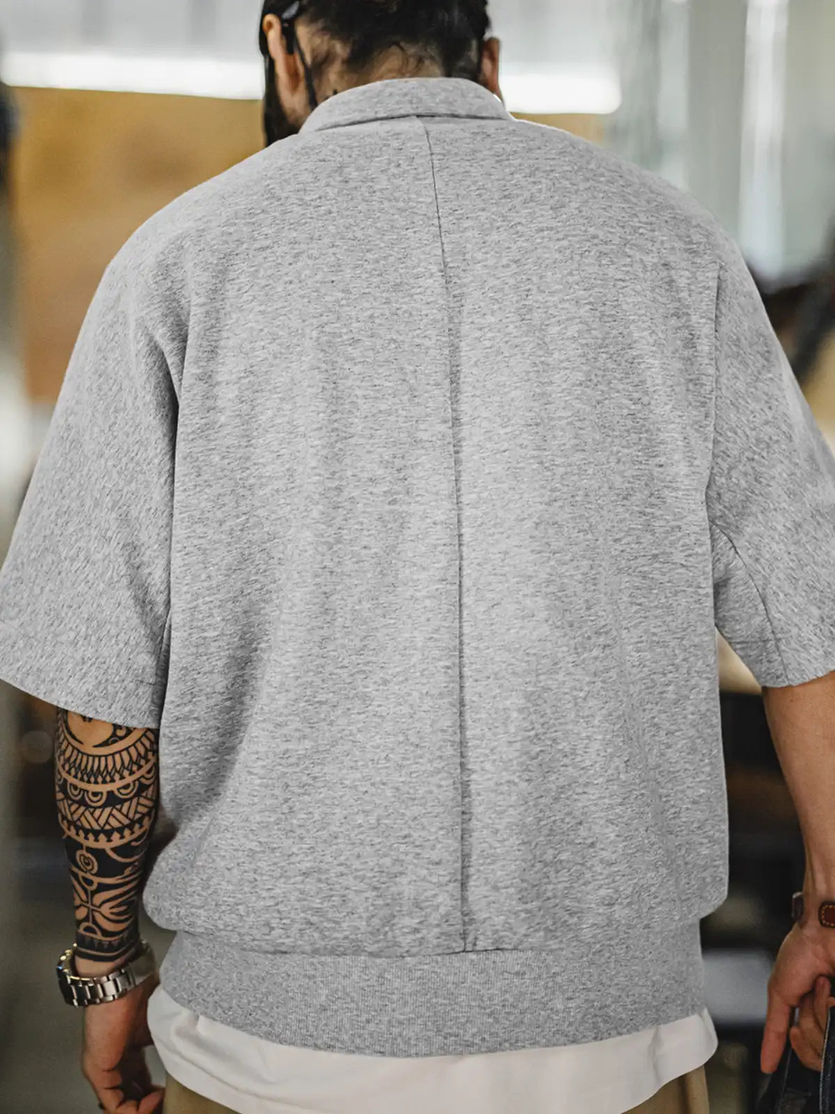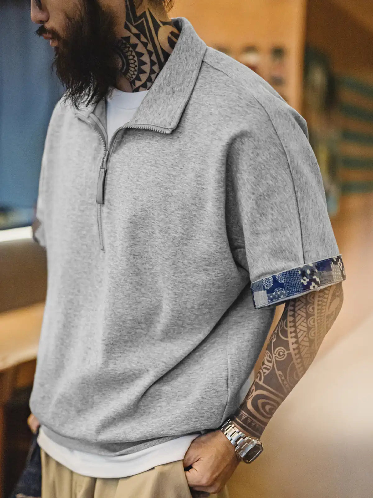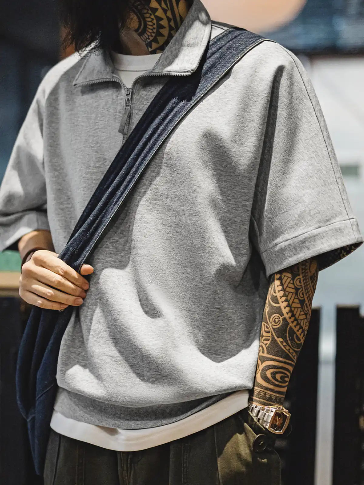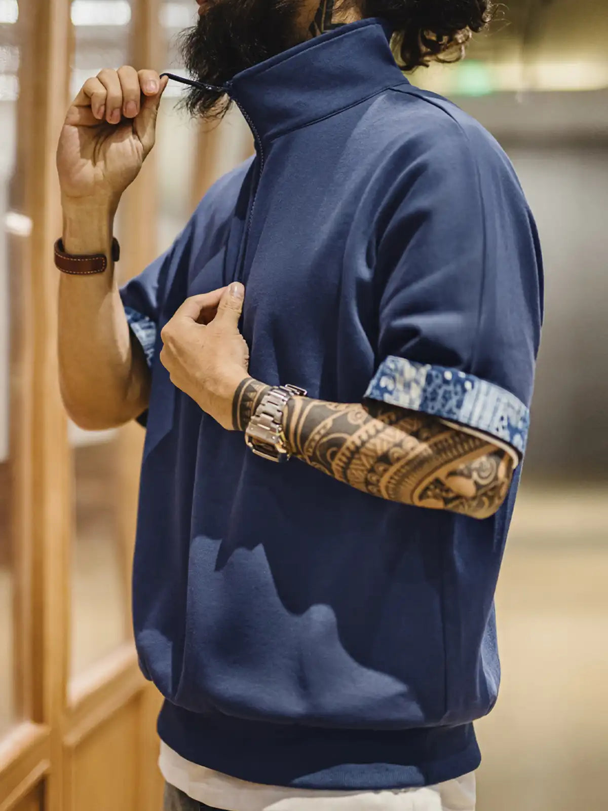 袖口裏に江戸時代の藍染古布モチーフをあしらい、A面・B面で異なるスタイルが楽しめるルーズシルエットの半開襟ポロシャツ。
