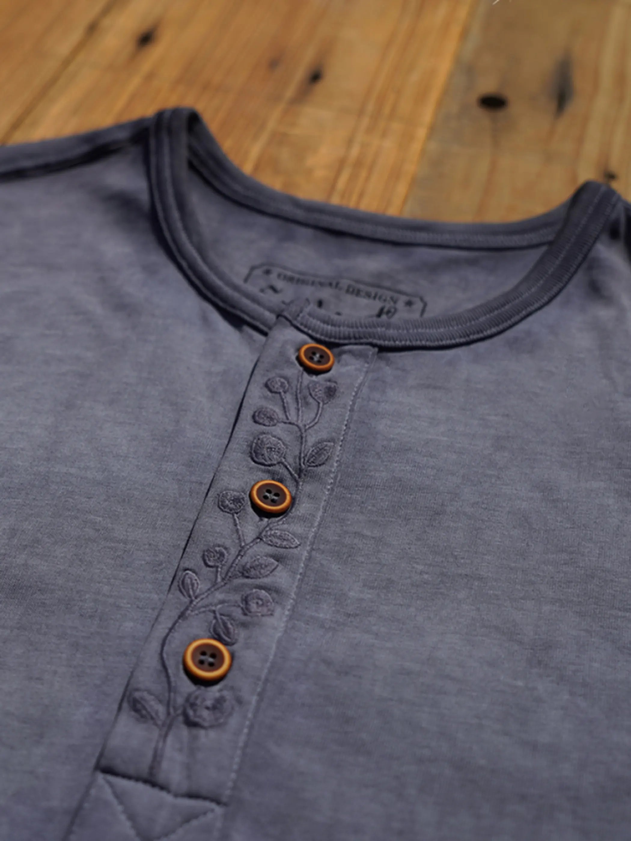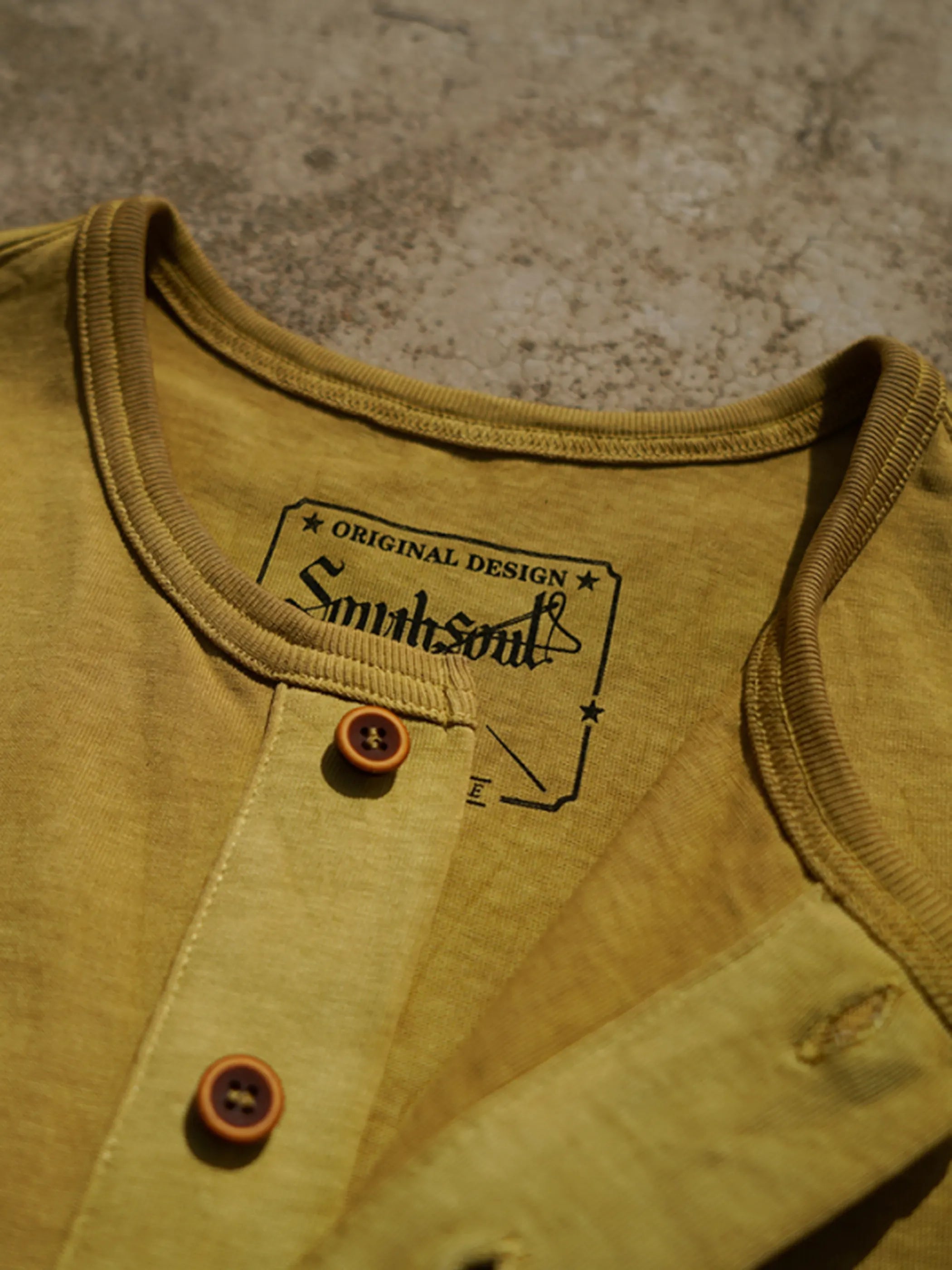 五倍子と薬用矾だけを用いた伝統的な草木染めと、洋葱皮染めを組み合わせた二種のナチュラルプロセスが織りなすヴィンテージ調の色味は、一枚ずつ異なる味わいを醸し出し、260gの双糸コットンが持つしっかりとした肉感と耐久性を備えます。襟元は二針三線の補強ステッチ+綿糸刺繍で型崩れを防ぎつつ、ボタン配列の控えめなアクセントがミリタリーやワークスタイルとも高い親和性を持ち、シンプルなデニムやチノと合わせるだけで完成するコーディネートの自由度が魅力です。