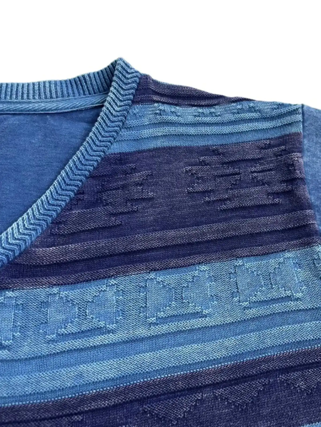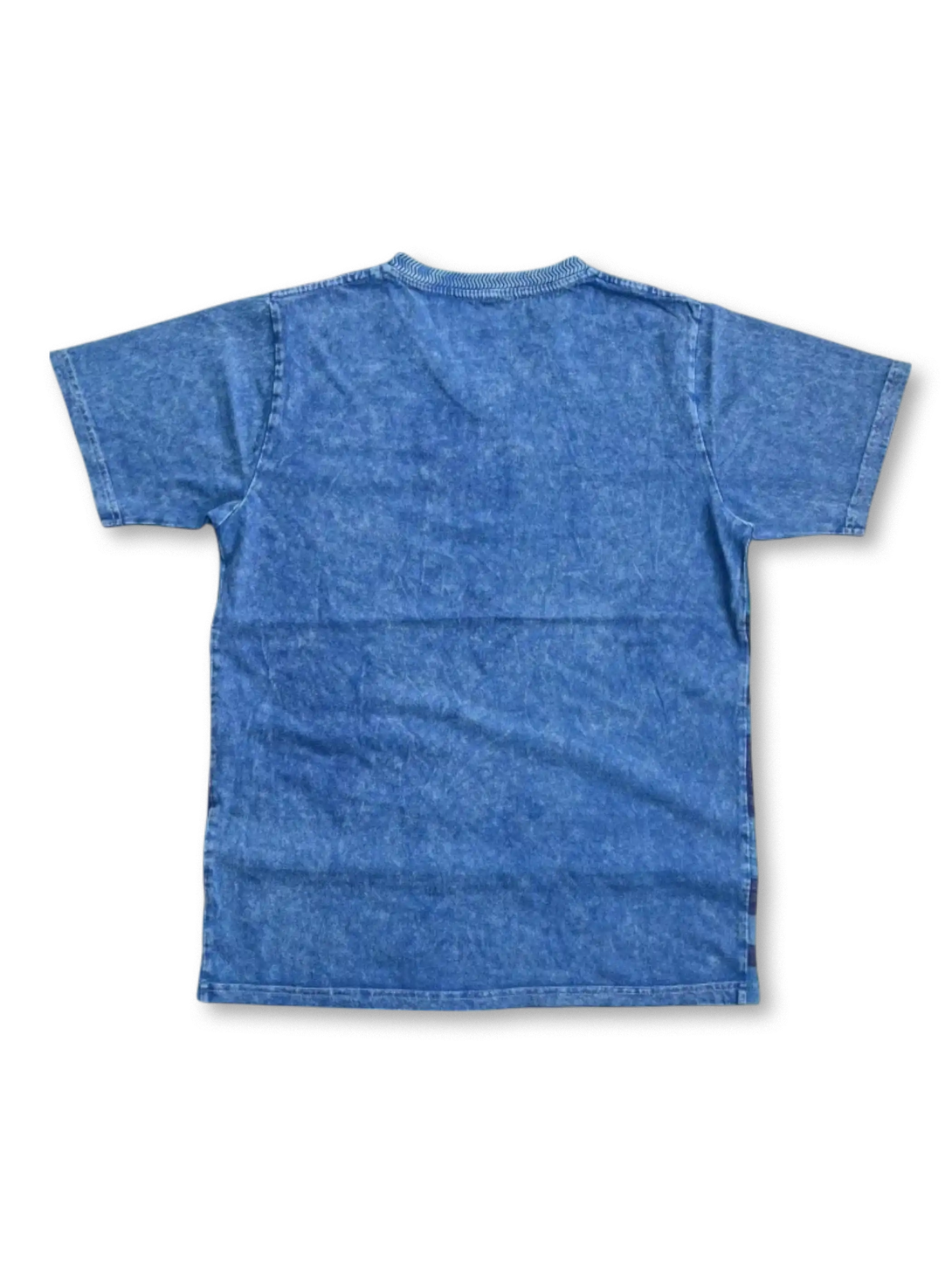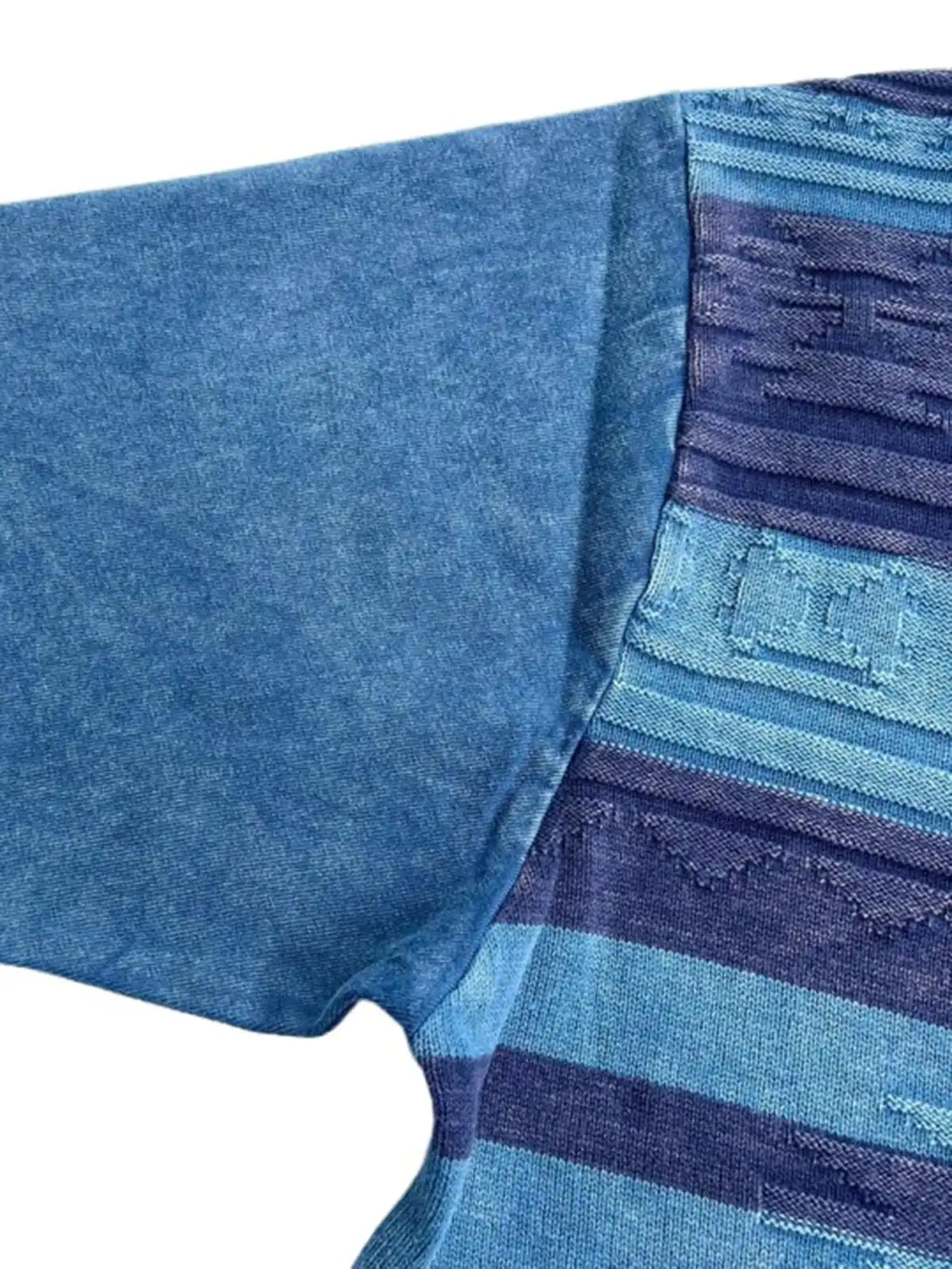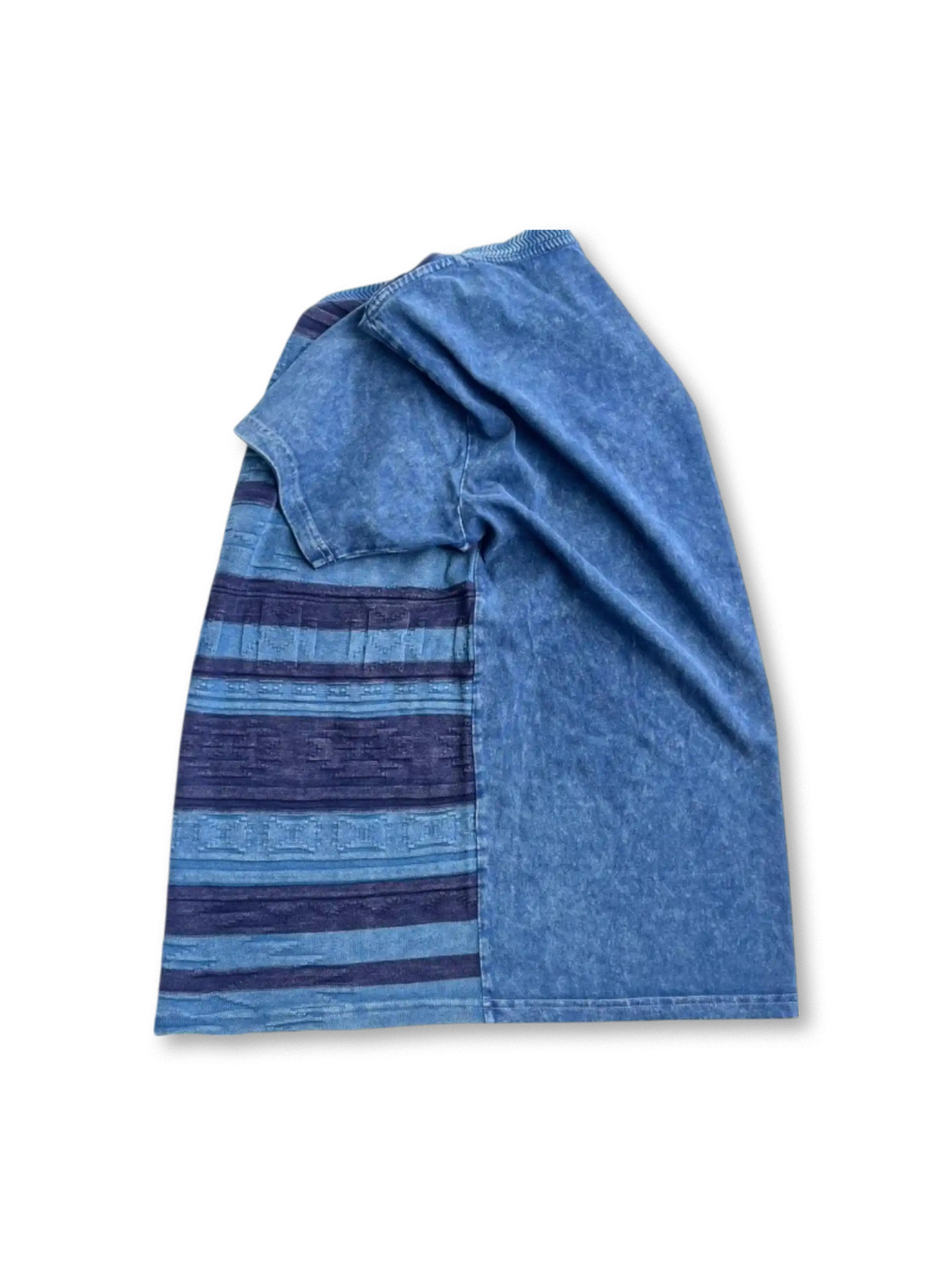 草木染めとスノーフレイクストライプが共鳴する、パッチワークデザインのヴィンテージVネックTシャツ。