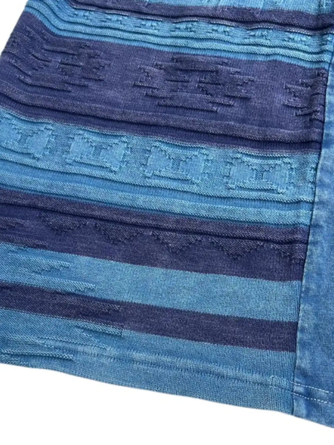 1950年代のアメリカ製ハンドダイシャツに着想を得た草木染め技法と雪柄風ストライプをパッチワークで融合し、時代を超えた風合いと独自の表情を実現。コットン100%の素材は洗い込むほどに柔らかくなり、Vネックのすっきりとした開きがレイヤードにも単品着にも映える。デニムやチノと合わせてノスタルジックかつ洗練されたサマースタイルをお楽しみください。