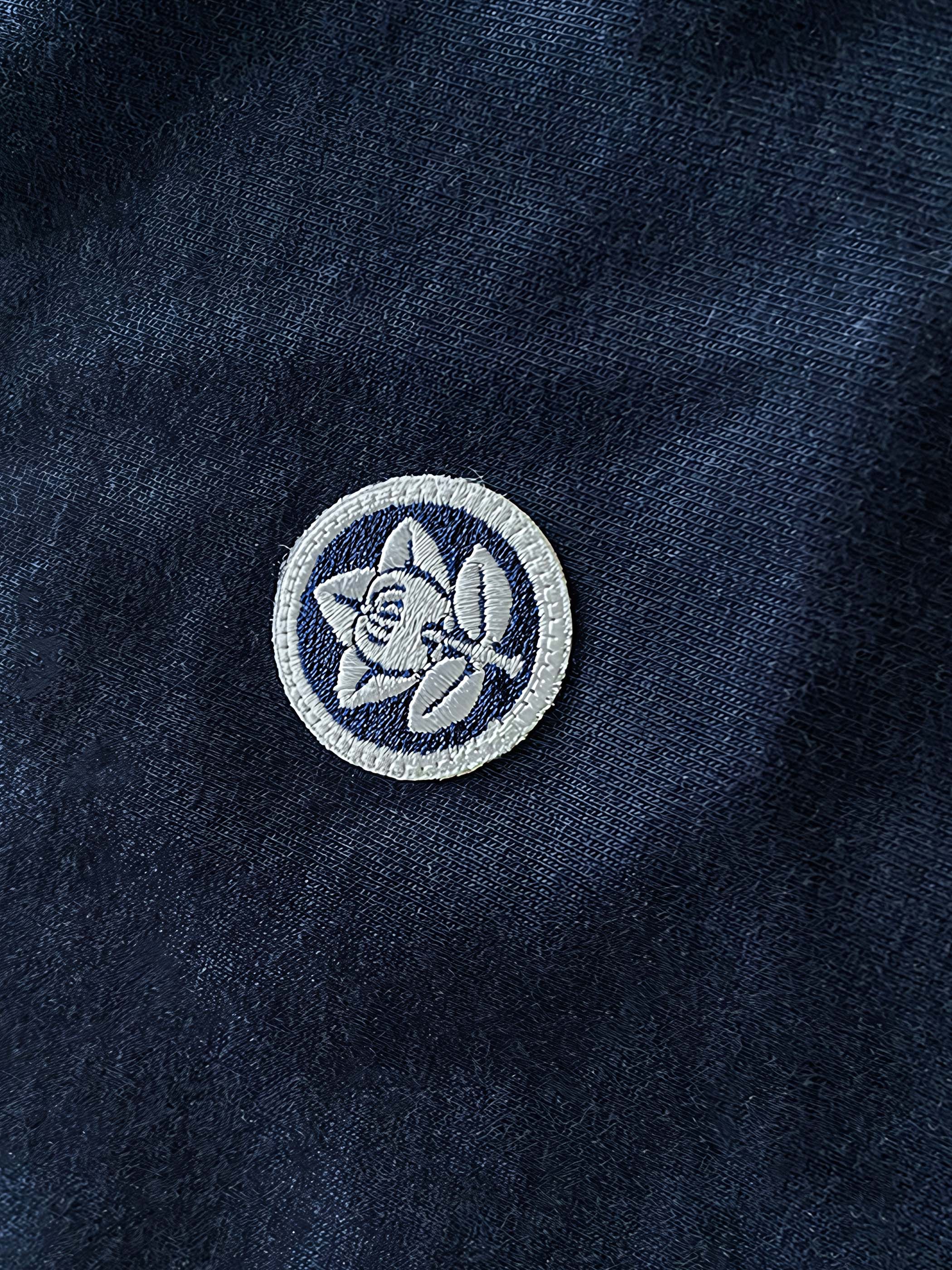 首元のリブは、さりげないメリハリを与え、ディテールにこだわりが感じられます。左胸元には「オレンジブロッサム」の刺繍バッジがあり、存在感があります。