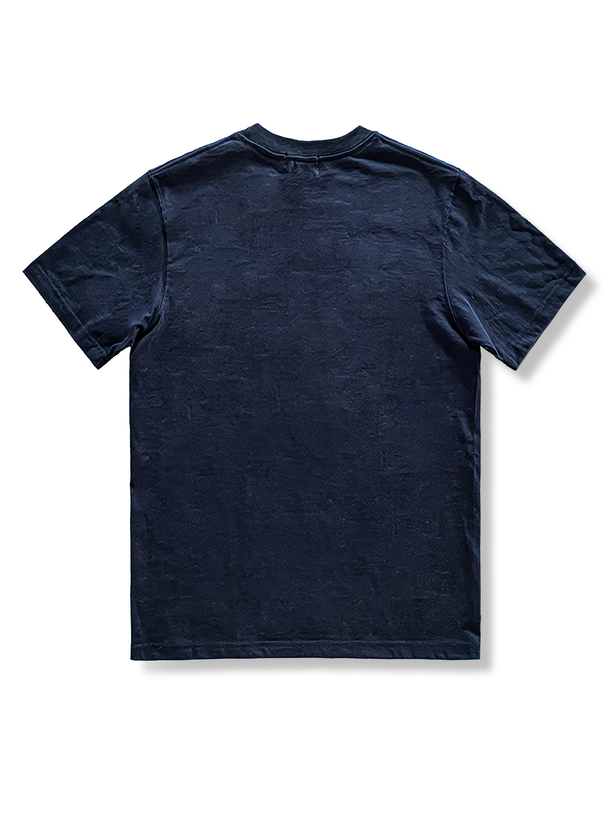藍染め技法と植物染料を使用した素材を使用し、ウォッシュやブリーチで色差を表現しています。首元のリブがさりげないアクセントを加え、左胸元の「オレンジブロッサム」刺繍バッジが新鮮な印象を与える個性的なデザインです。