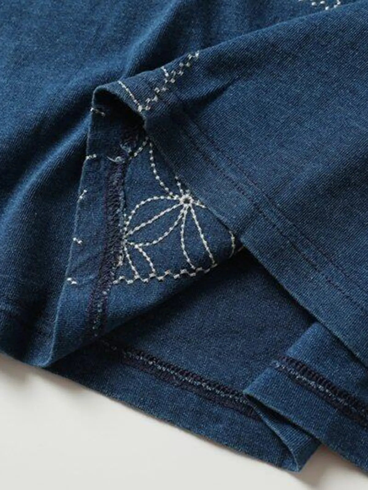 伝統的な藍染め技術と幾何学的な刺繍が融合した、新感覚のカジュアルTシャツ。