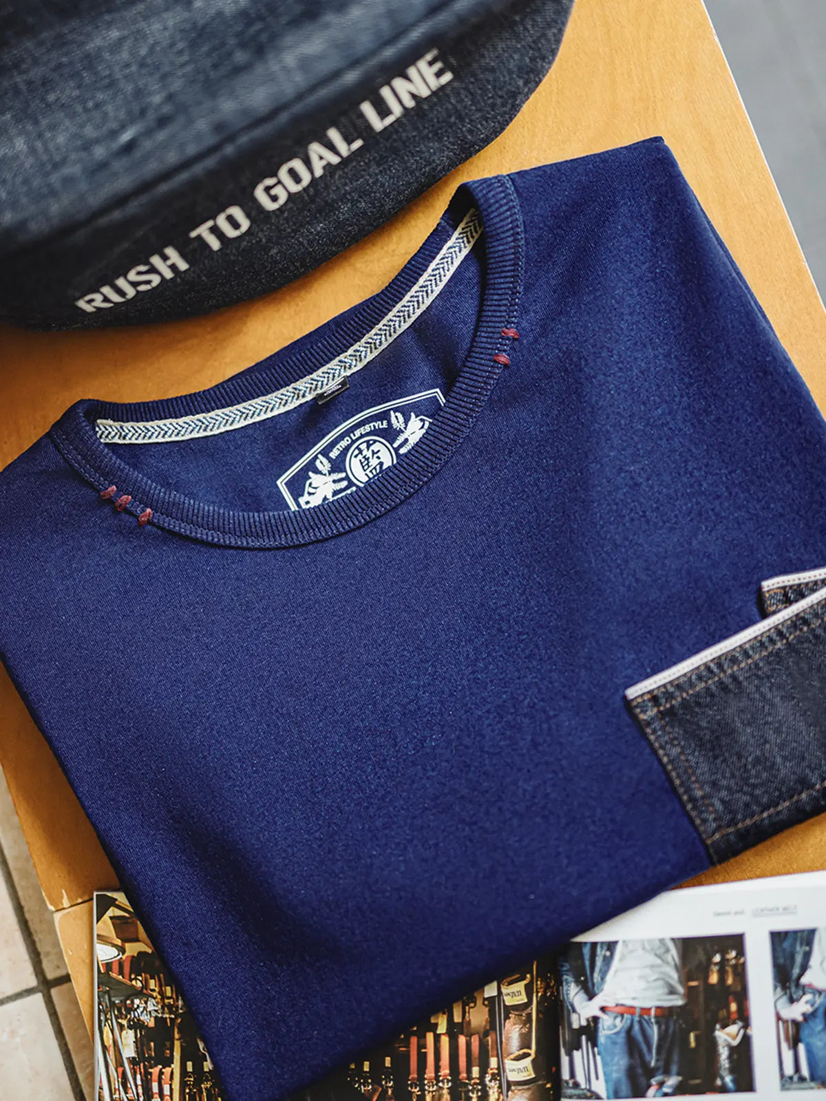 伝統的な藍染めとデニムポケットを組み合わせた、時を刻むヴィンテージ感あふれる220g純綿Tシャツ。