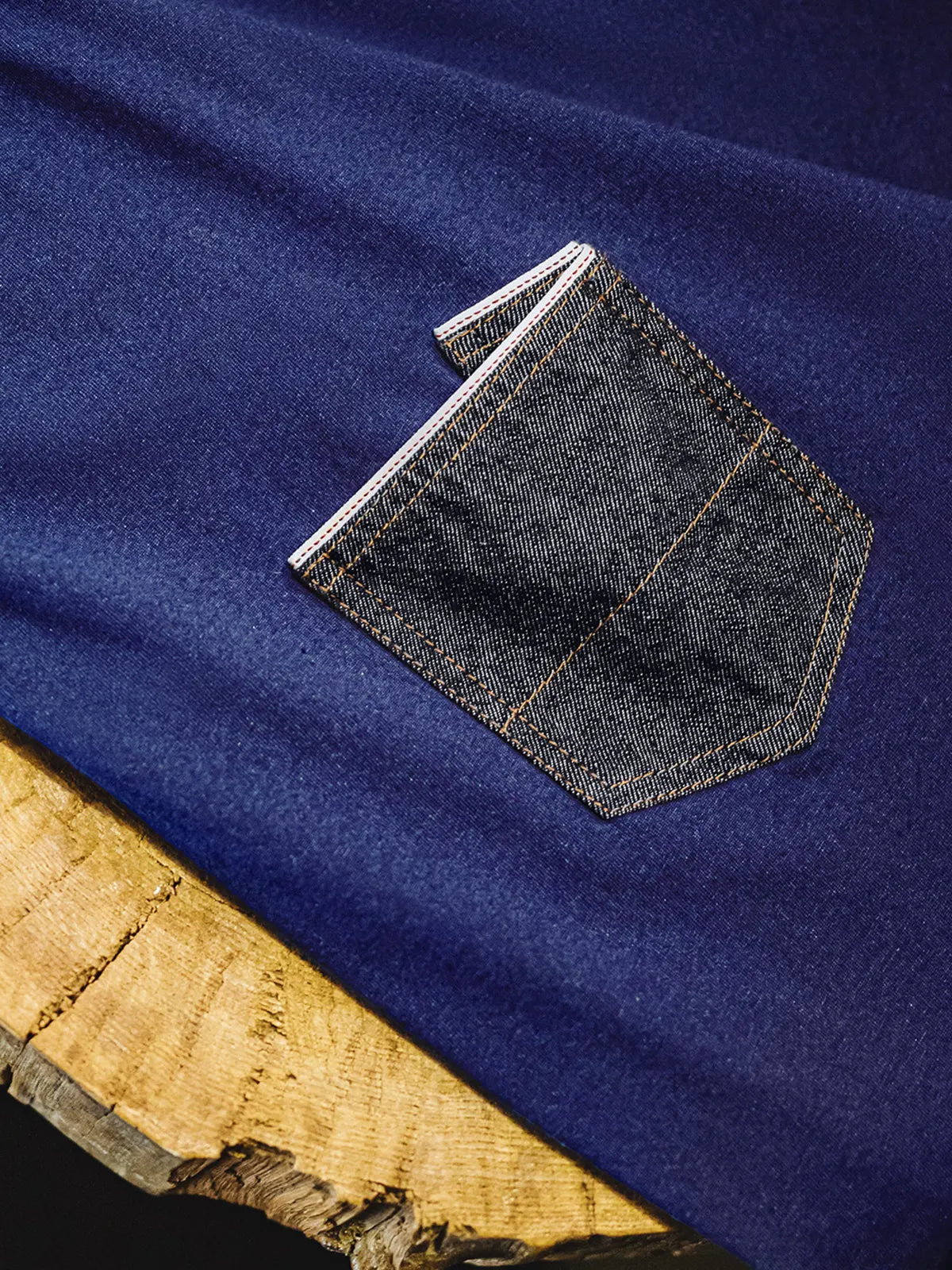 自然発酵させた藍草をベースに石灰・木灰をブレンドした伝統的藍染めが、着るほどに深まる色落ちとあなただけの風合いを生み出し、胸元のデニムポケットに赤耳セルビッジとコントラストステッチを配して耐久性とアクセントを強調し、ワンツーコーデの仕上げにデニムやチノパンと合わせるだけで、究極のインディゴ&デニムプレイヤーズスタイルが完成。
