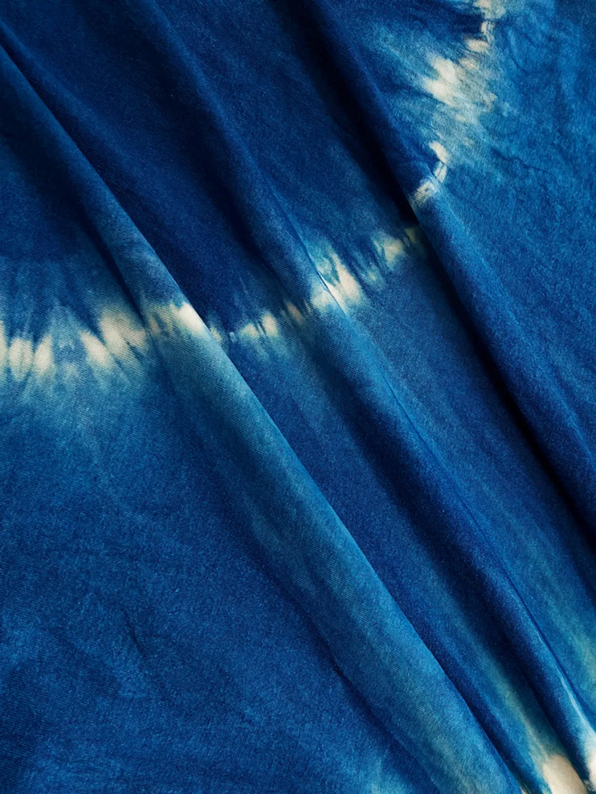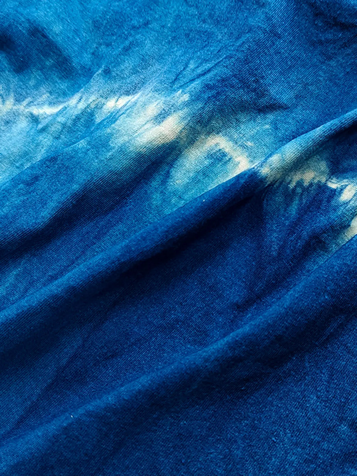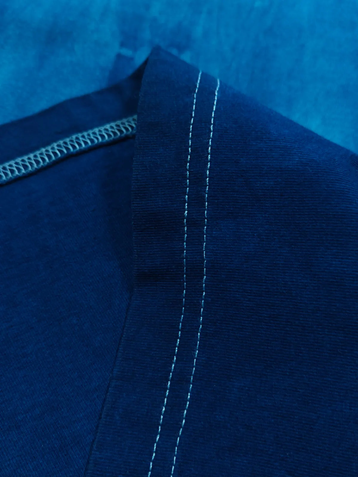 日本の伝統的な植物藍染技術をベースに、熟練の職人が一枚ずつ手作業で折りたたみと吊り染めを行い、斜めのストライプタイダイに奥行きあるグラデーションを表現。250gのヘビーウェイトコットンは洗い込むほどに柔らかく肌に馴染み、手染めならではの深みのあるブルーは着るほどに経年変化を楽しめる。ワイドシルエットの直身ボディはレイヤードにも対応し、デニムやチノなどシンプルなボトムと合わせるだけで、手仕事のぬくもりが感じられる上質なサマーコーディネートが完成。