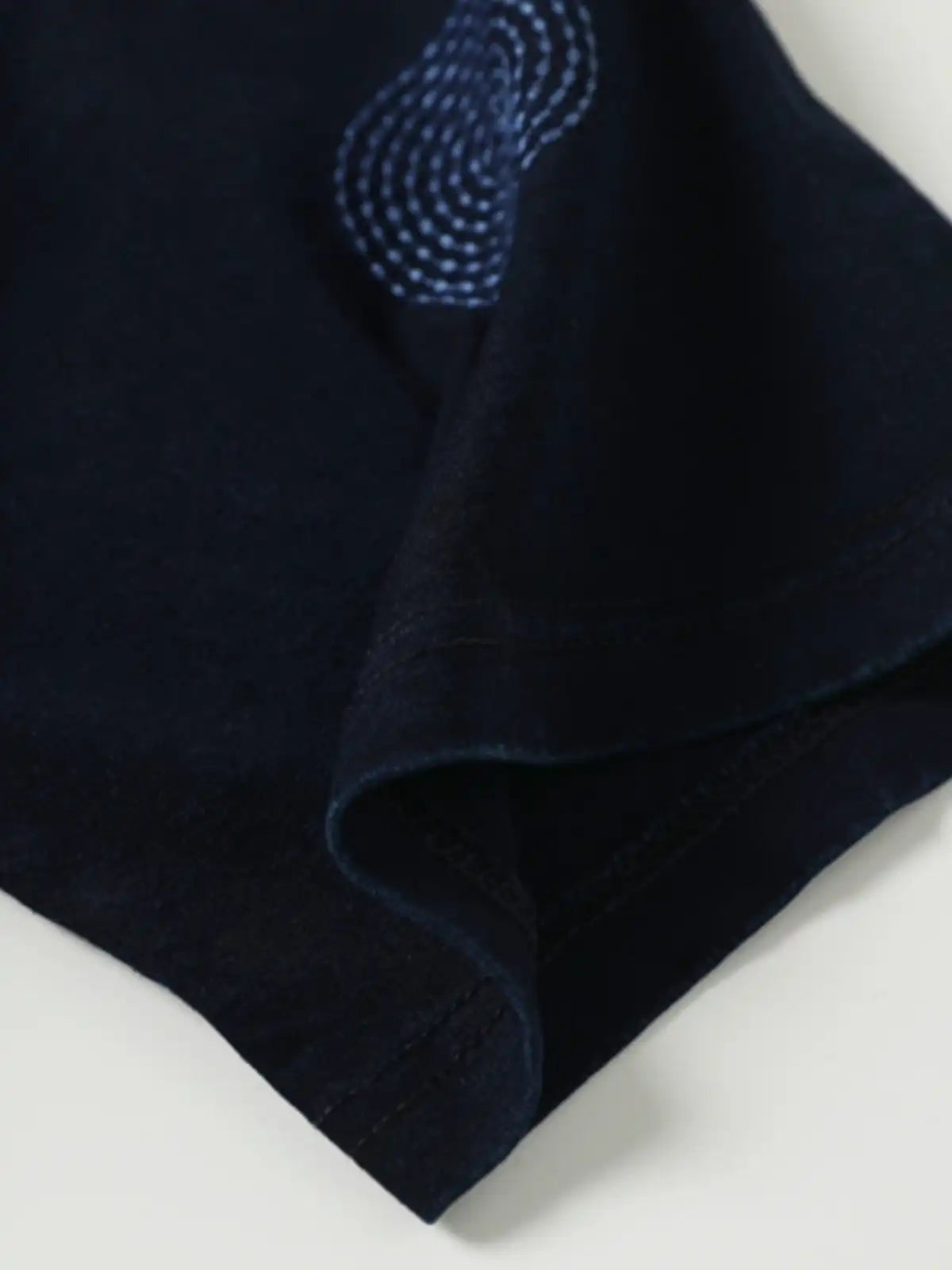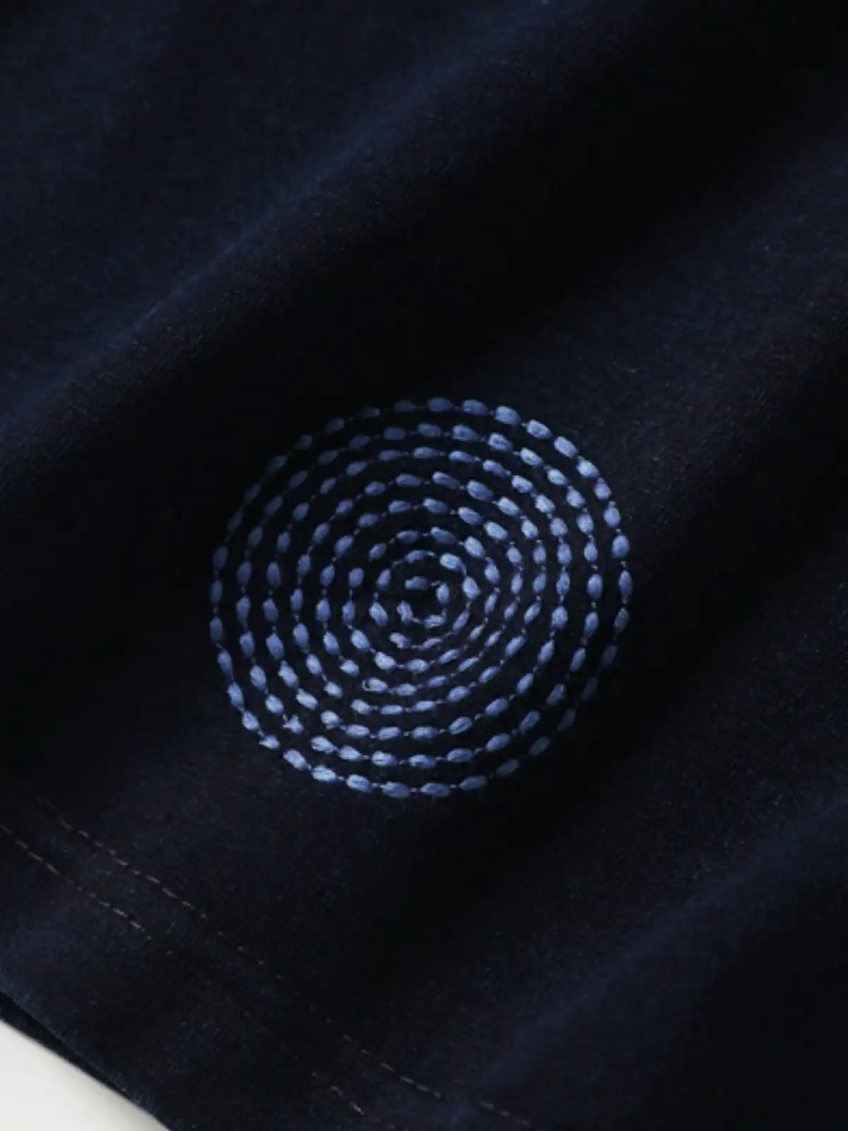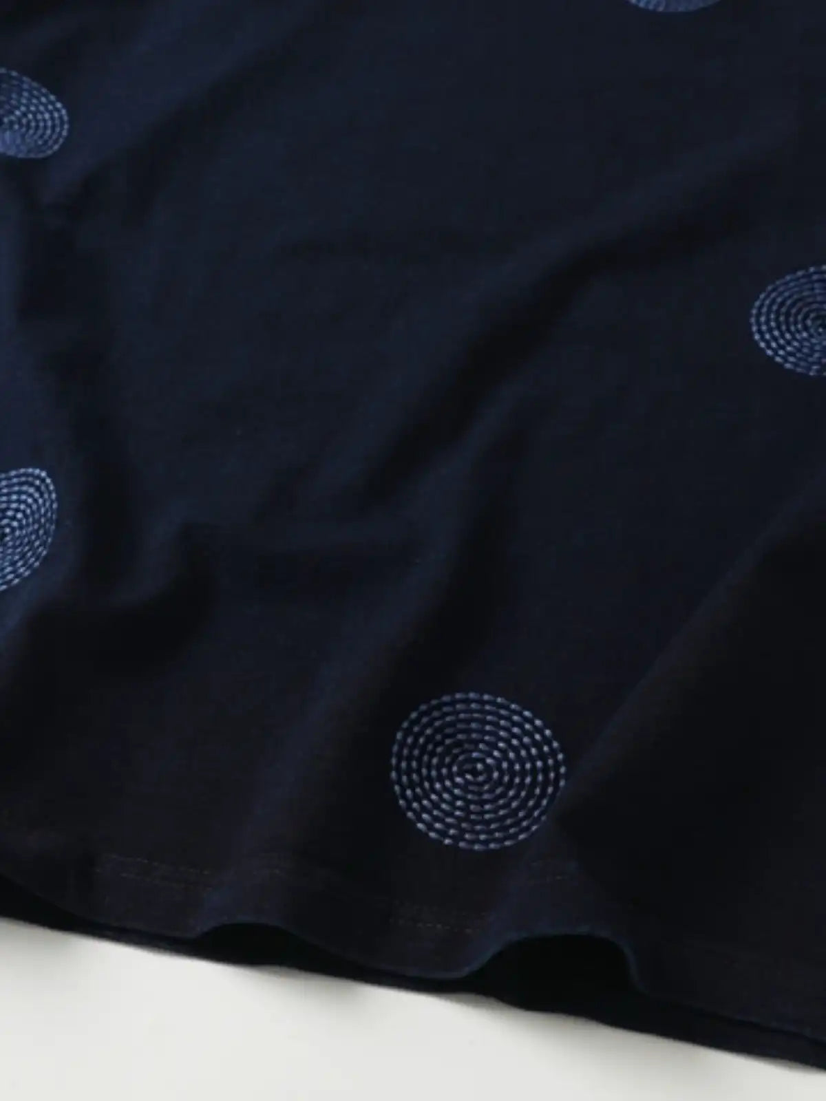 日本の伝統的刺し子技法を用いた円形ステッチが映える、深みある藍染めのカジュアルTシャツ。