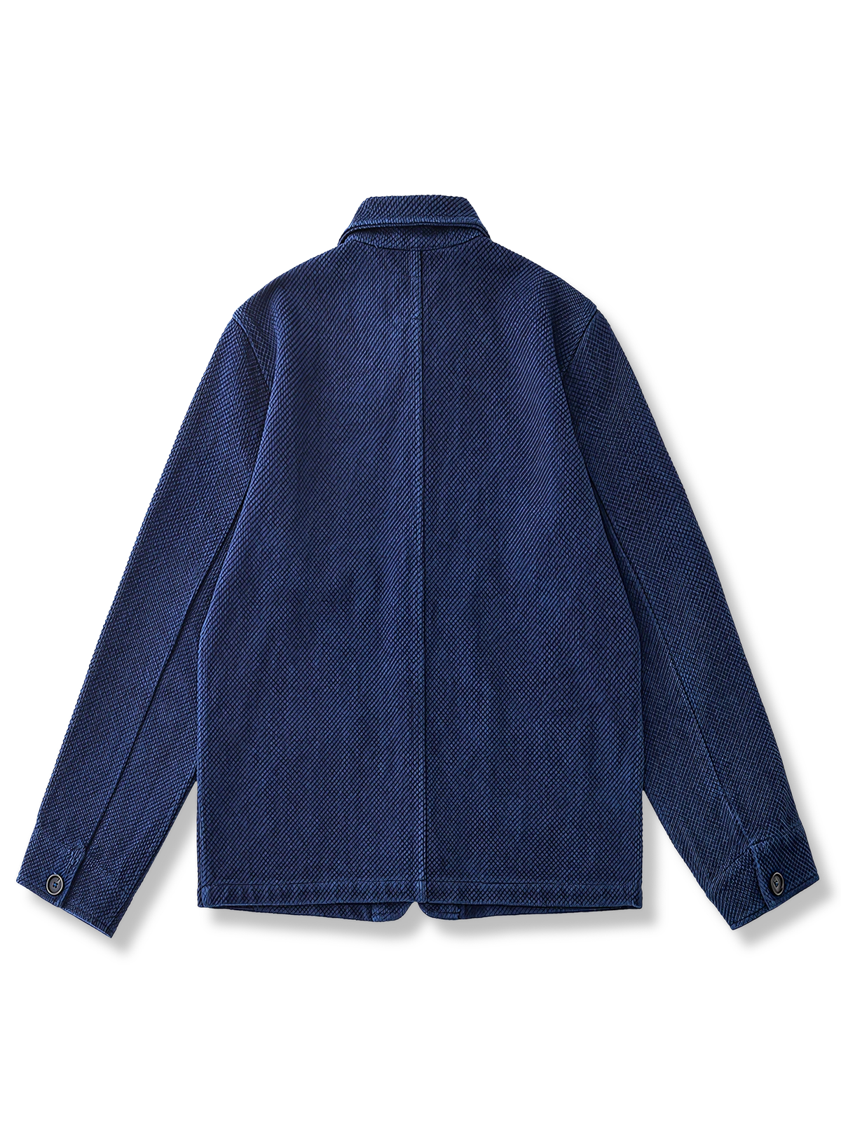 植物の藍染め技法で仕上げられた、落ち着いたインディゴブルーの色味が特徴的なヴィンテージ風フレンチワークジャケット。角襟の形状もフランスのビンテージらしいディテールで、合わせやすさが魅力です。