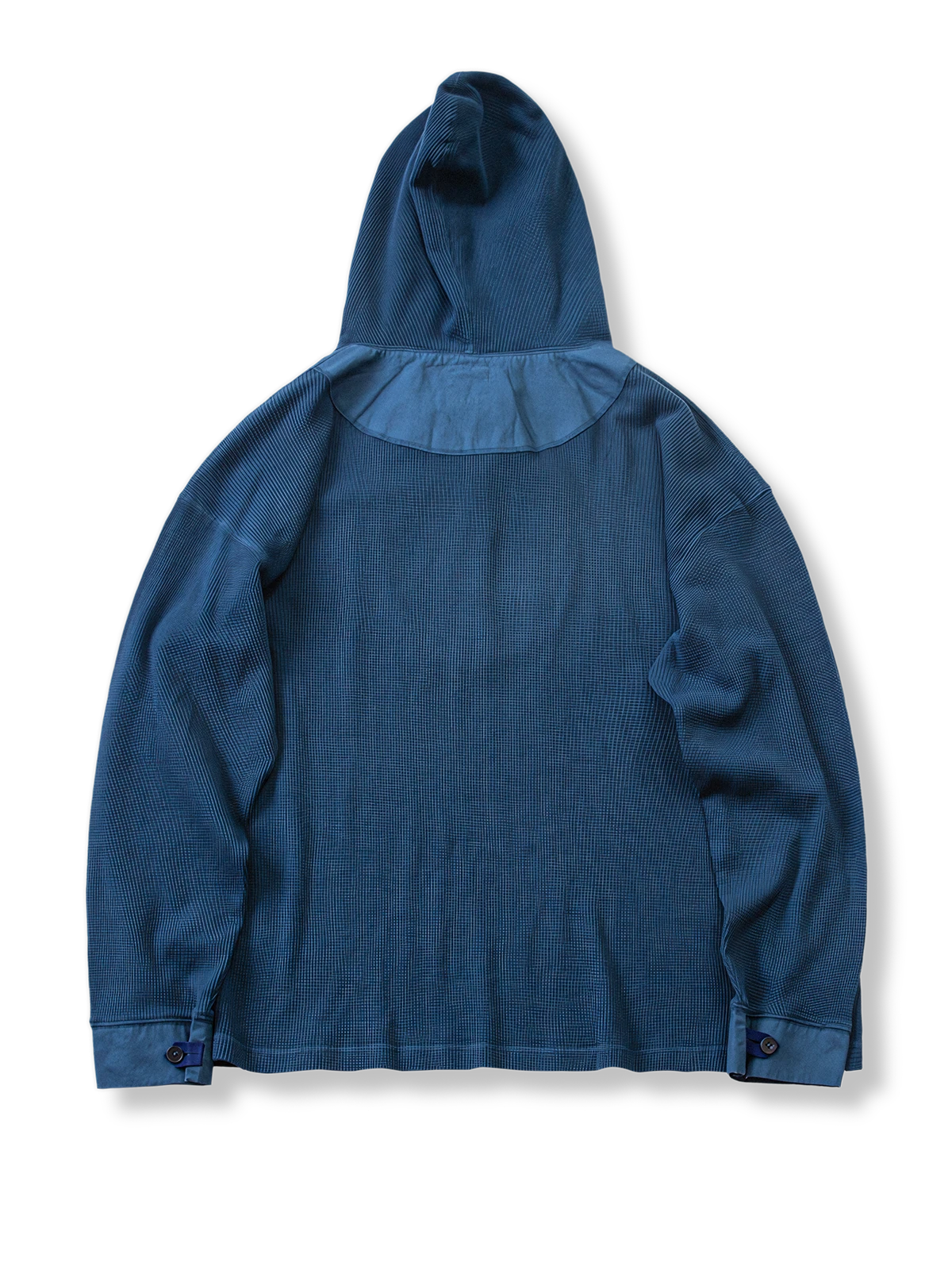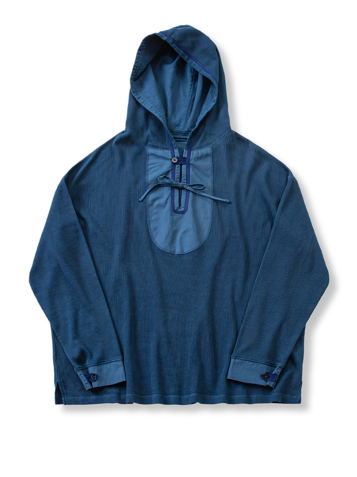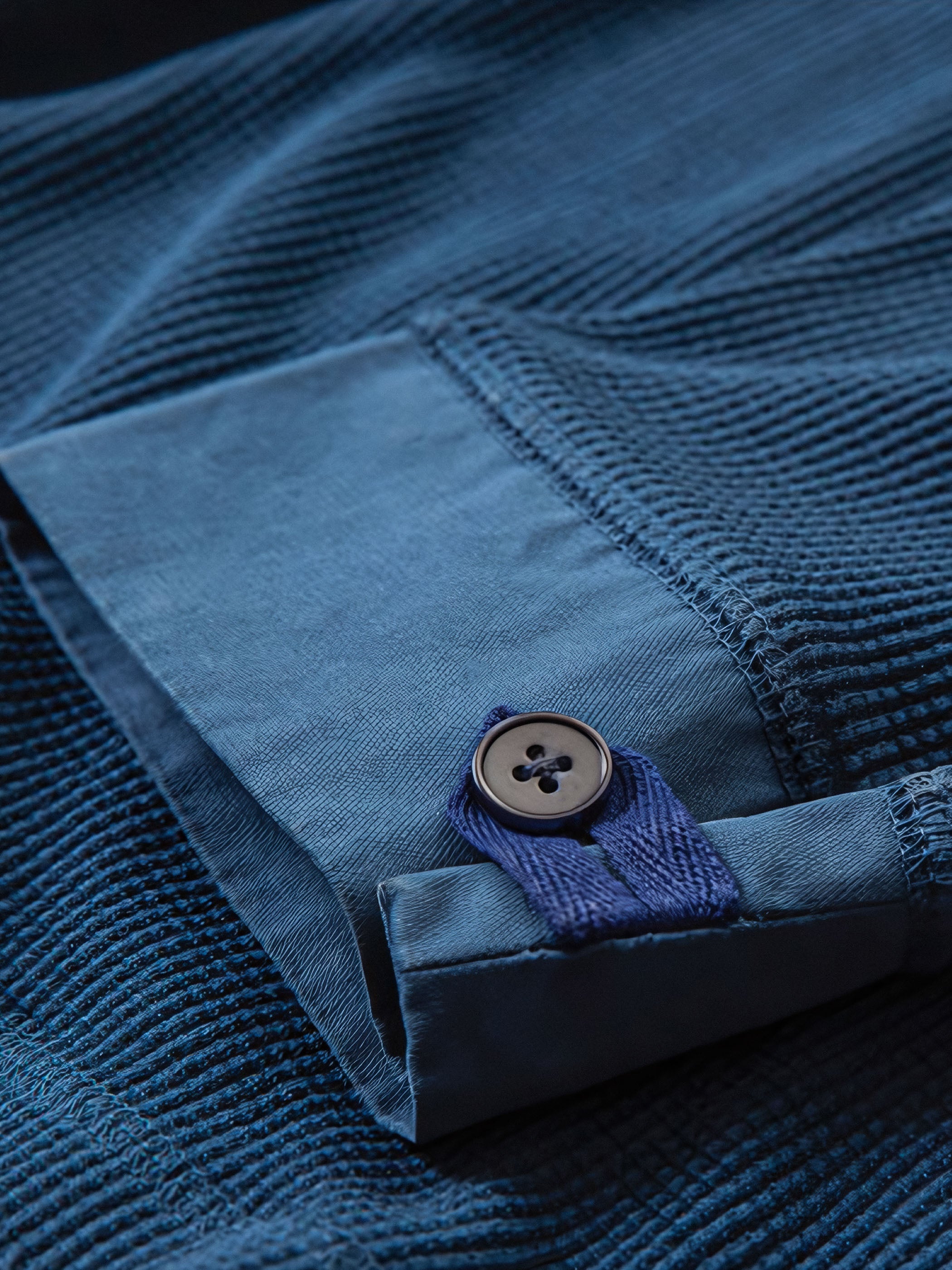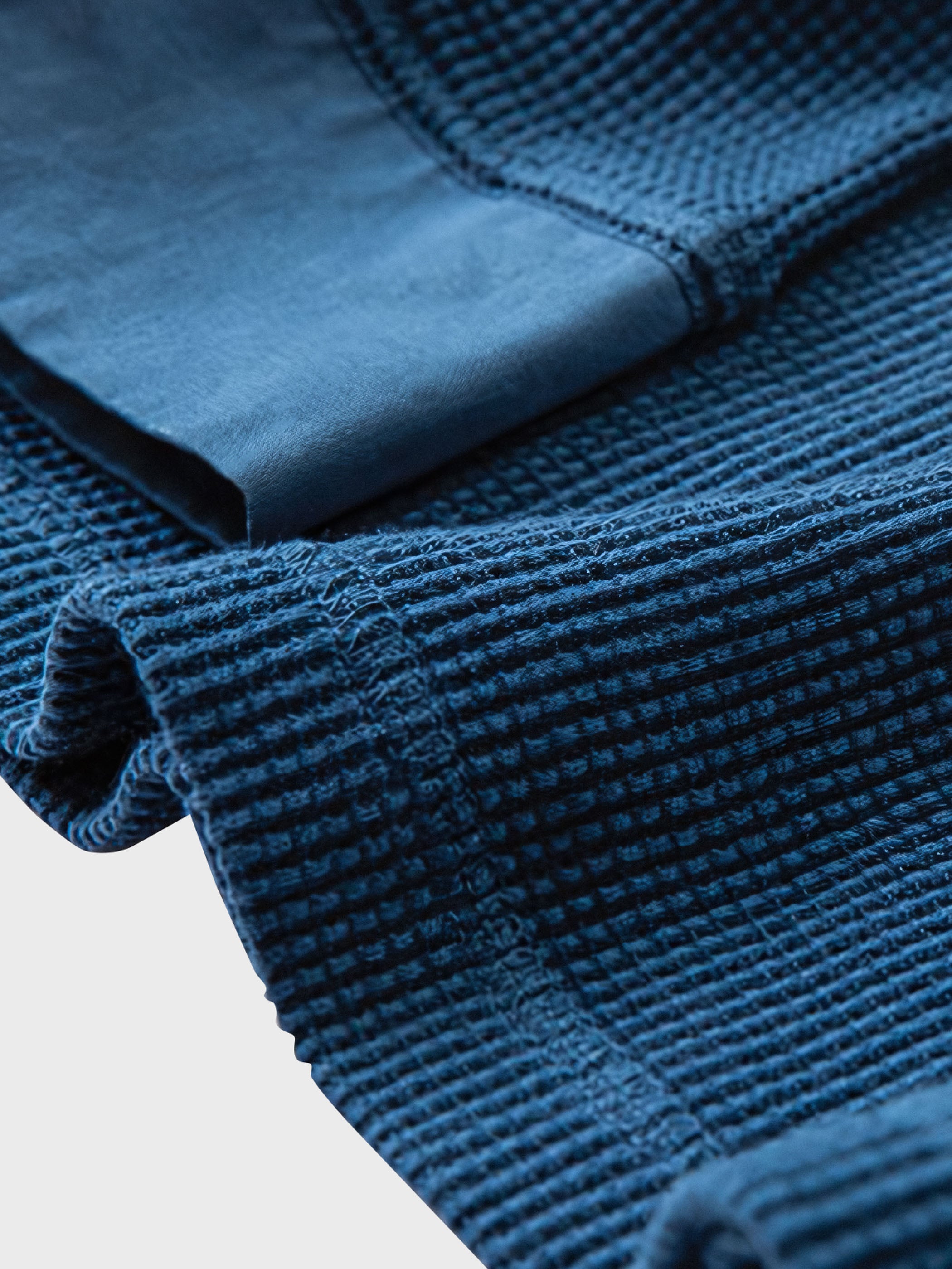 藍染め工芸と植物染料を使用した素材により、ウォッシュやブリーチ加工で色差が表現されたデザインが魅力です。ワッフル織りの凹凸感が特徴で、リラックスした雰囲気を演出します。