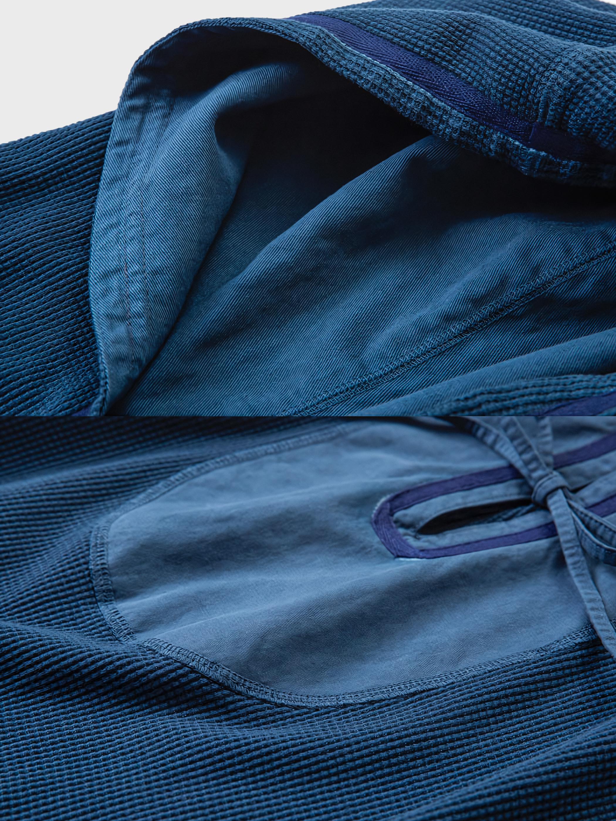 ワッフル織りのコットン素材は吸湿性に優れ、汗をかく季節でもさらっとした着心地が続きます。暑さや湿気を抑えるだけでなく、寒さからも保護する素材です。丈夫で耐久性に優れ、ソフトな肌触りが快適さを提供します。