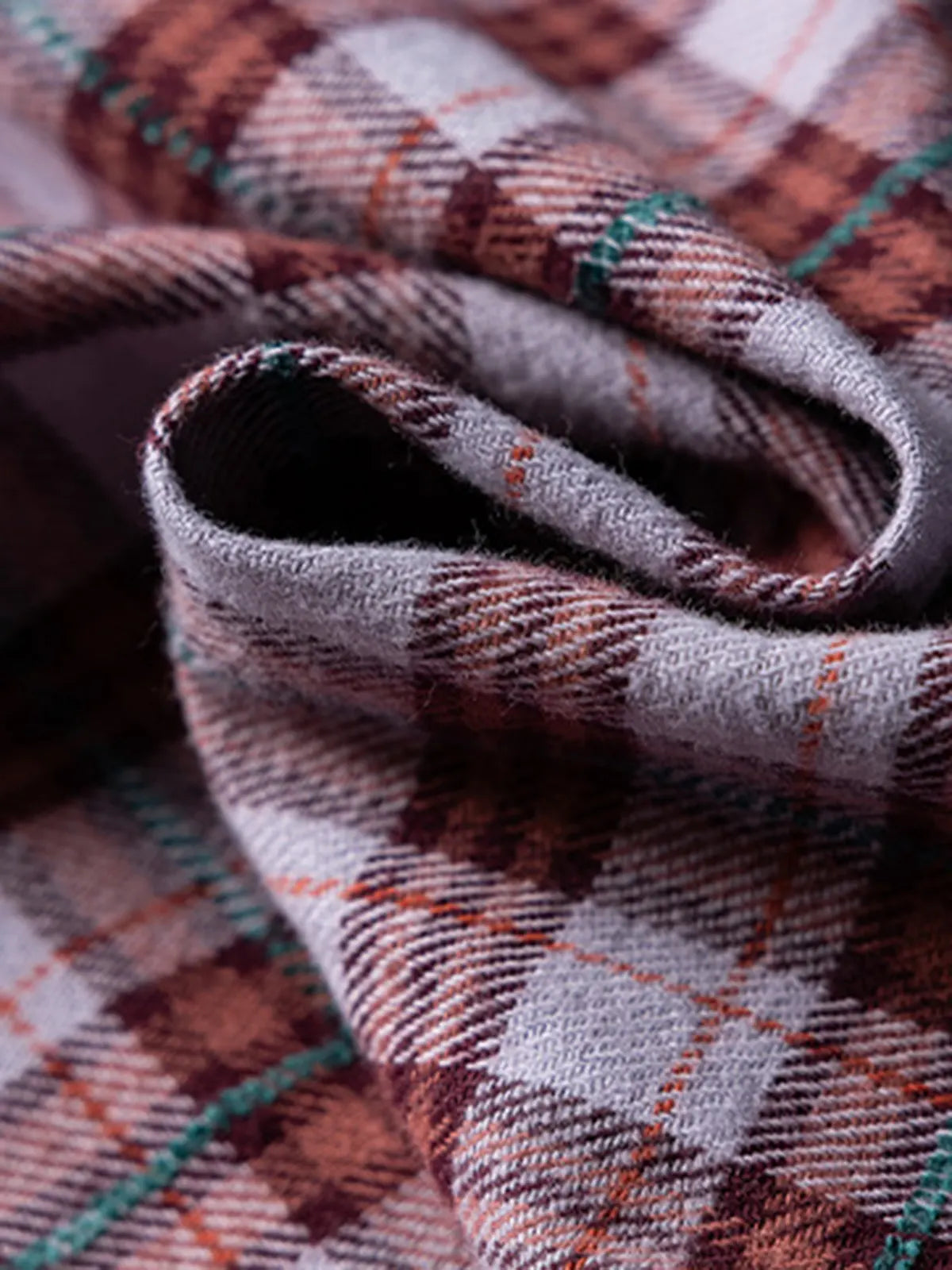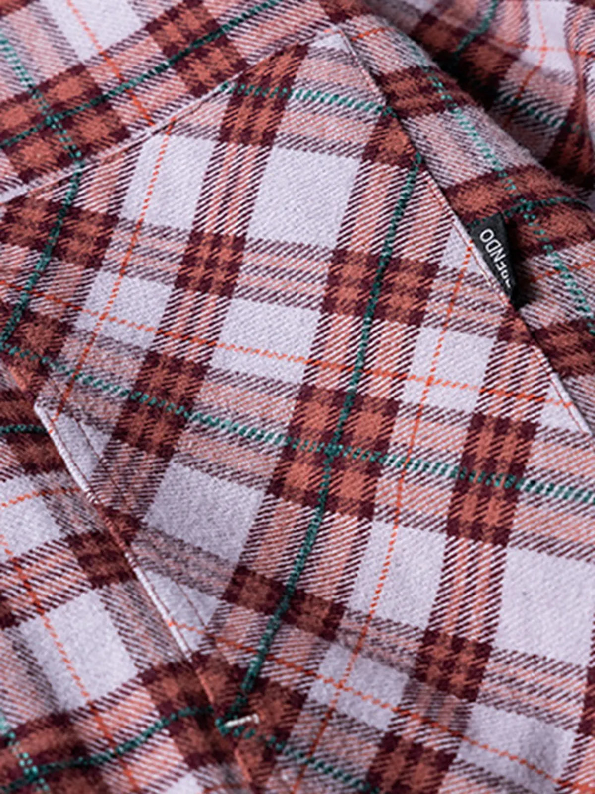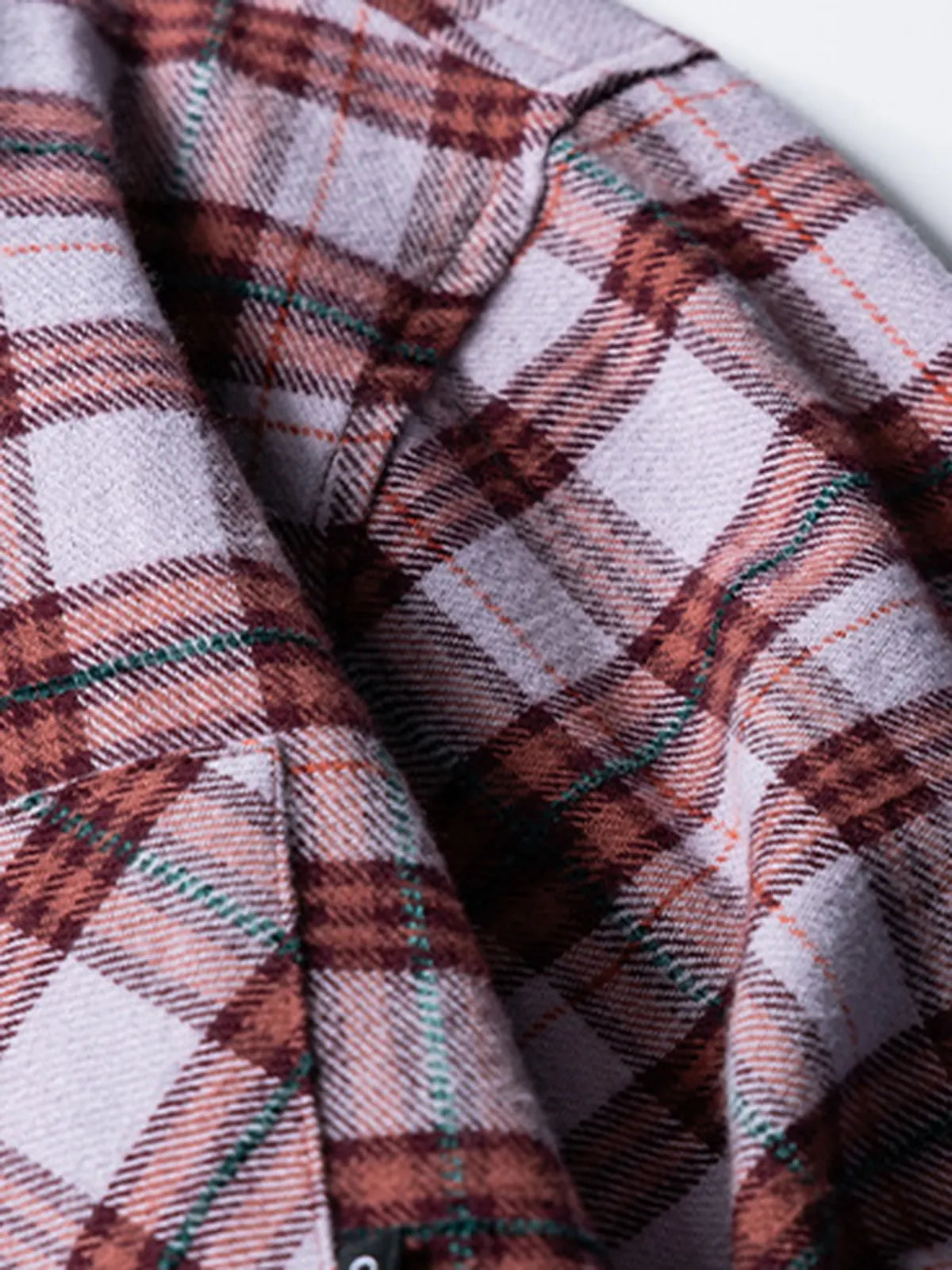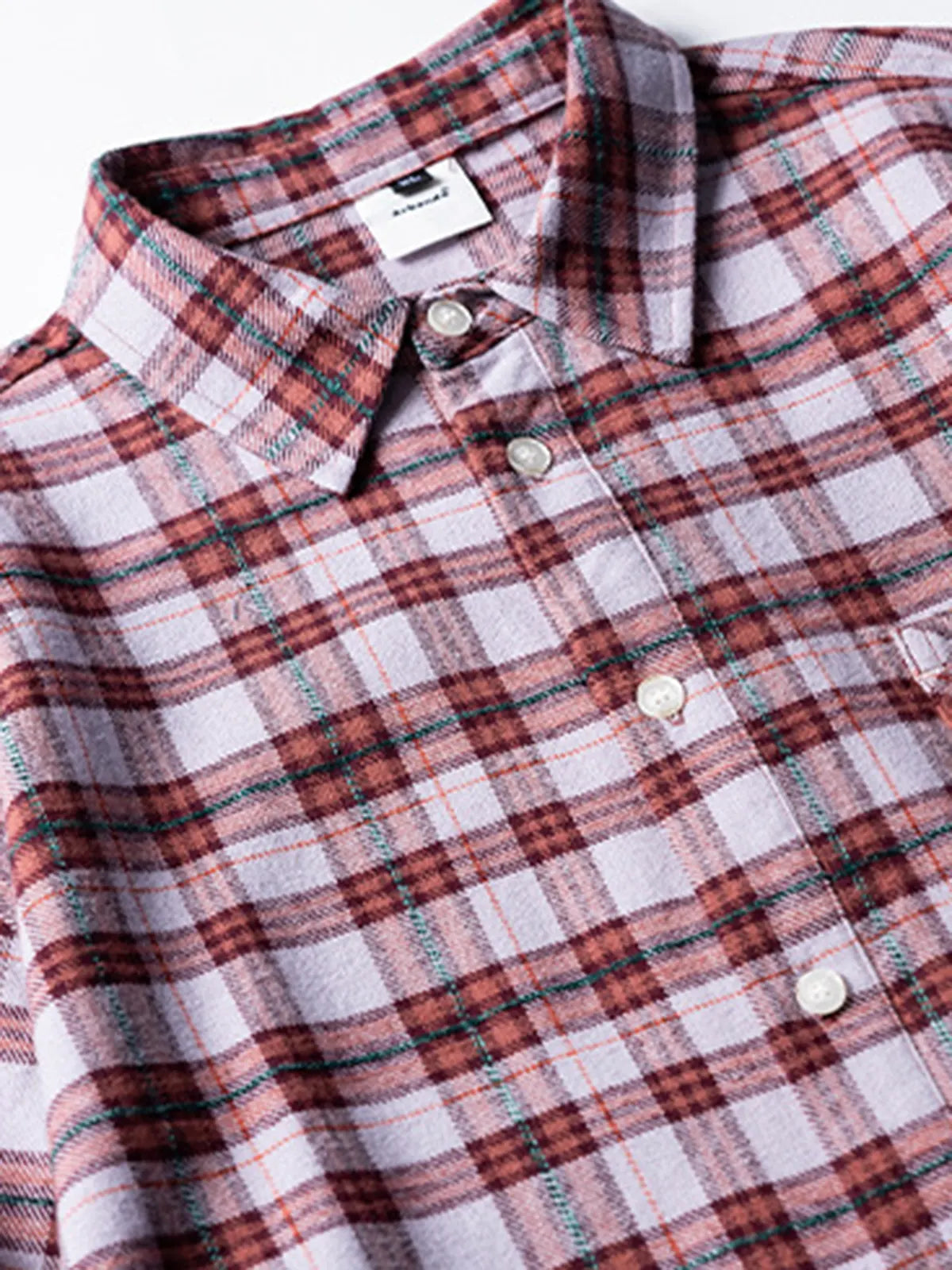 本製品は、98%コットンと2%の雪ニール(シェニール)糸を掛け合わせた生地を使用し、柔らかい手触りと織りの立体感を同時に実現しています。配色が印象的なチェック柄で、一枚着としてはもちろん、インナーとしての重ね着やライトアウターとしての着用にも活躍。ゆったりとしたシルエットは、シャツジャケット感覚で気軽に羽織れるのがポイントです。胸ポケットは柄合わせを意識してデザインされており、コーデ全体のバランスを崩さないよう配慮。コットン主体の素材に雪ニール糸を足すことで、通常のチェックシャツにはないふんわりとした質感を生み出し、程よい温かみも感じられます。