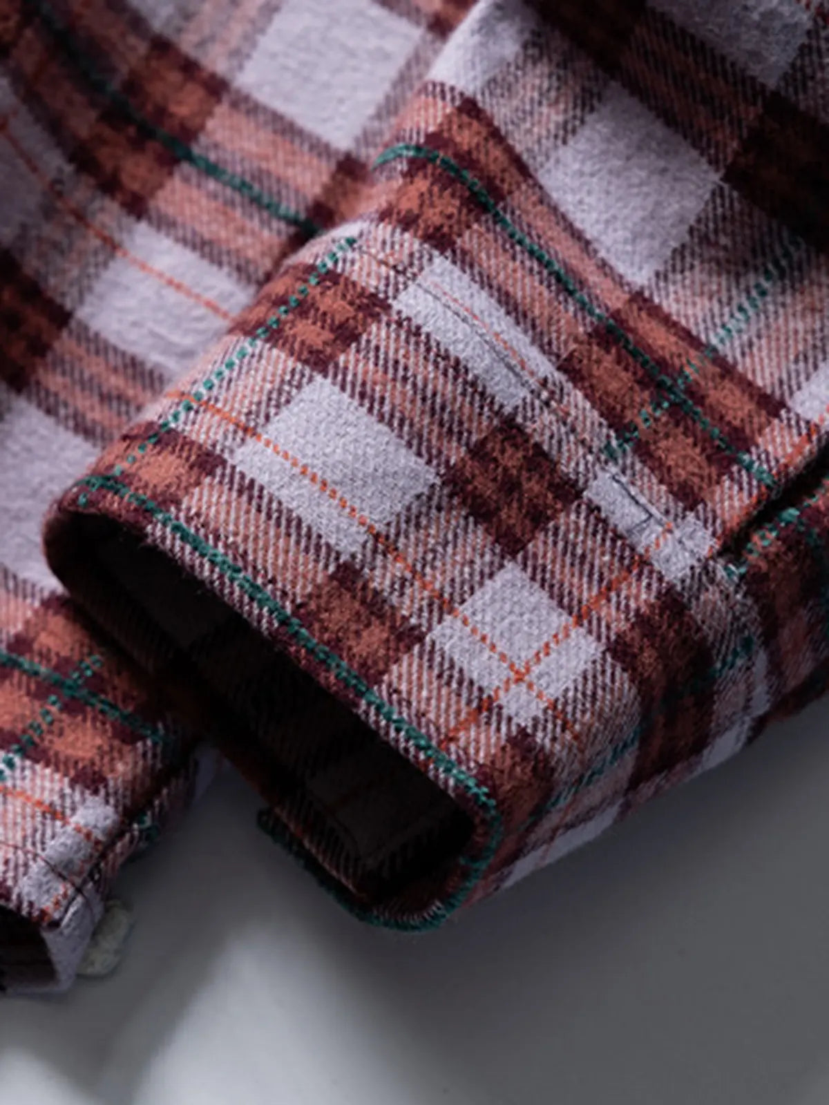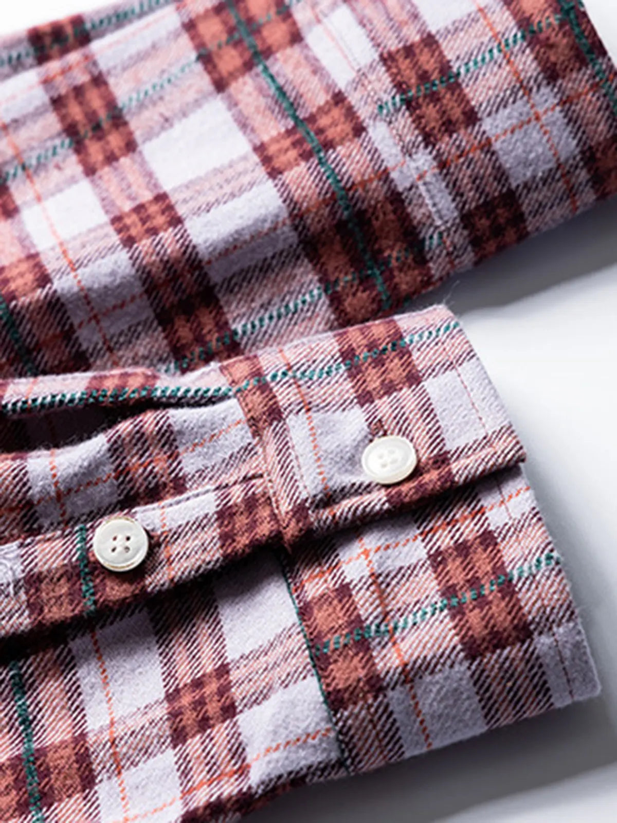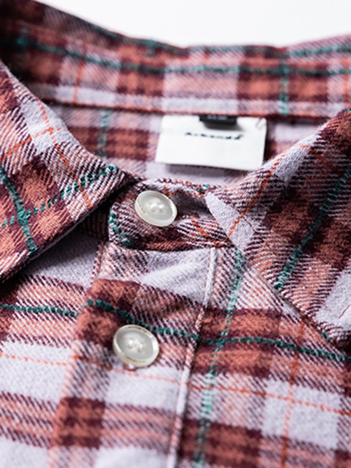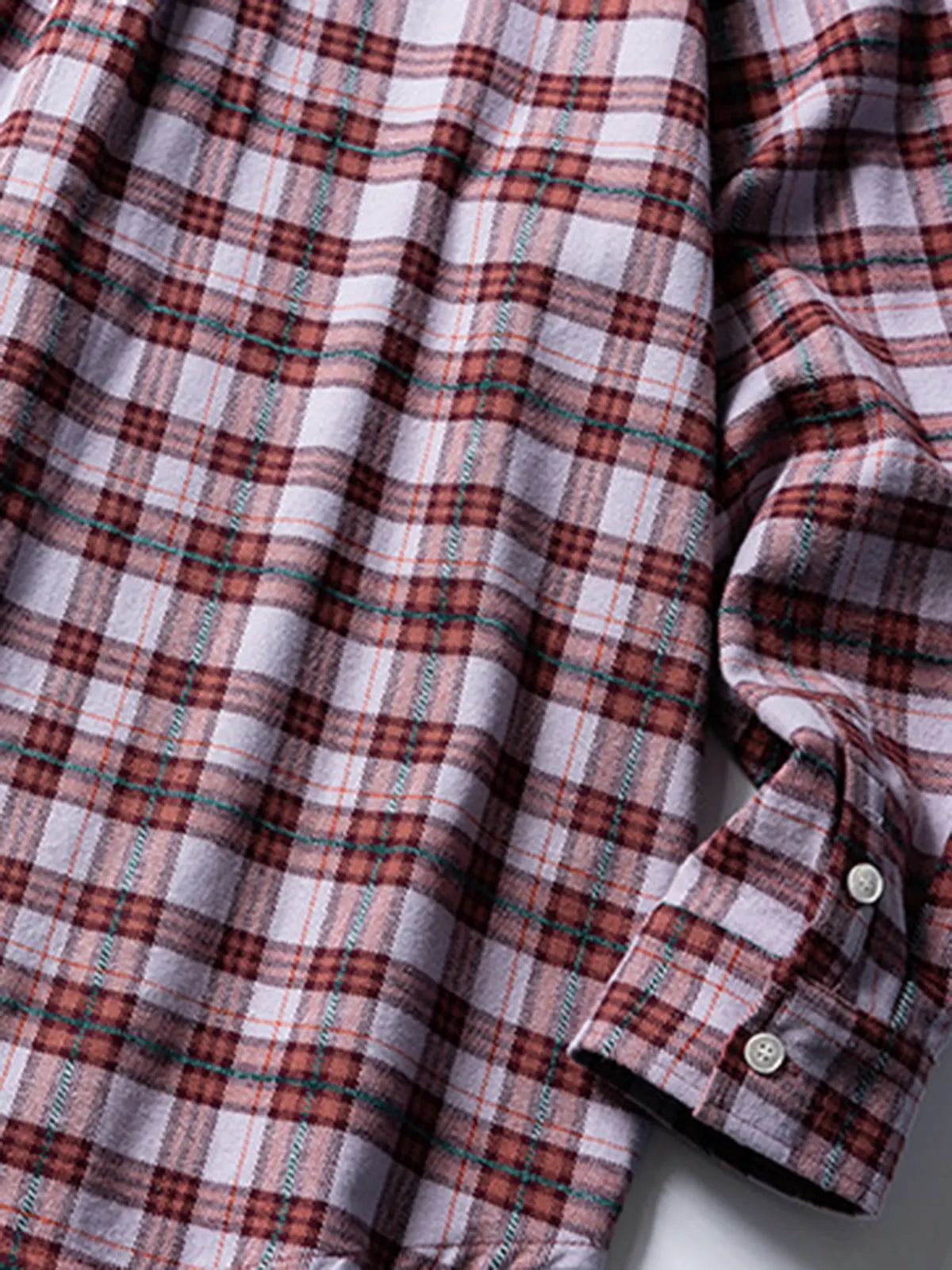 このシャツは、コットンベースに雪ニール糸をわずかにブレンドした独特の生地感と配色チェック柄が特徴の長袖シャツです。
