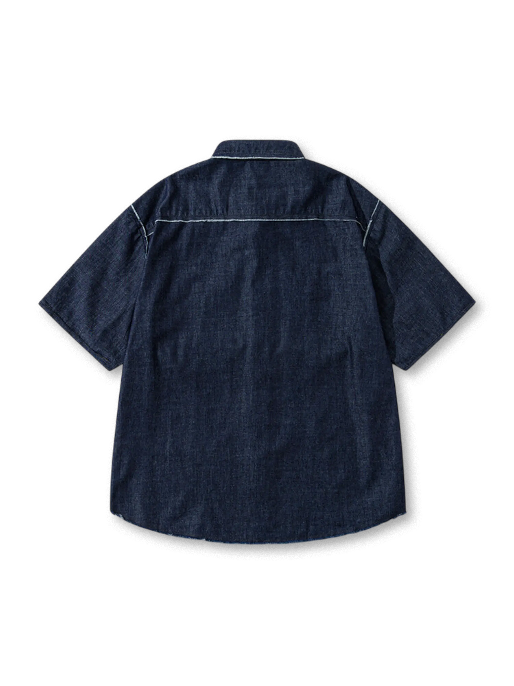 軽く洗い加工を施したデニム生地は、自然な色落ち感と程よいムラが魅力で、ほつれたステッチがアクセントとして効いています。ドロップショルダーとワイドな身幅により真夏でも風通しが良く、ストレスフリーな着心地を実現。胸元の大ぶりポケットは実用性を兼ね備え、小物の収納に便利です。中薄地の生地は、通気性と耐久性のバランスがよく保たれ、長く着込むほど味わいが深まります。