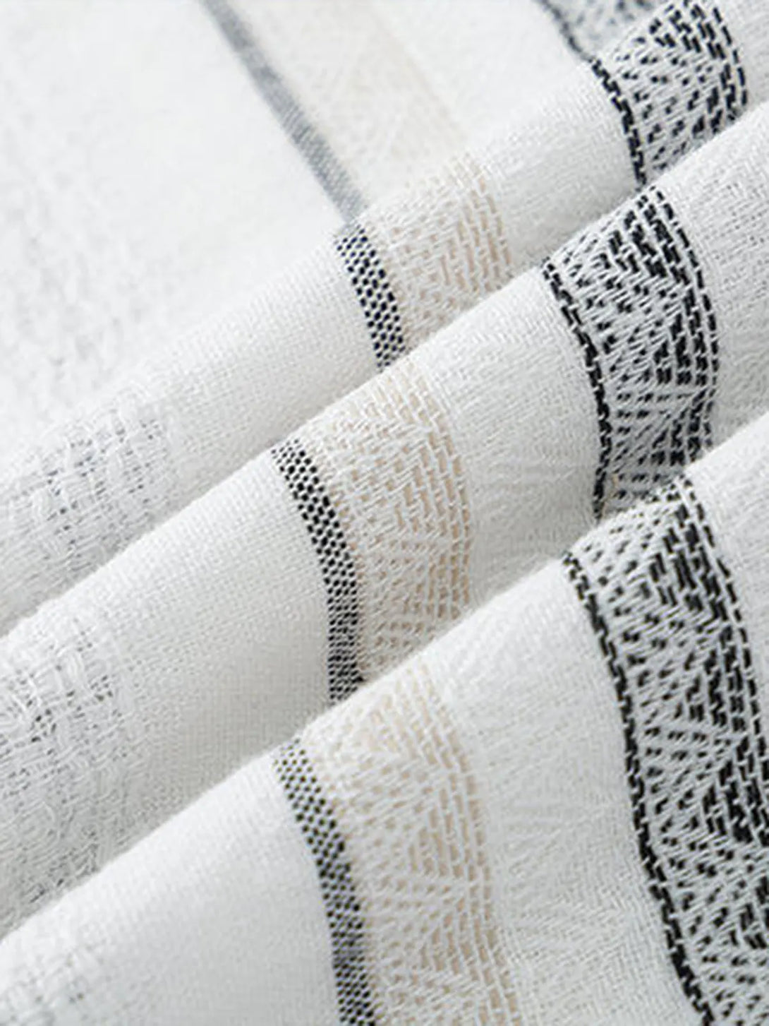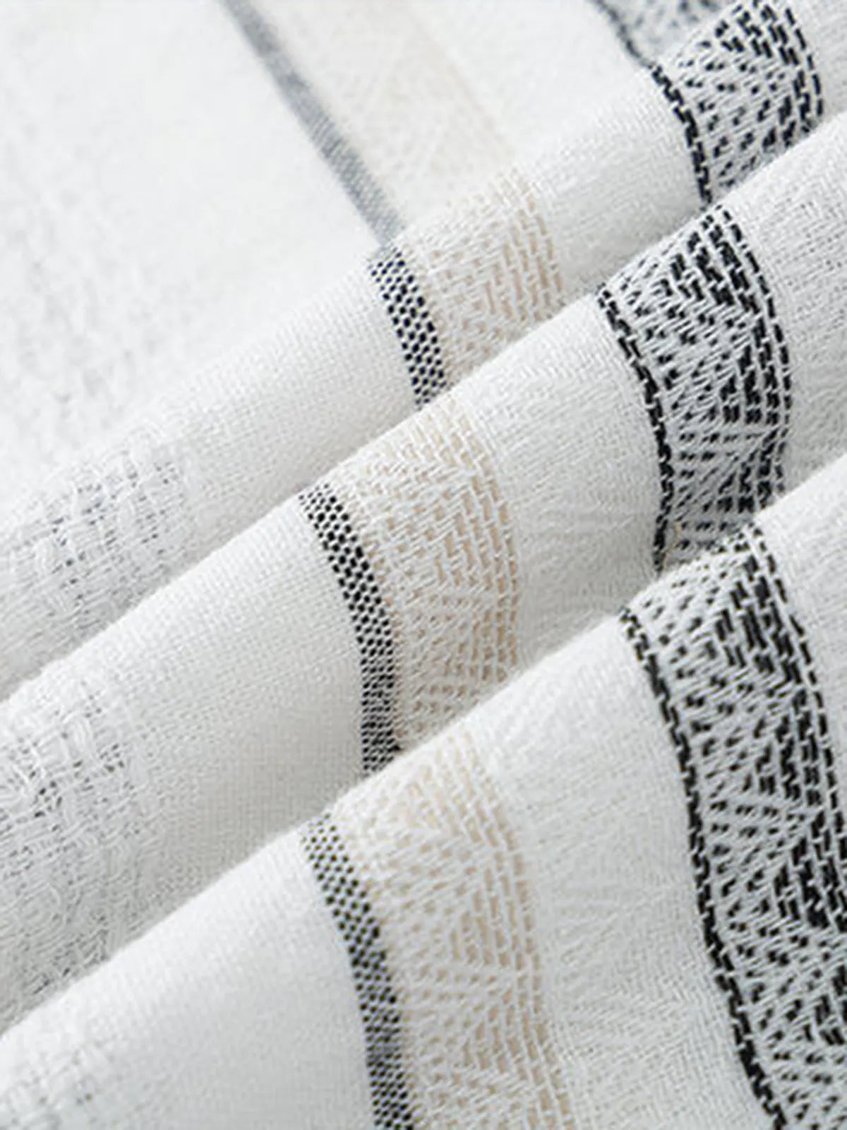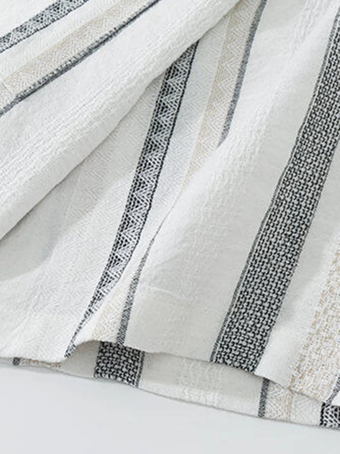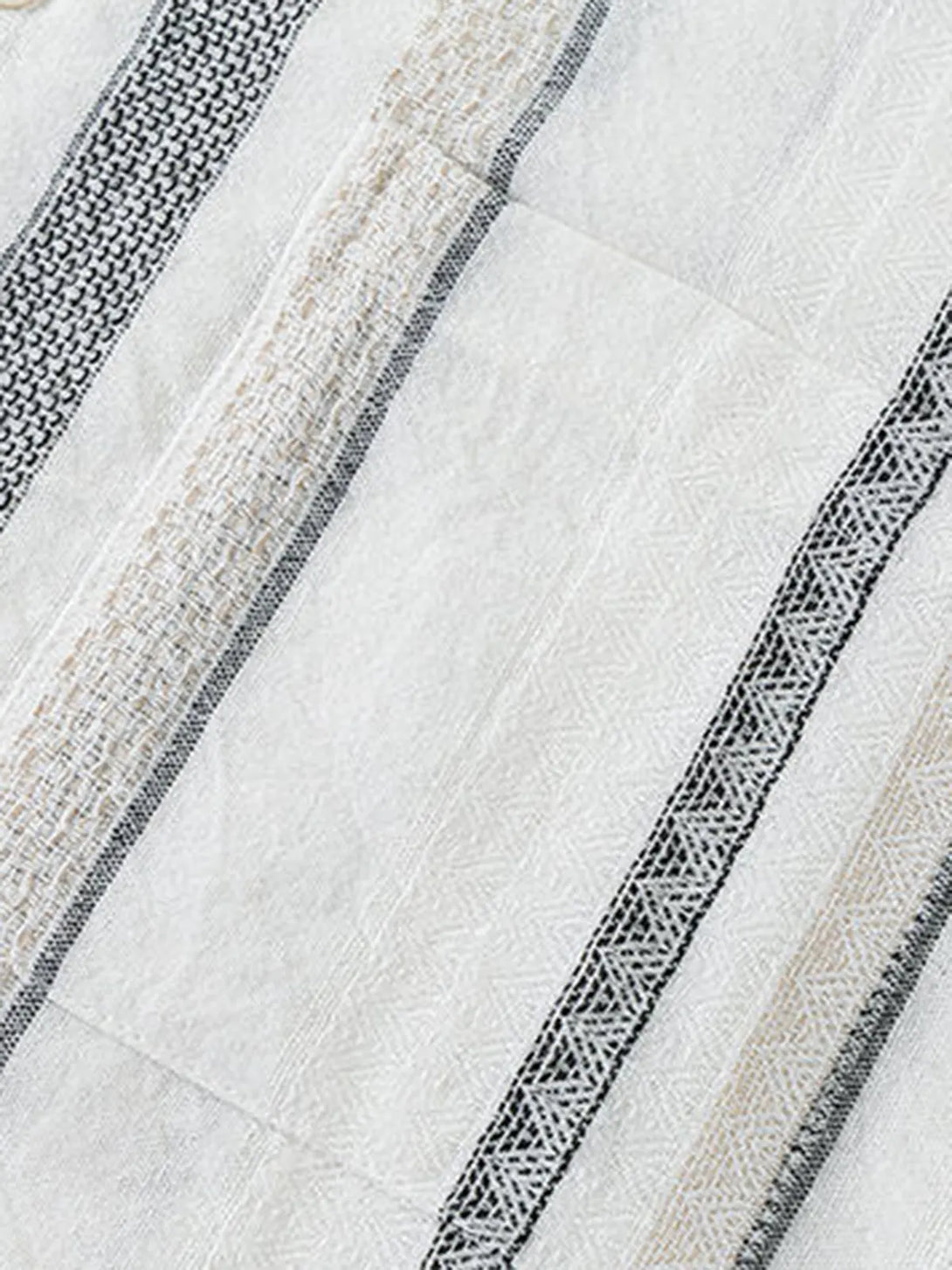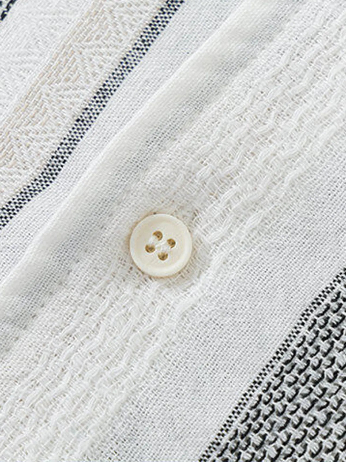 ブラウンのストライプが映える、リラックスシルエットのコットン開襟シャツ。