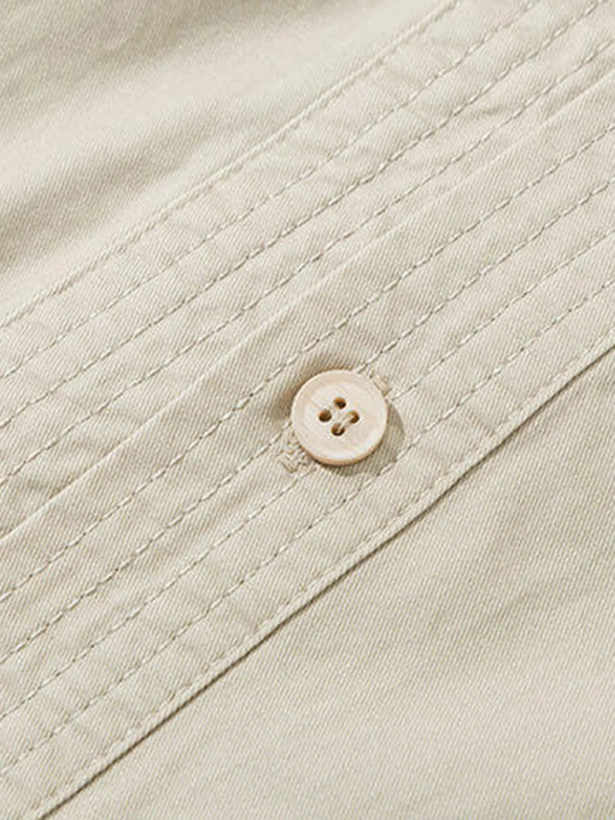 ヴィンテージのミリタリーシャツに着想を得た圧線加工が前立てを彩り、程よい厚みの100%コットンが着込むほどに風合いを深めます。ゆとりのある身幅とドロップショルダーが都会的なリラックス感を演出し、胸ポケットのユーティリティ感も魅力。デニムやチノ、ワークパンツと合わせれば、アメリカンワークの伝統を日常に取り入れたこなれたスタイルが完成します。
