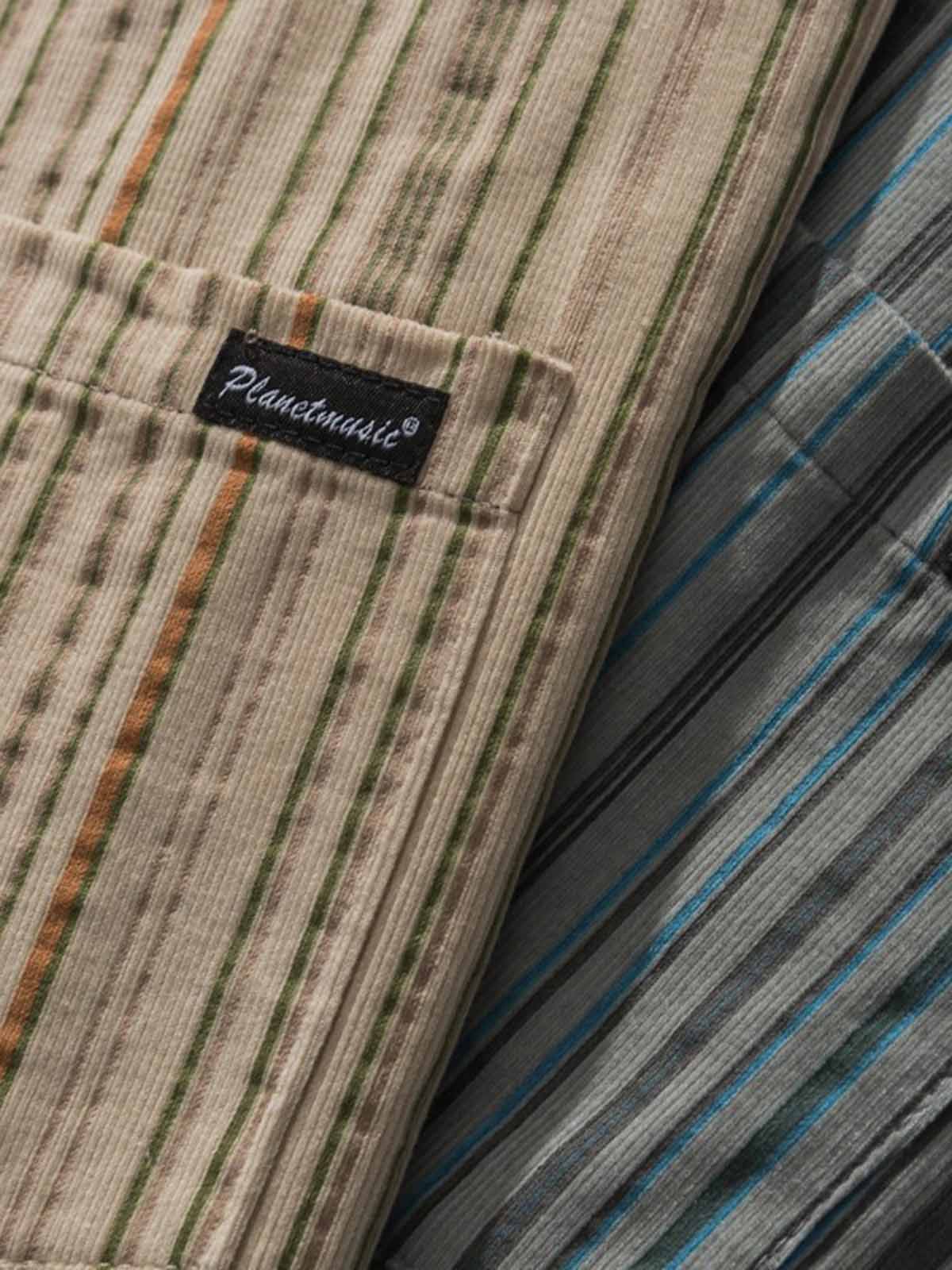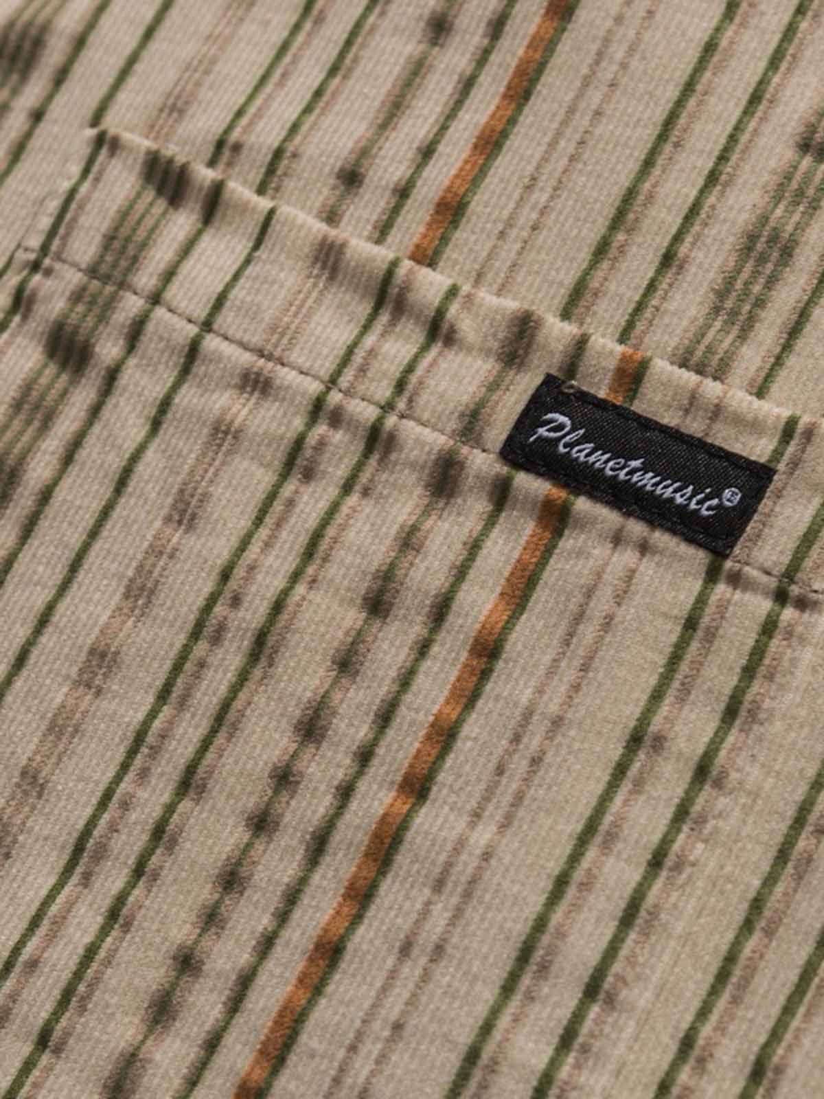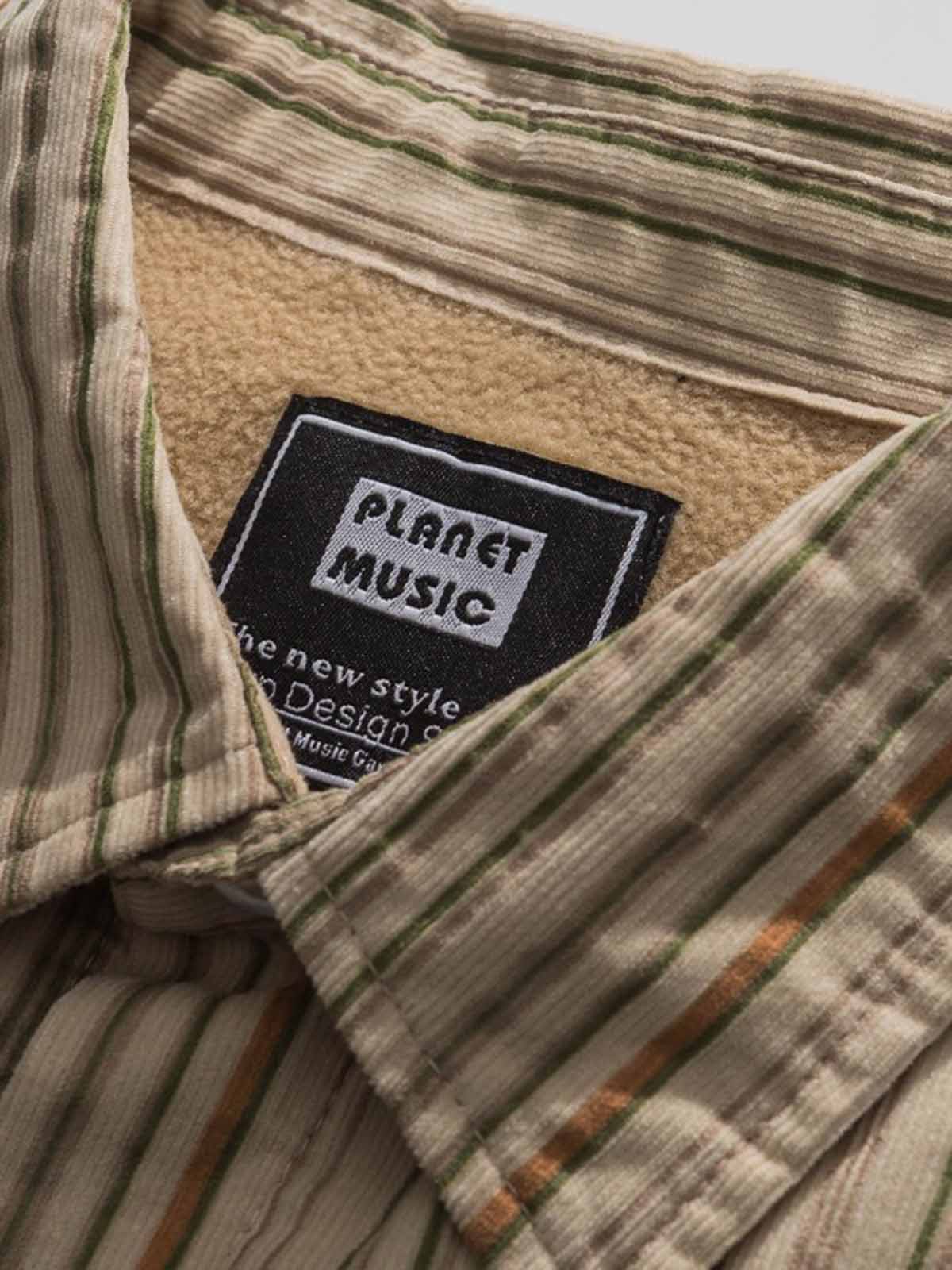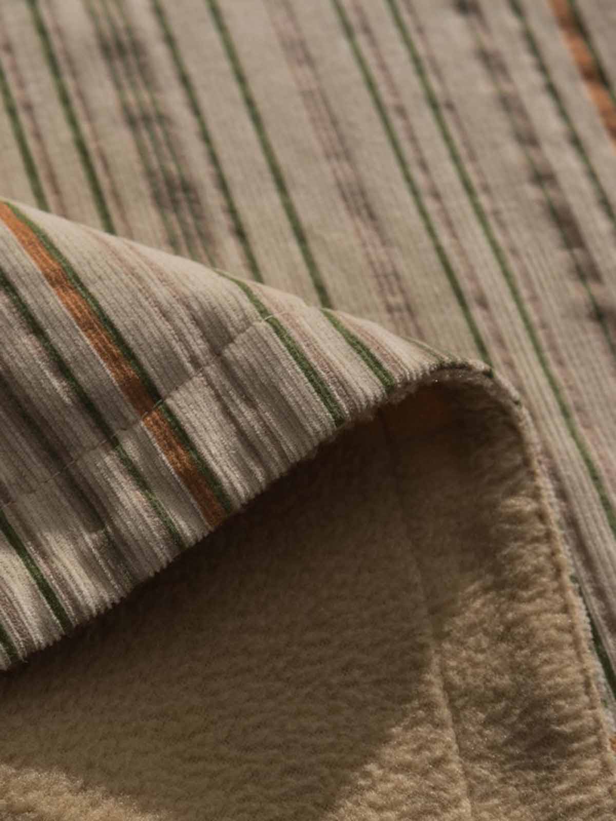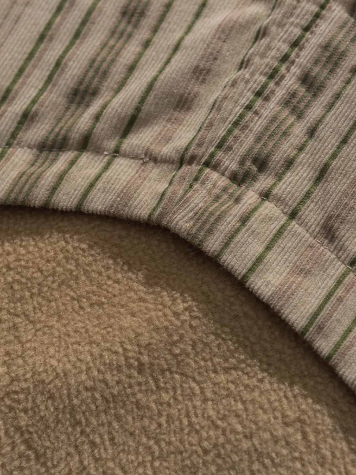 懐かしさ漂うストライプ柄に、内側に柔らかなフリースを使用し、暖かさと快適な着心地を両立。ゆったりとしたルーズフィットとドロップショルダーのシルエットで、重ね着も単体着用も可能。胸元のシンプルなポケットが実用性とデザイン性を兼ね備え、都会的な通勤から週末のアウトドアまで幅広く活躍。季節の変わり目にぴったりの一枚です。
