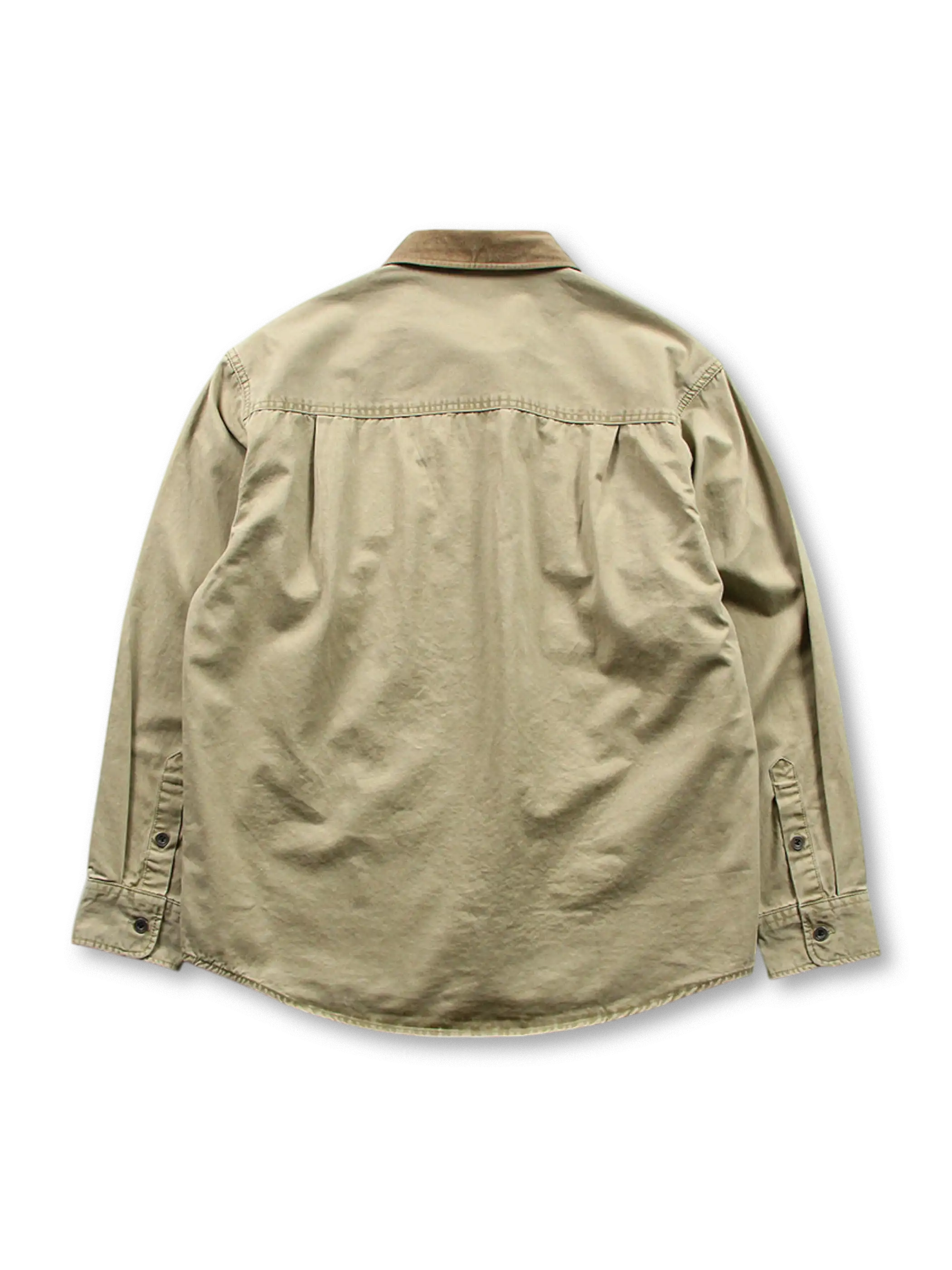 1930〜40年代のアメリカ中西部作業着をルーツに、頑強な高密度コットンツイルと襟元のコーデュロイ切り替えがクラシカルな表情を演出。ヴィンテージライクなウォッシュ加工は、春先の軽い羽織りから秋のレイヤードまで活躍し、ゆったりとしたボックスシルエットがタウンユースにも映える。老舗アメリカ工場による確かな縫製で、長年にわたり愛用できる定番アイテムです。