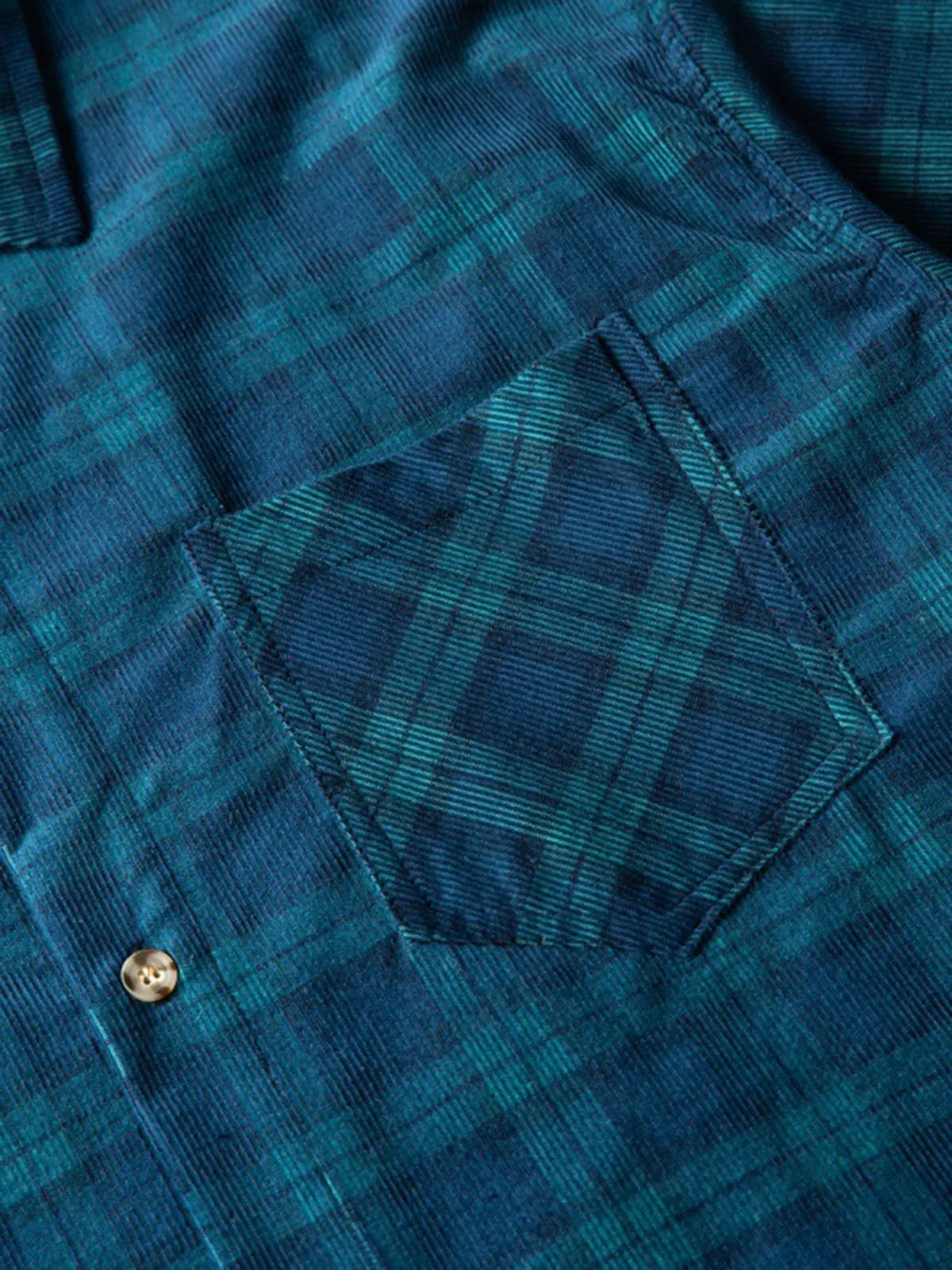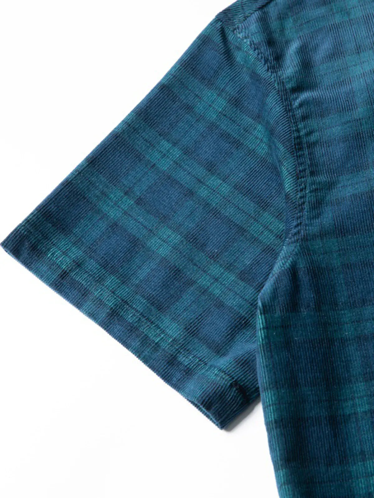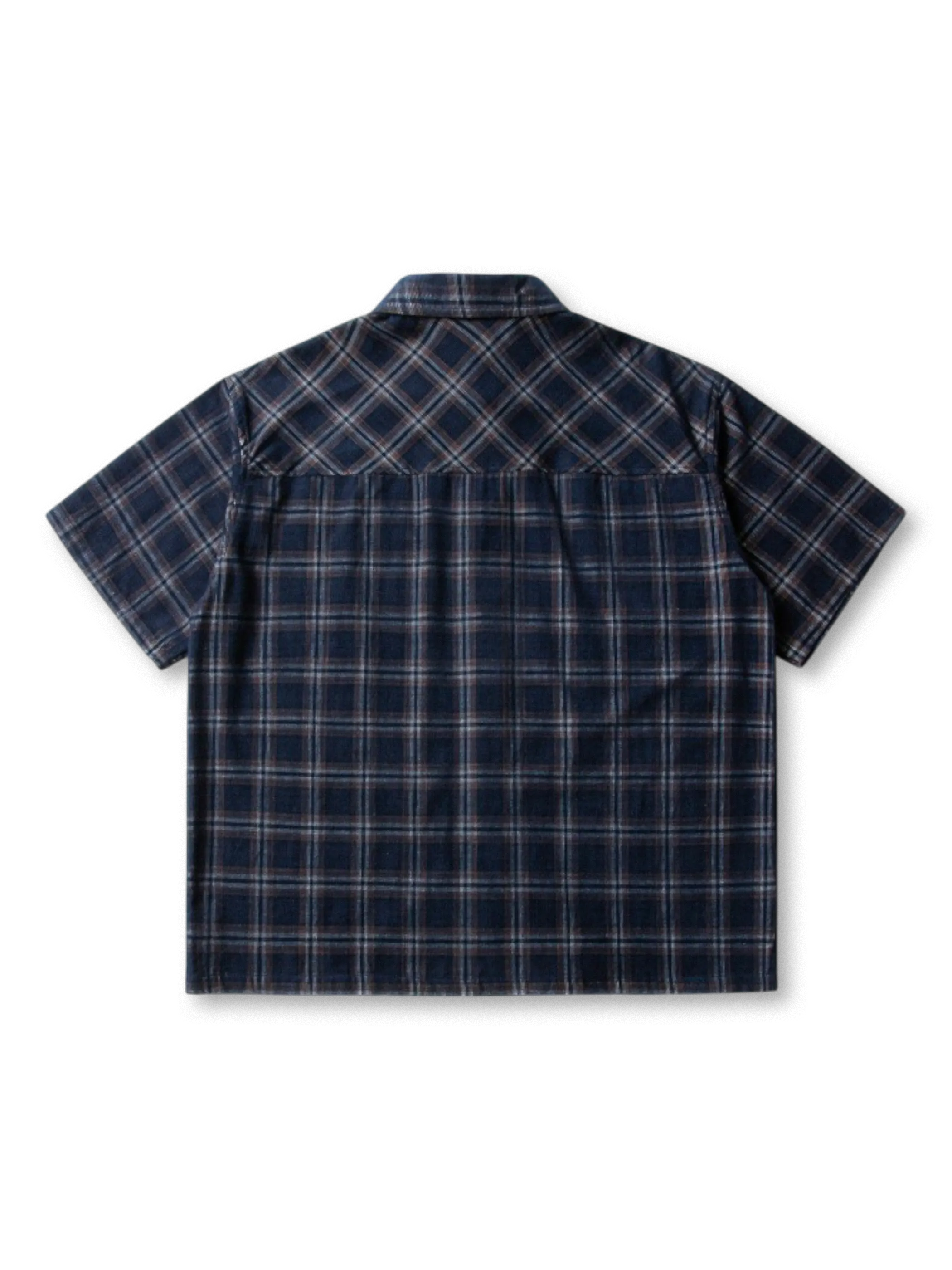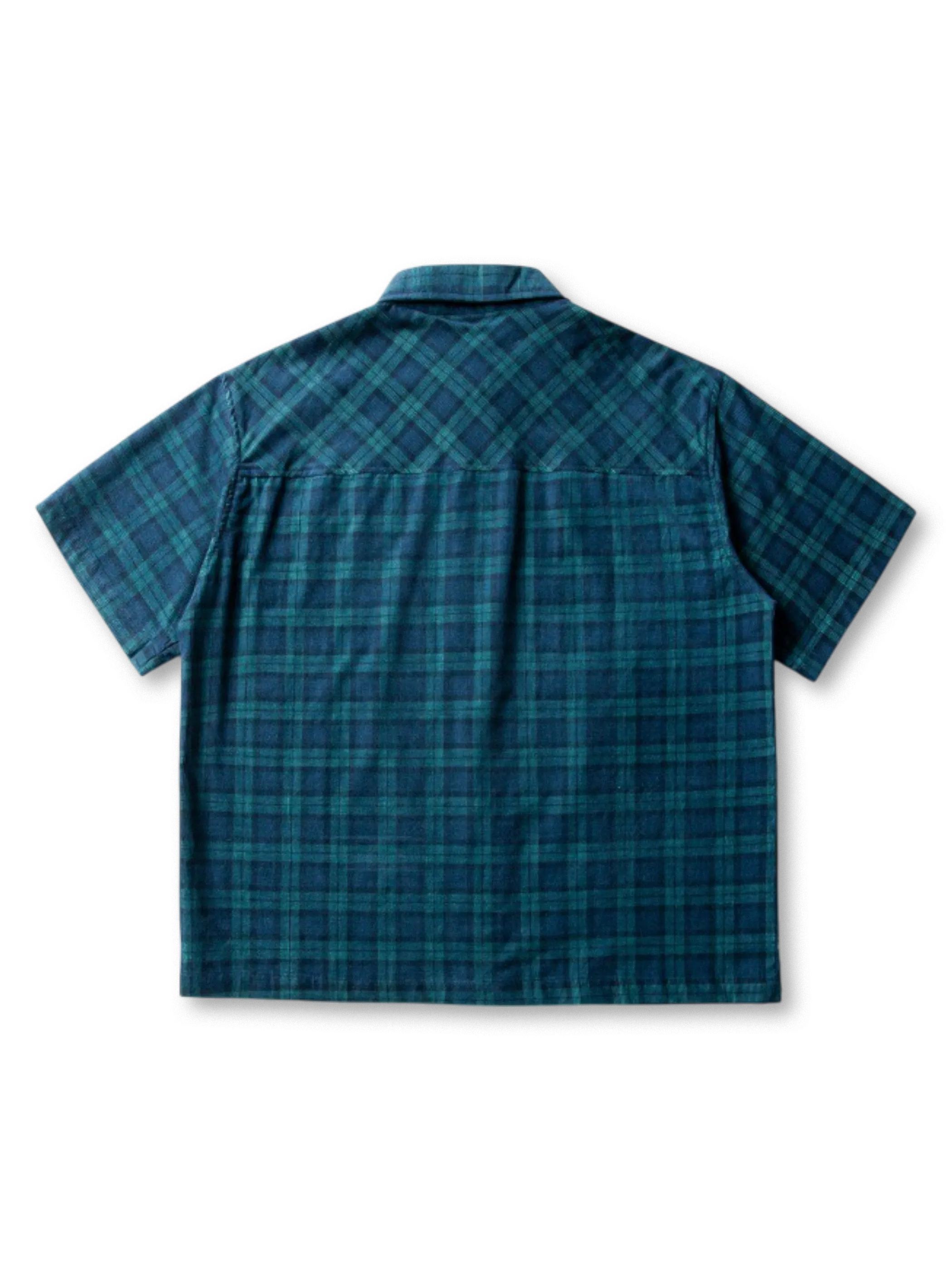 チェニール素材の深みあるチェック柄と胸ポケットを備えた、ゆったりシルエットのオープンカラー半袖シャツ。