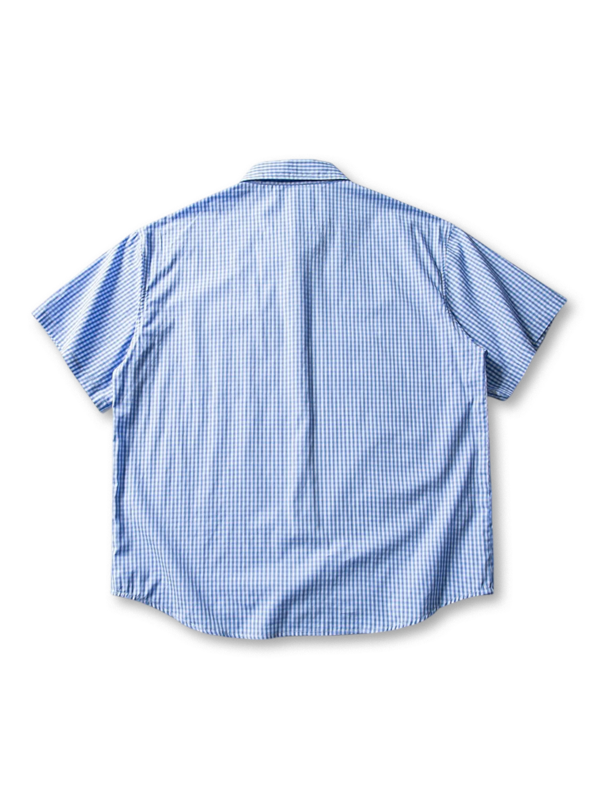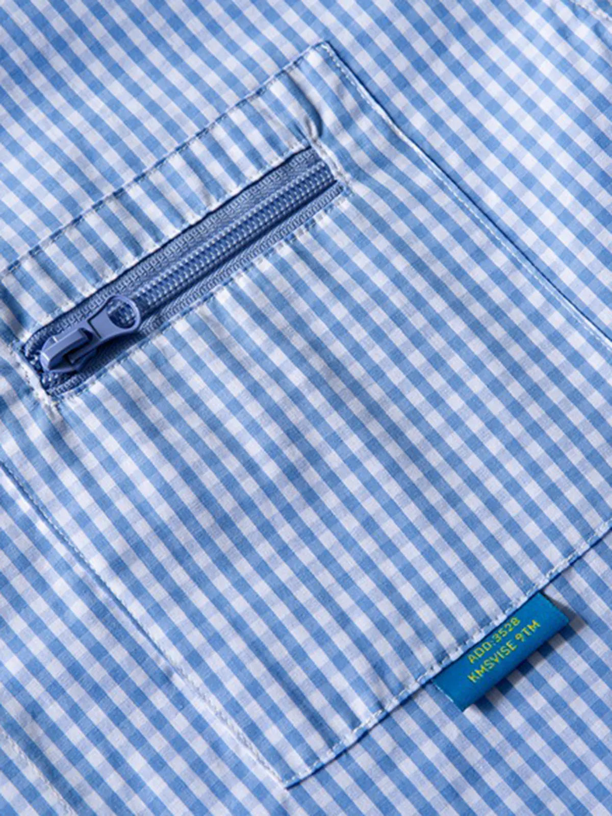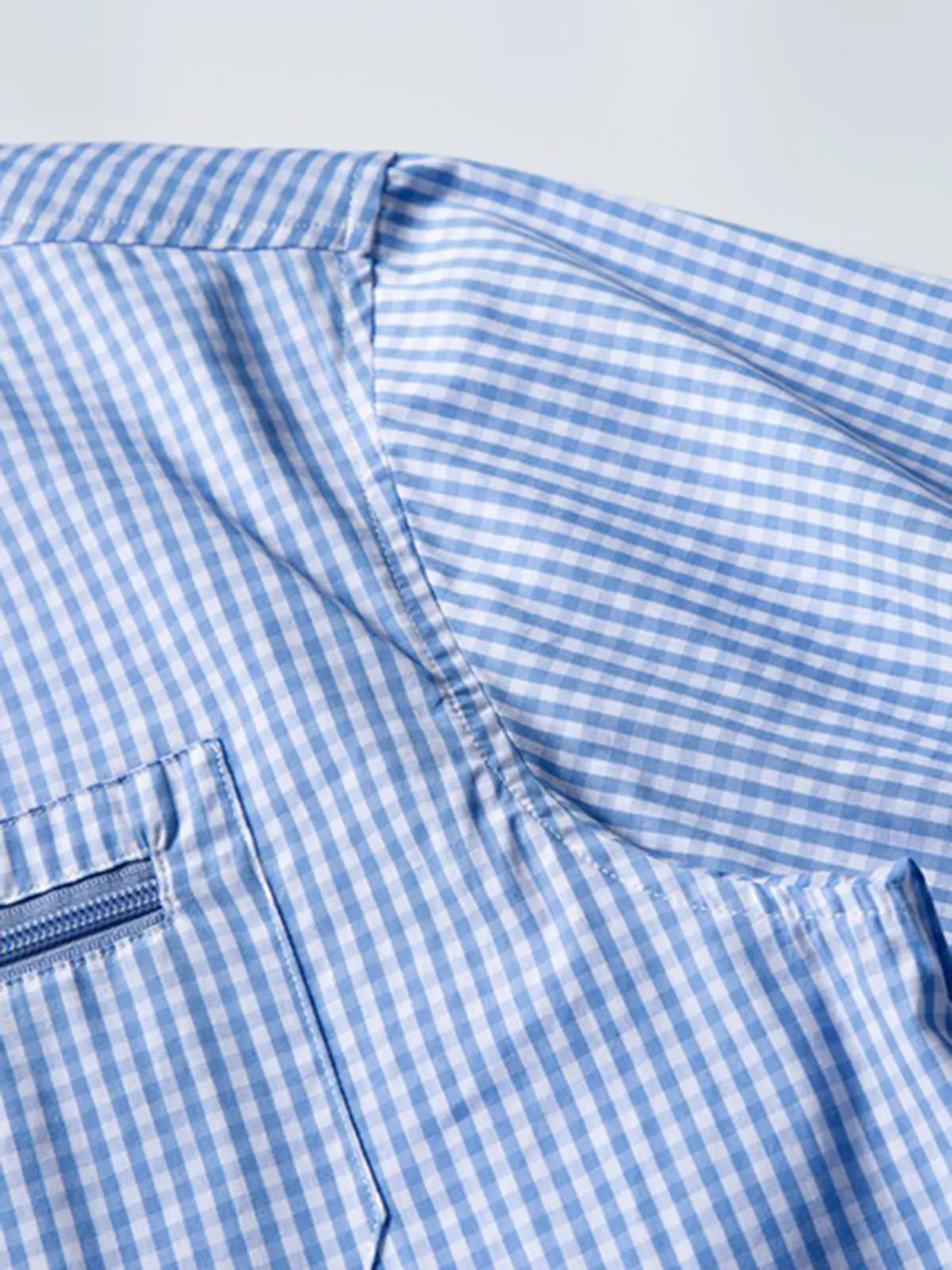 ギンガムチェック柄に多彩なボタンとジップポケットを配した、軽やかなポリエステル製ワイドフィットシャツ。