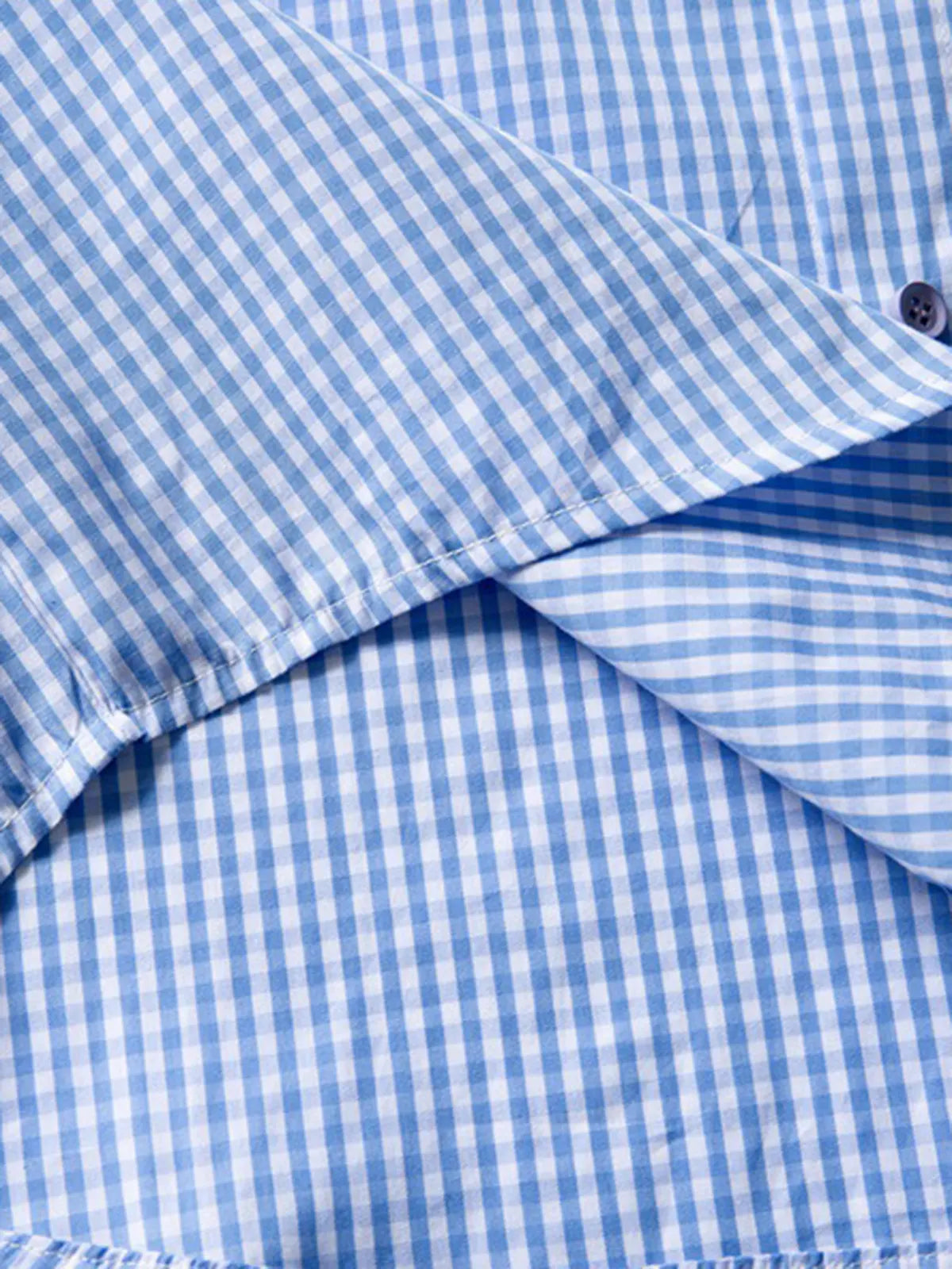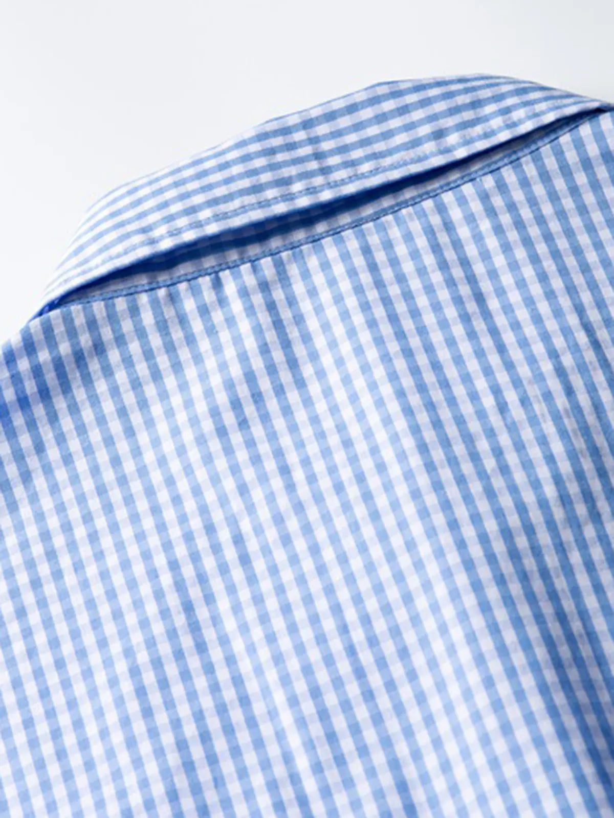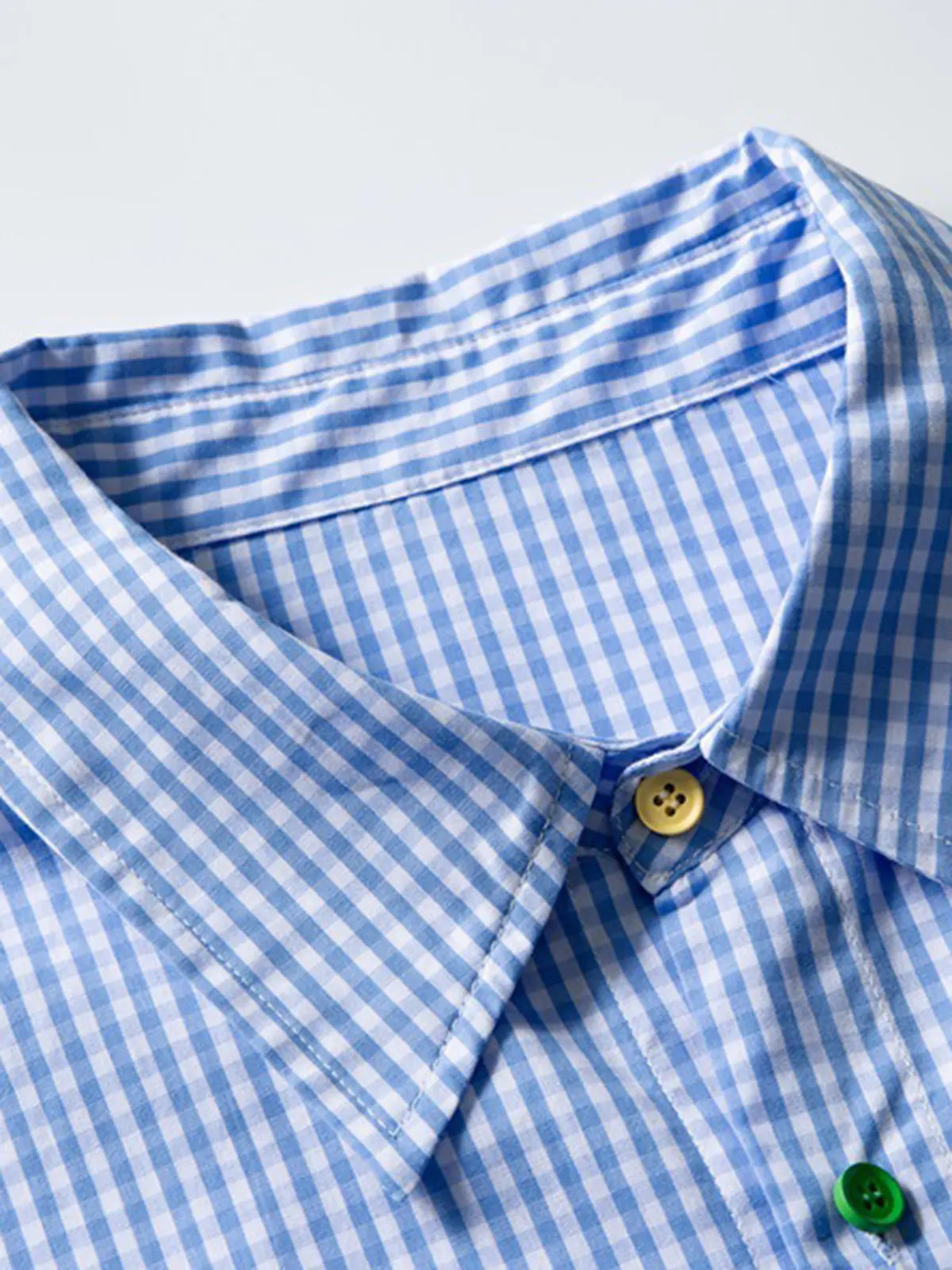 ギンガムチェック柄に多彩なボタンとジップポケットを配した、軽やかなポリエステル製ワイドフィットシャツ。