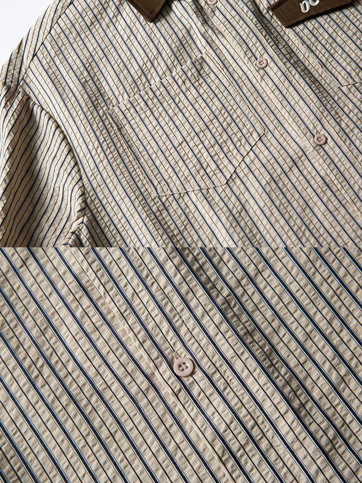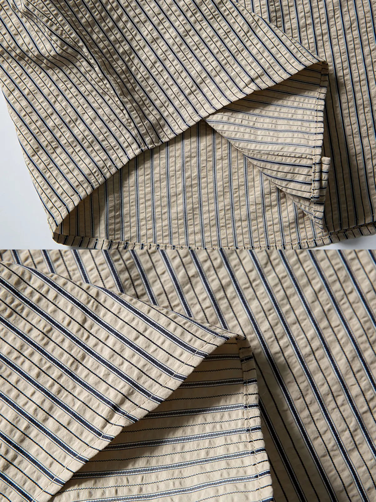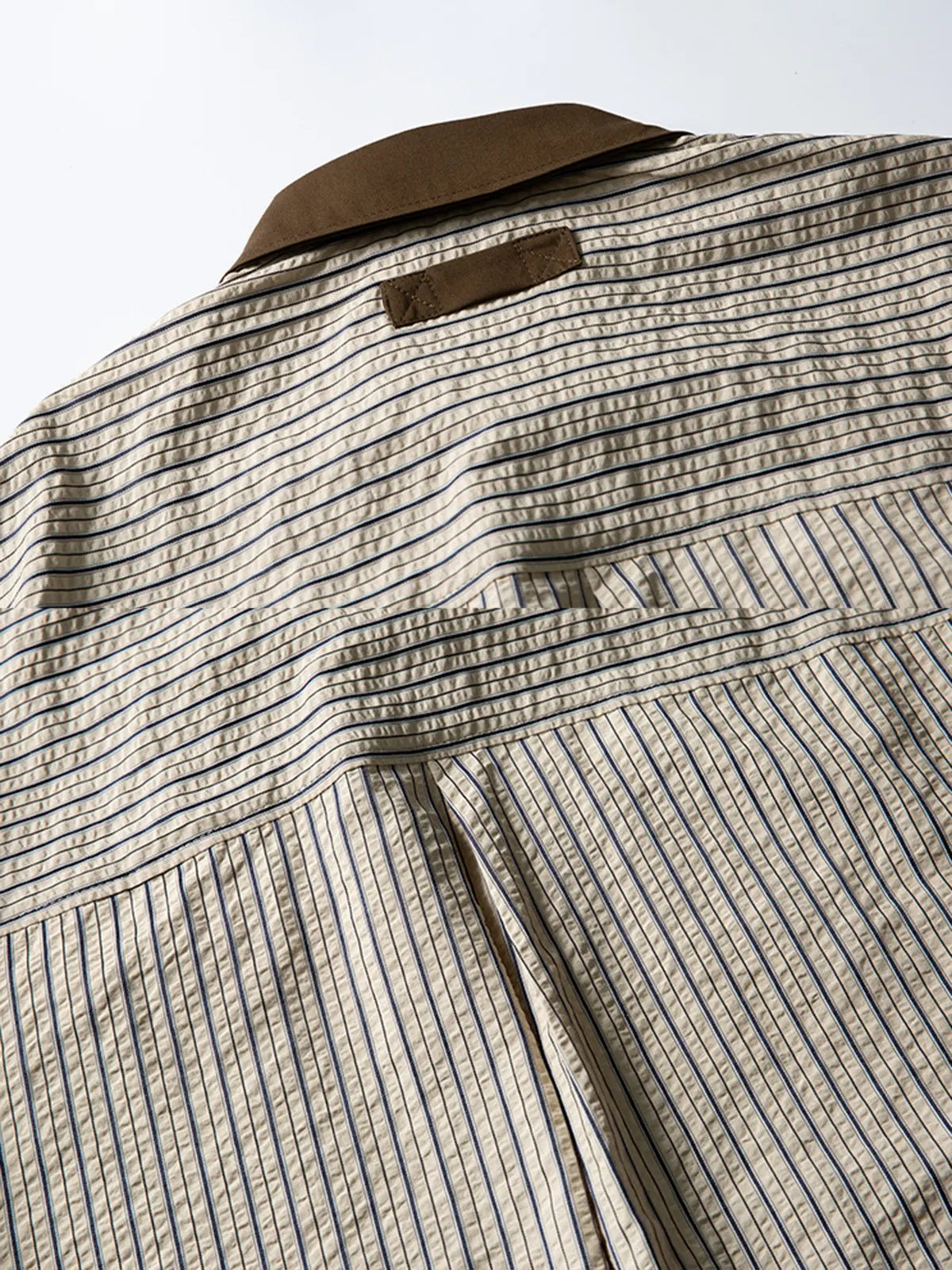 重厚感のあるポリエステル×コットン混紡素材を用い、伝統的なワークディテールを現代的に再解釈。テクスチャードストライプが奥行きを与え、襟と胸ポケットの異素材切り替えがさりげないアクセントに。ややゆとりを持たせたシルエットはデニムやチノとの相性も良く、一着で米国ヴィンテージワークスタイルを完成させます。