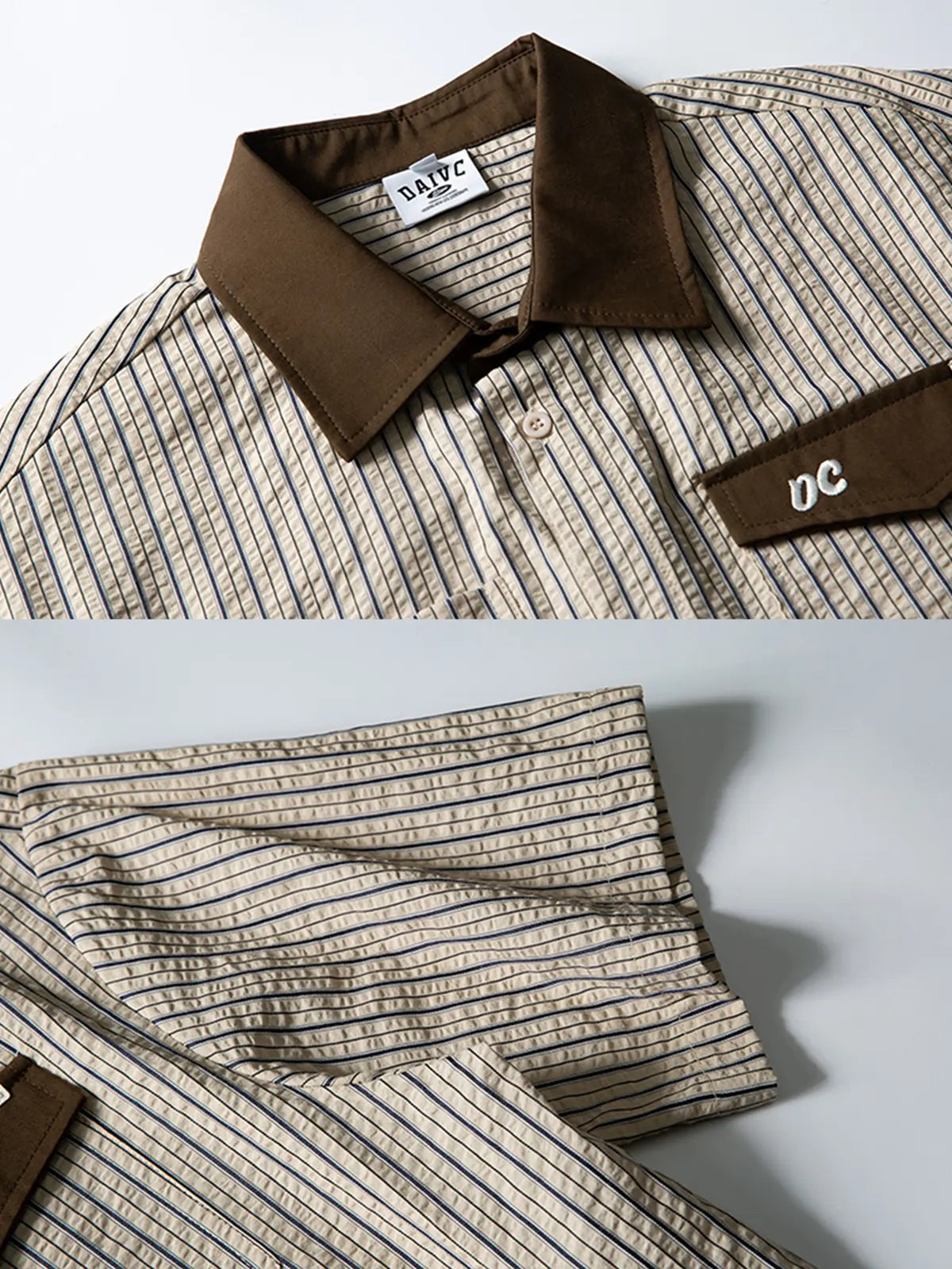独特なストライプ織りとコントラストカラーの襟・ポケットが映える、ヴィンテージ感漂うワークシャツです。