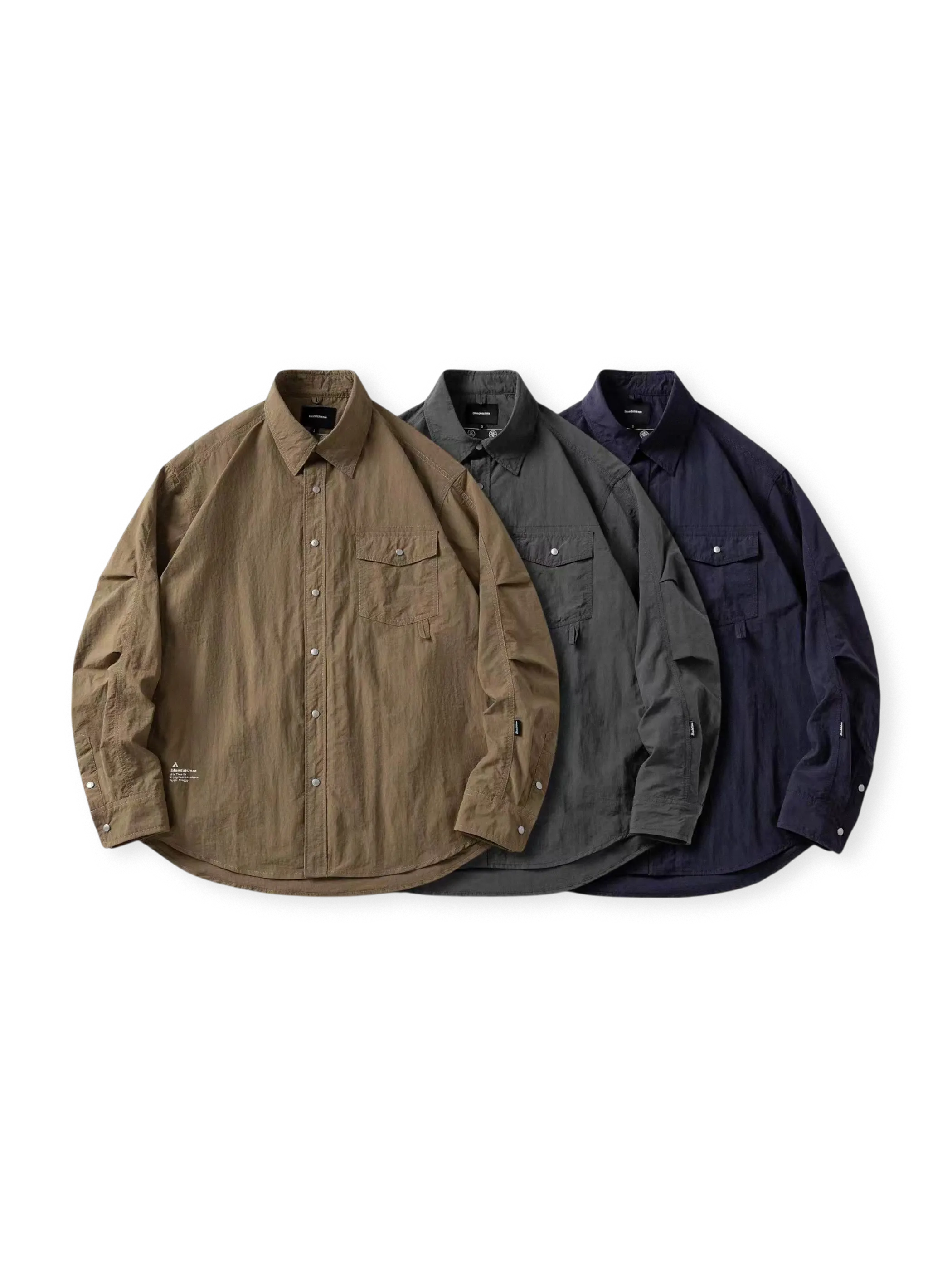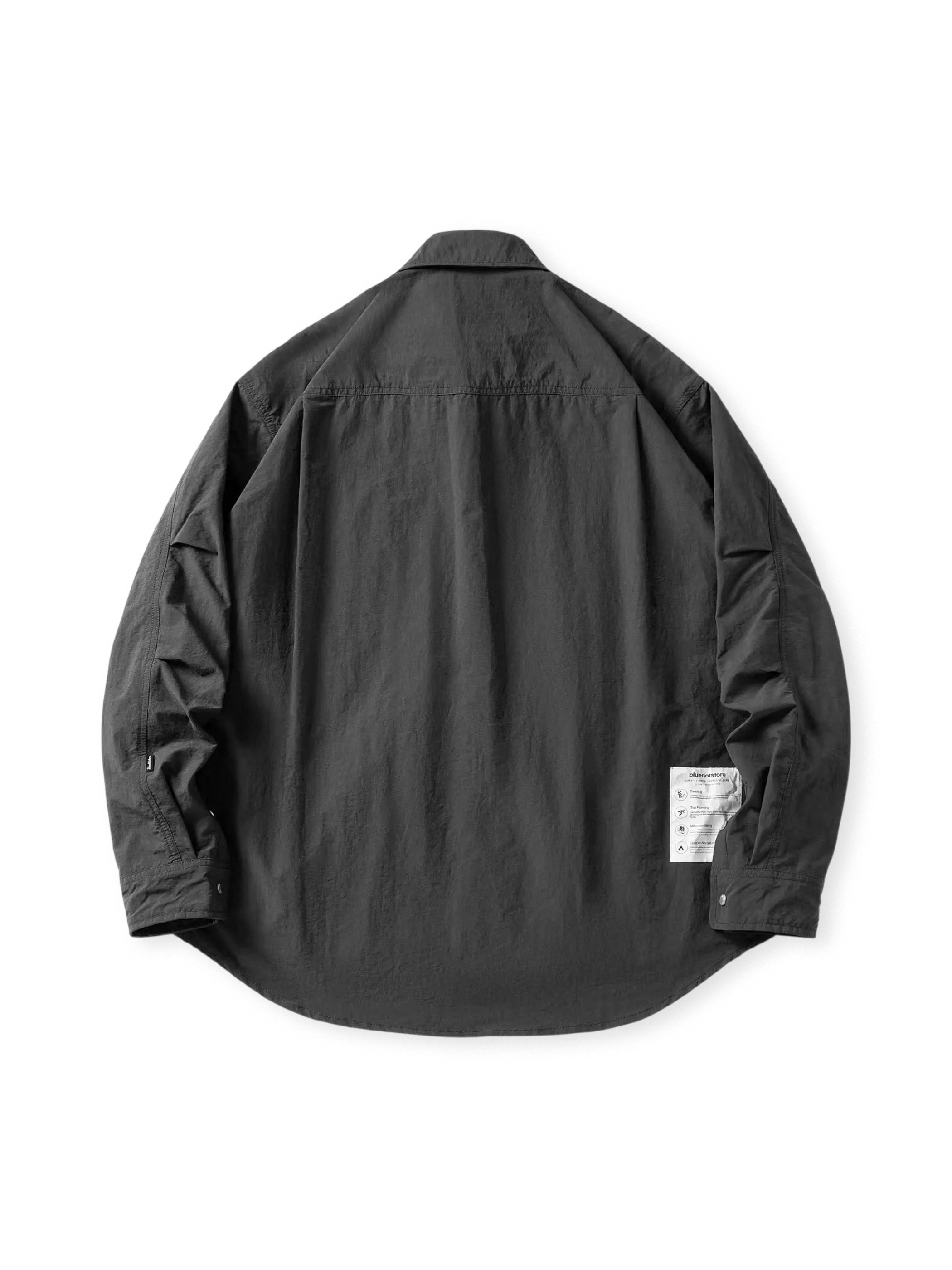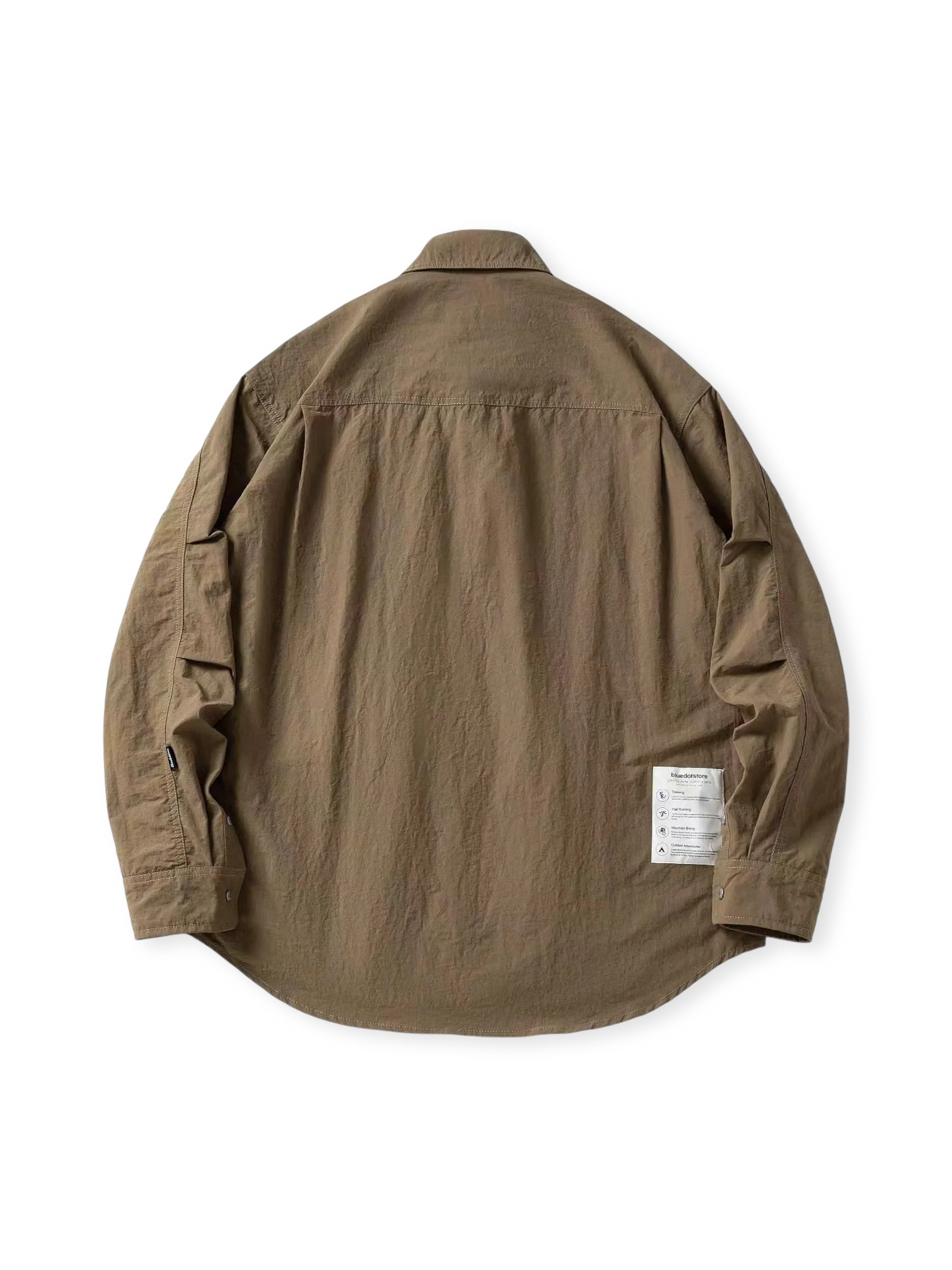 防撥水・速乾性素材と落ち感のあるオーバーサイズデザイン、多機能ポケットが魅力の長袖シャツ。通勤からアウトドアまで、実用性とスタイリッシュさを両立します。