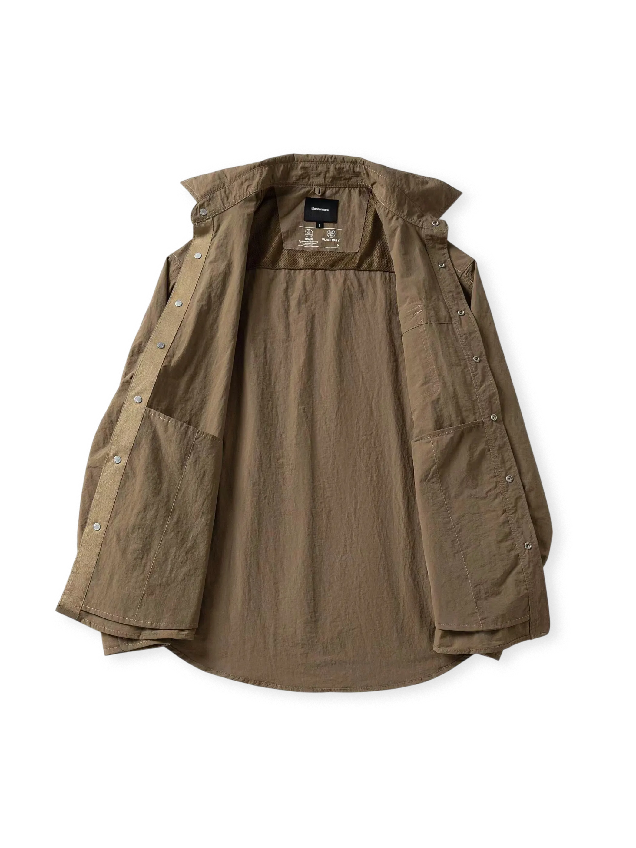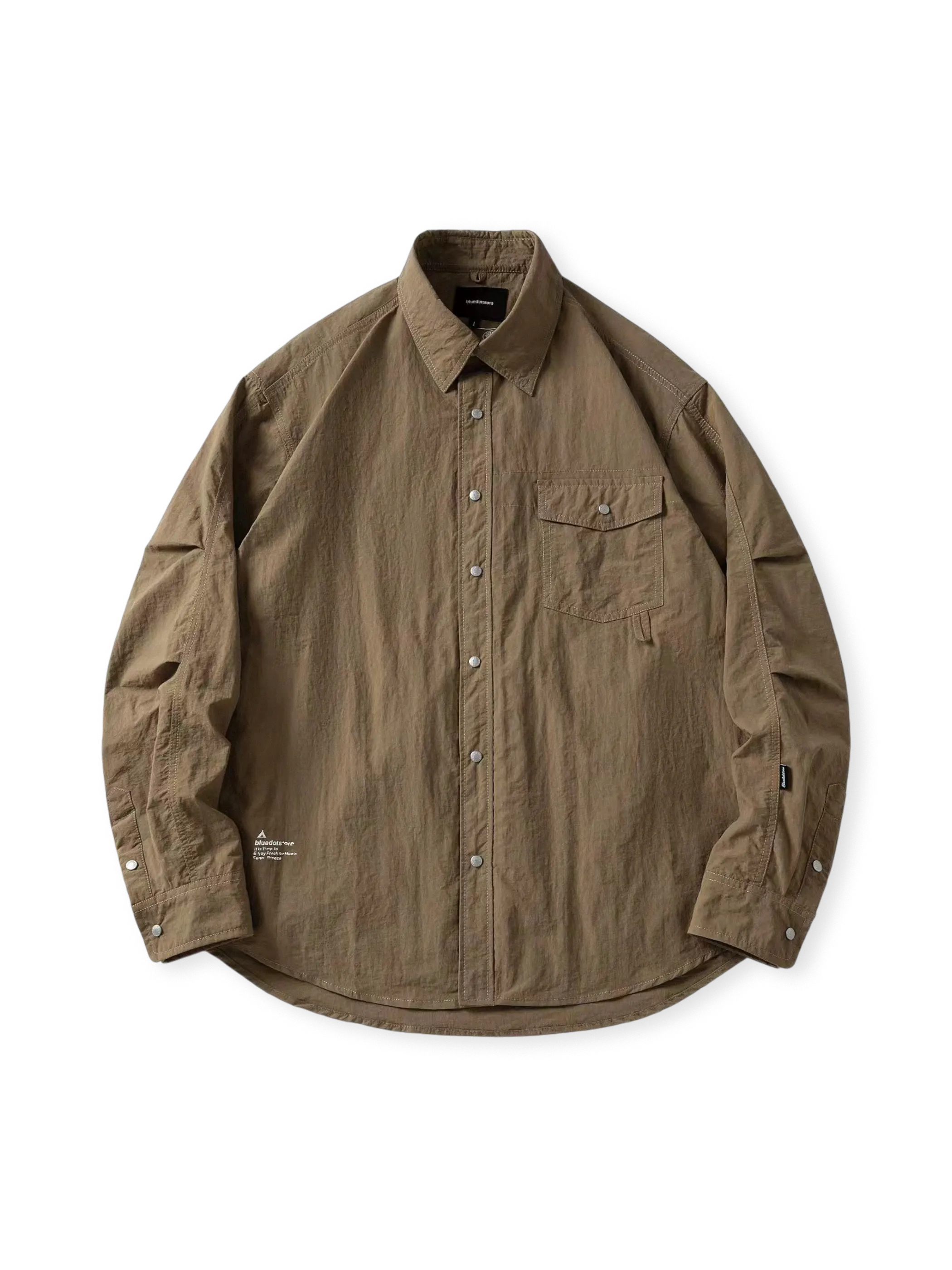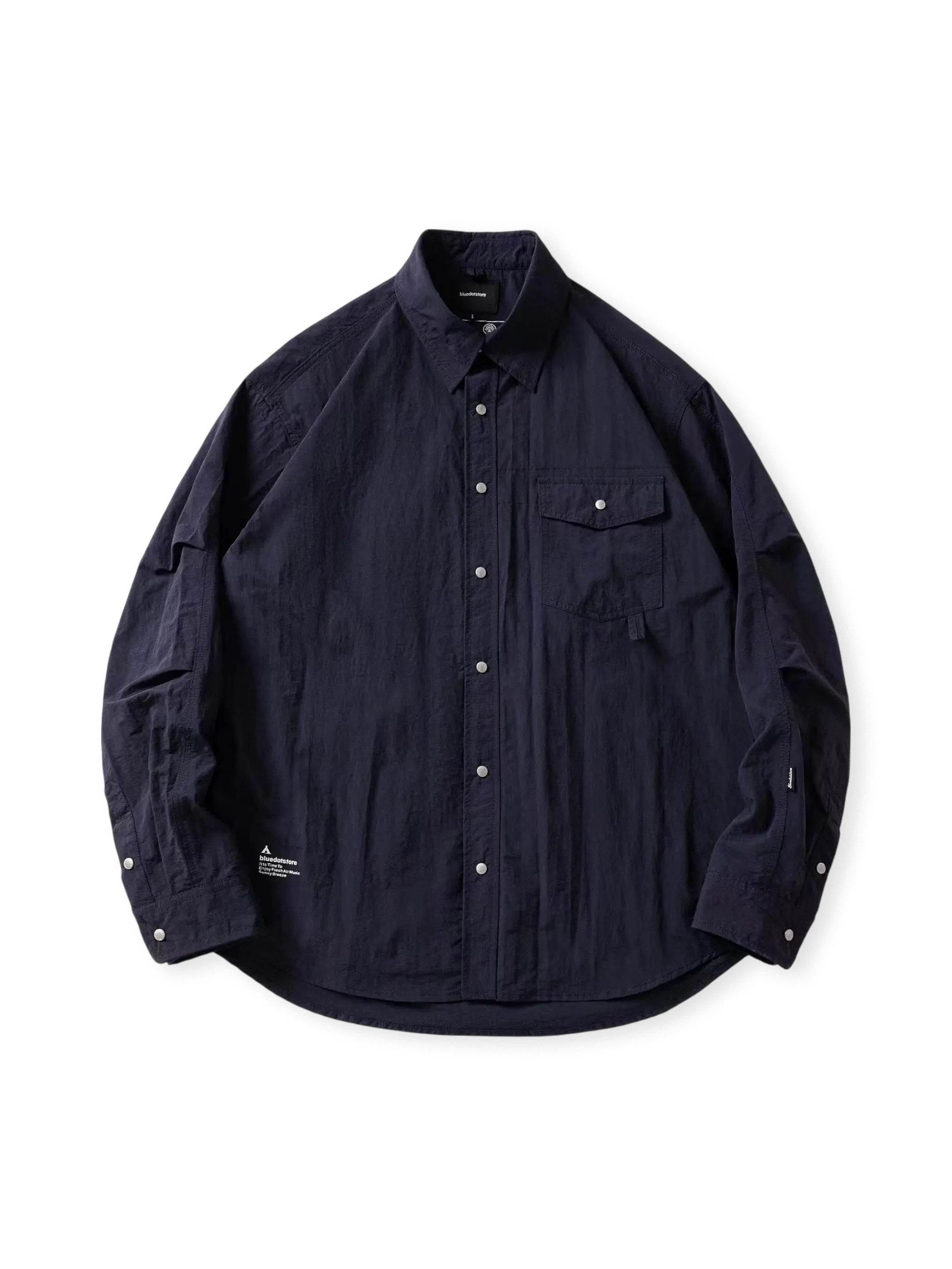 防撥水・速乾性素材と落ち感のあるオーバーサイズデザイン、多機能ポケットが魅力の長袖シャツ。通勤からアウトドアまで、実用性とスタイリッシュさを両立します。