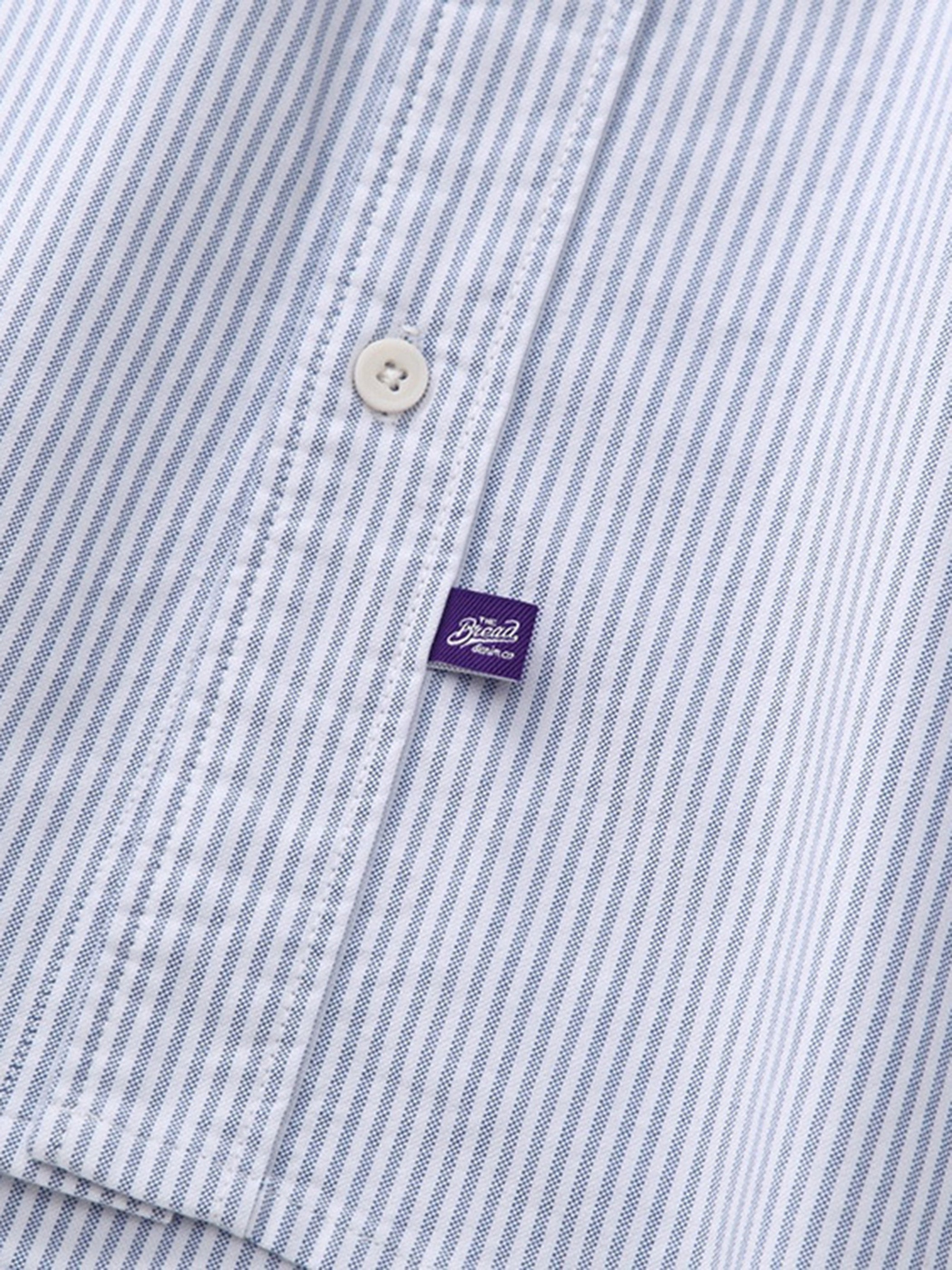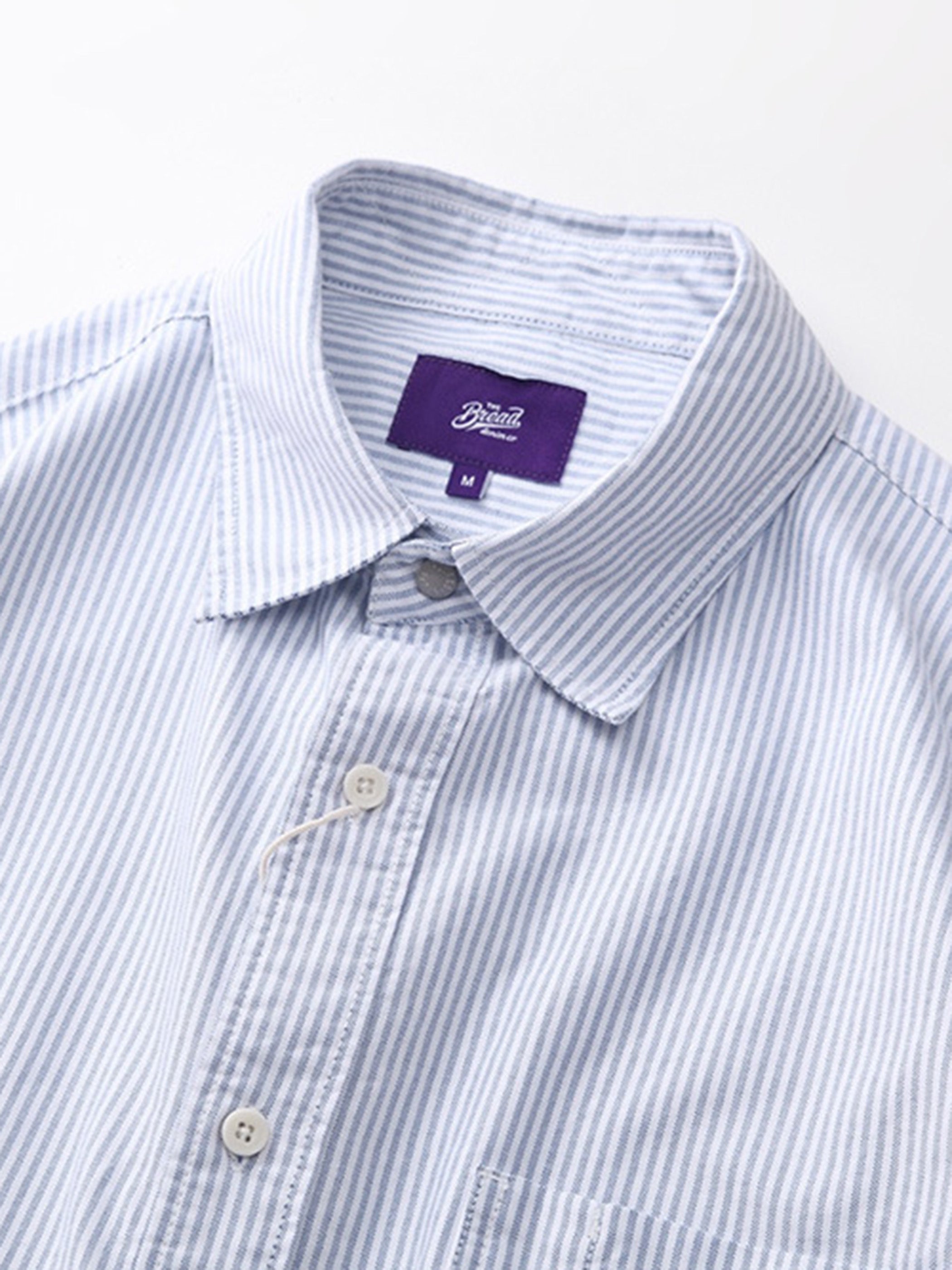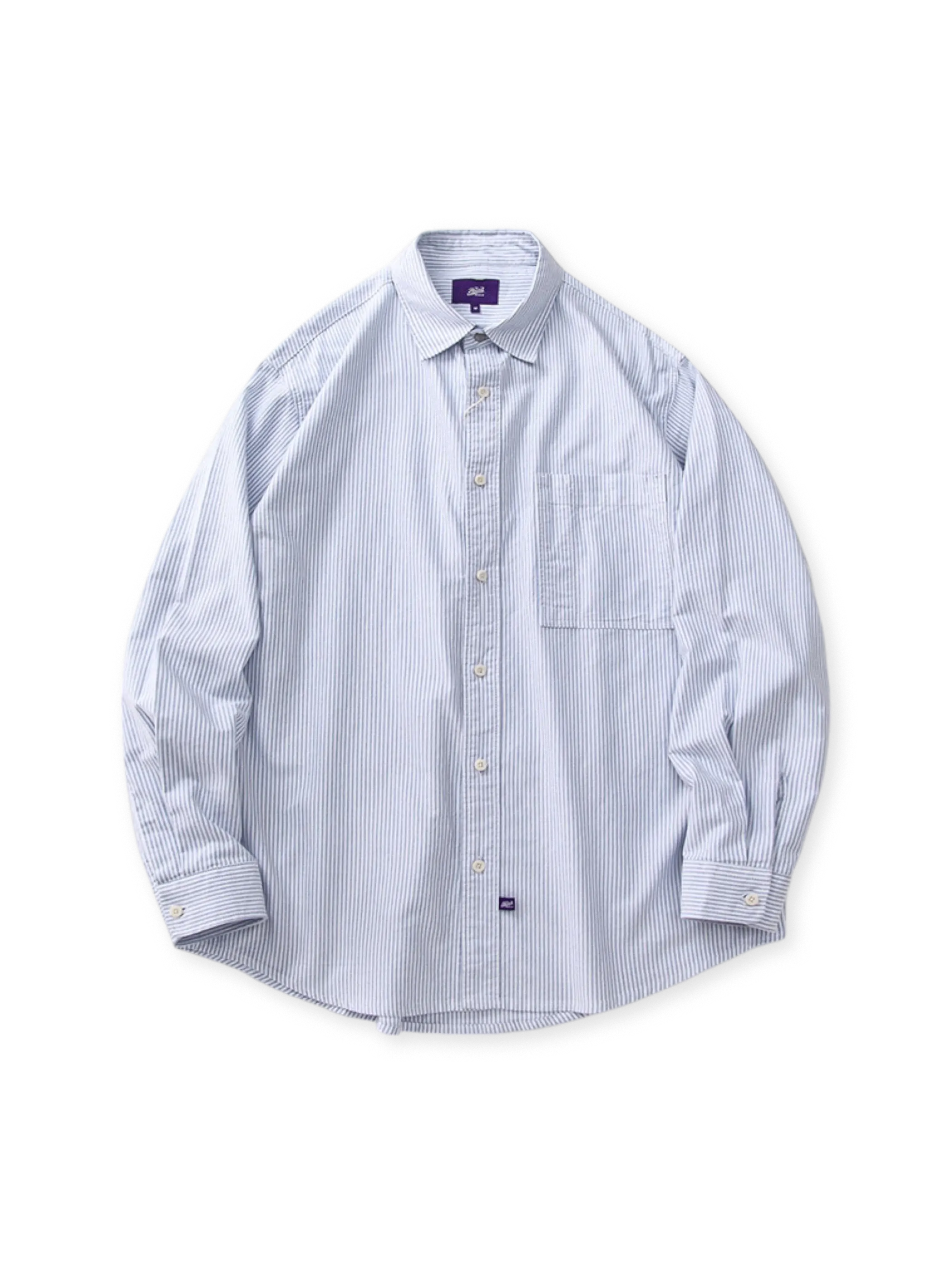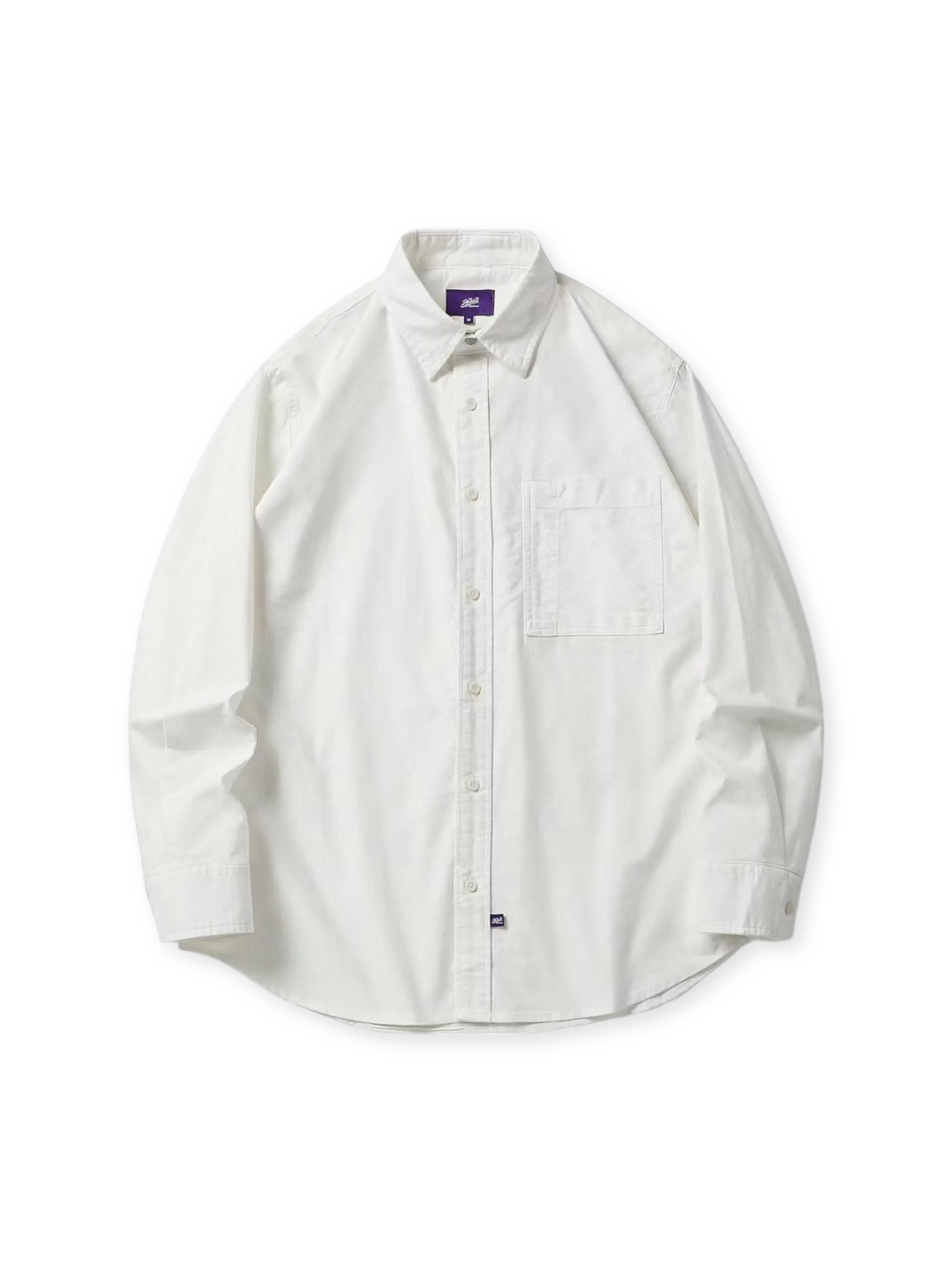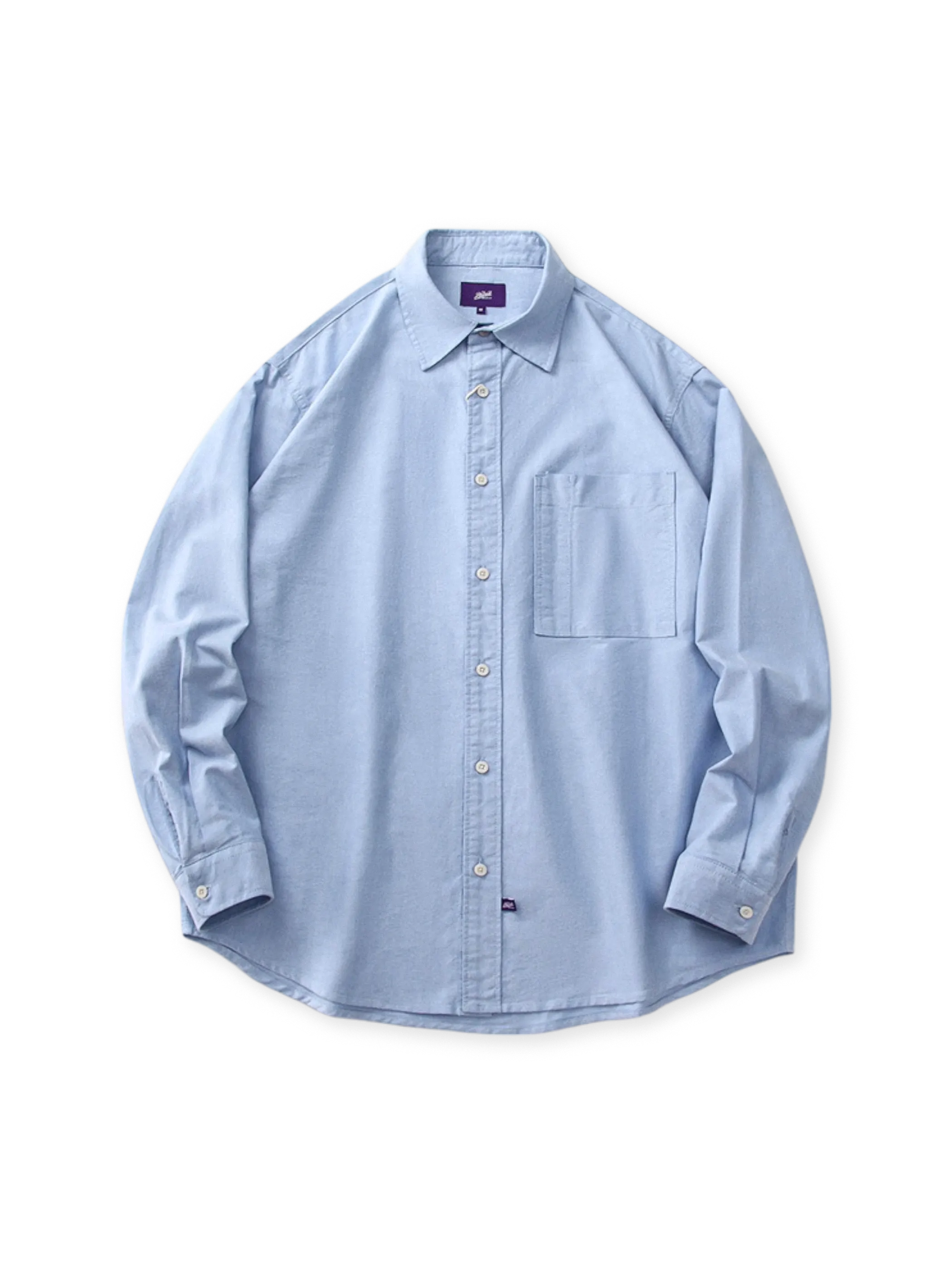 ウォッシュ加工を施した丈夫なオックスフォード生地と落ち感のあるルーズシルエット、胸元のパープルタグがさりげないアクセントとなる、快適かつ上質なワイドシャツです。