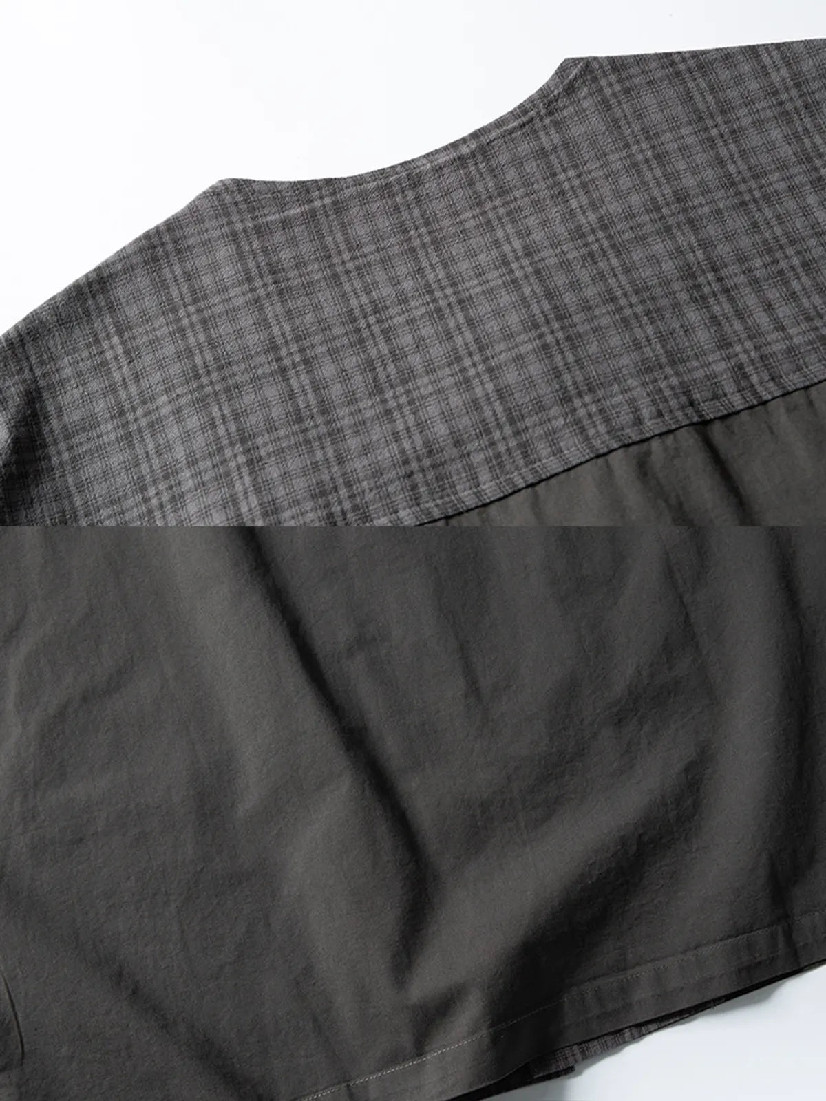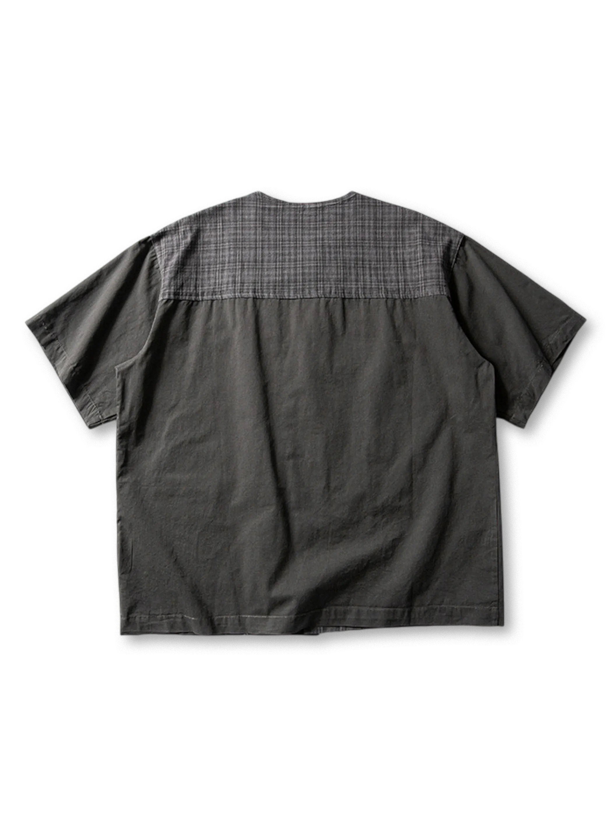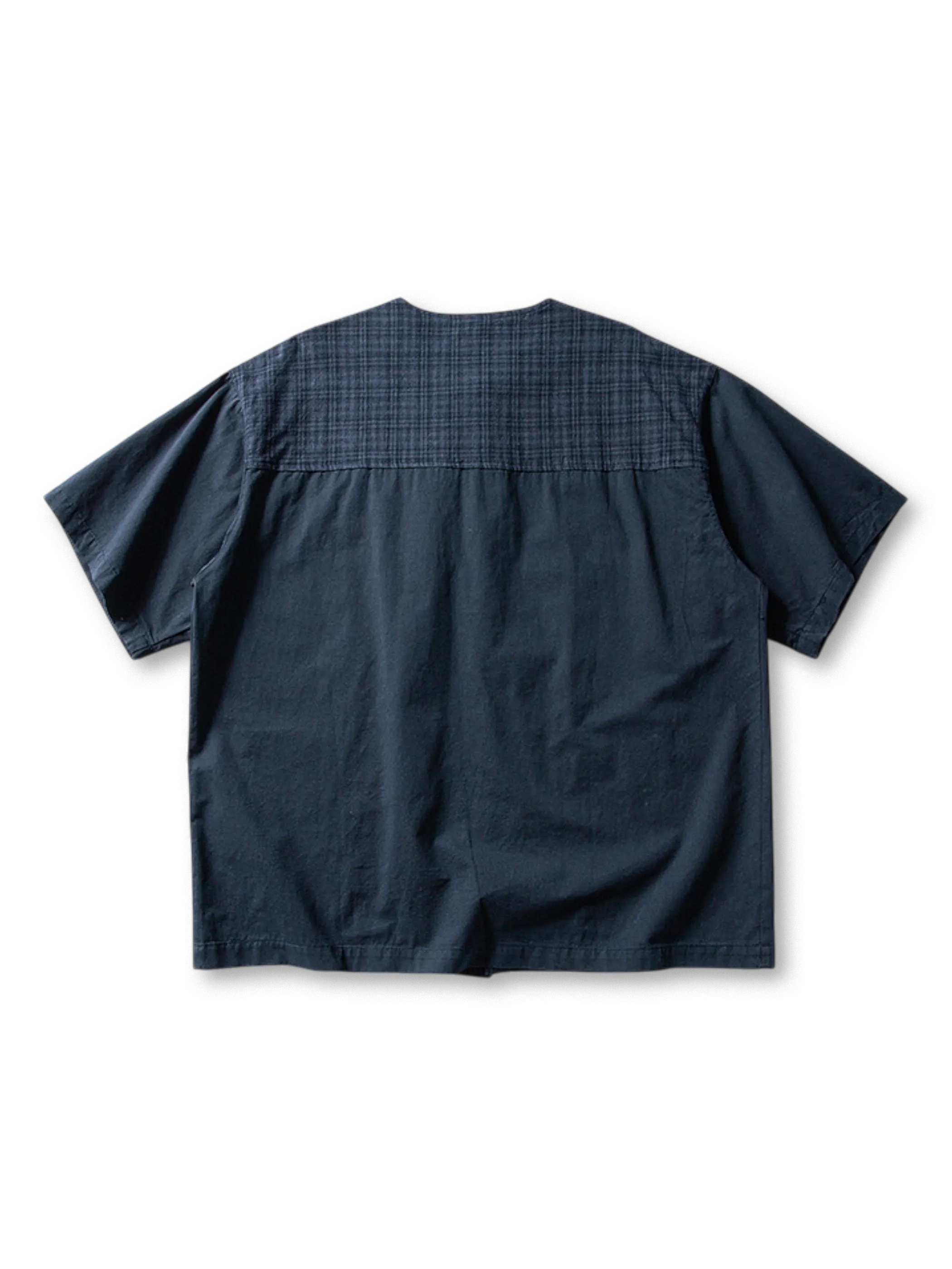 伝統的なワークウェアをベースに、フロント中央のチェック柄パネルと同色ポケットを組み合わせたデザインが特徴。ゆったりとしたボックスシルエットは、通気性に優れる薄手のコットン100%生地で仕立てられ、夏のデイリーユースに最適です。ノーカラーの襟元は首まわりを涼しく見せ、ショーツやワイドパンツとの相性も抜群。ストリートからリゾートまで、幅広いスタイリングに対応します。