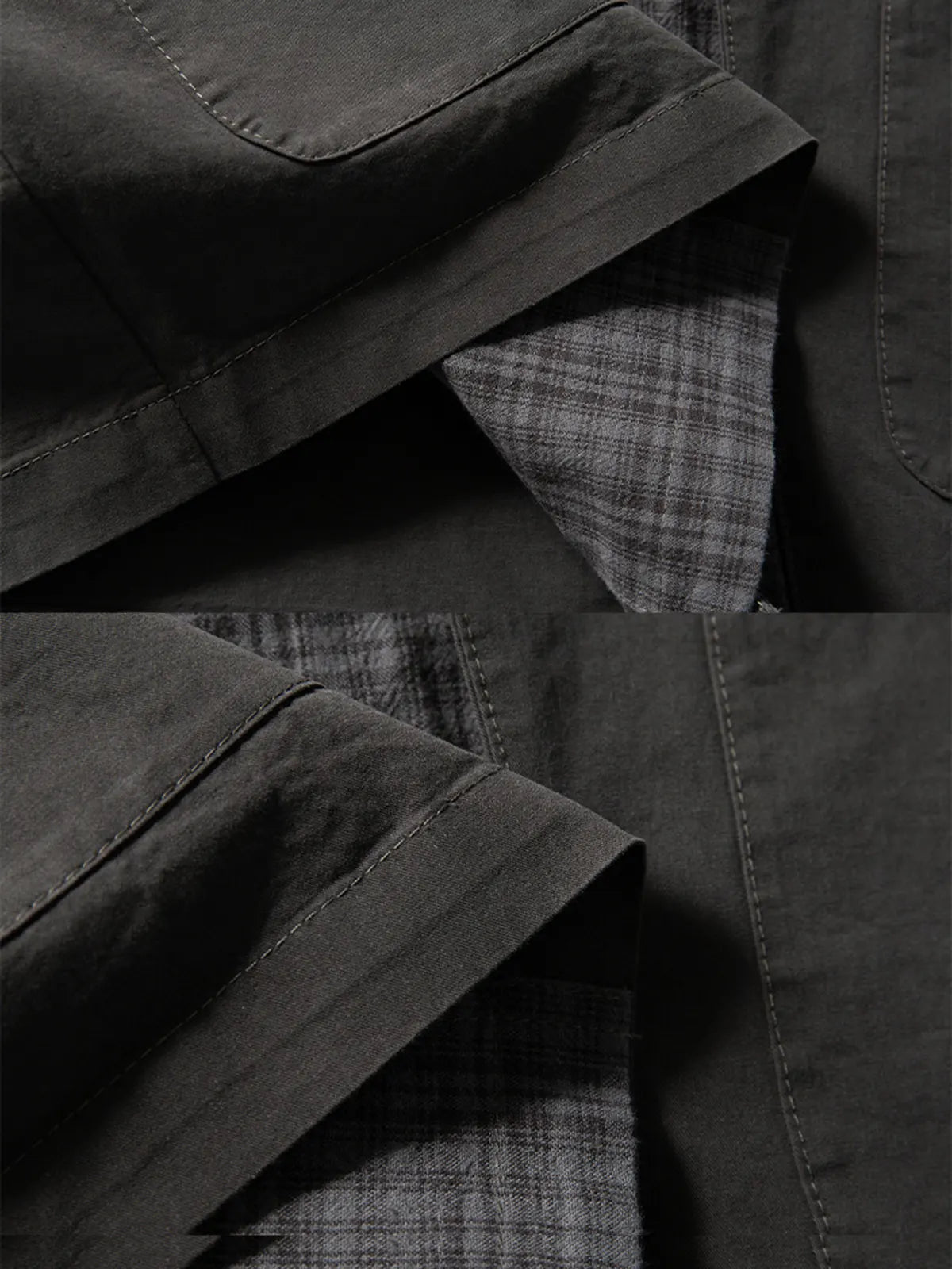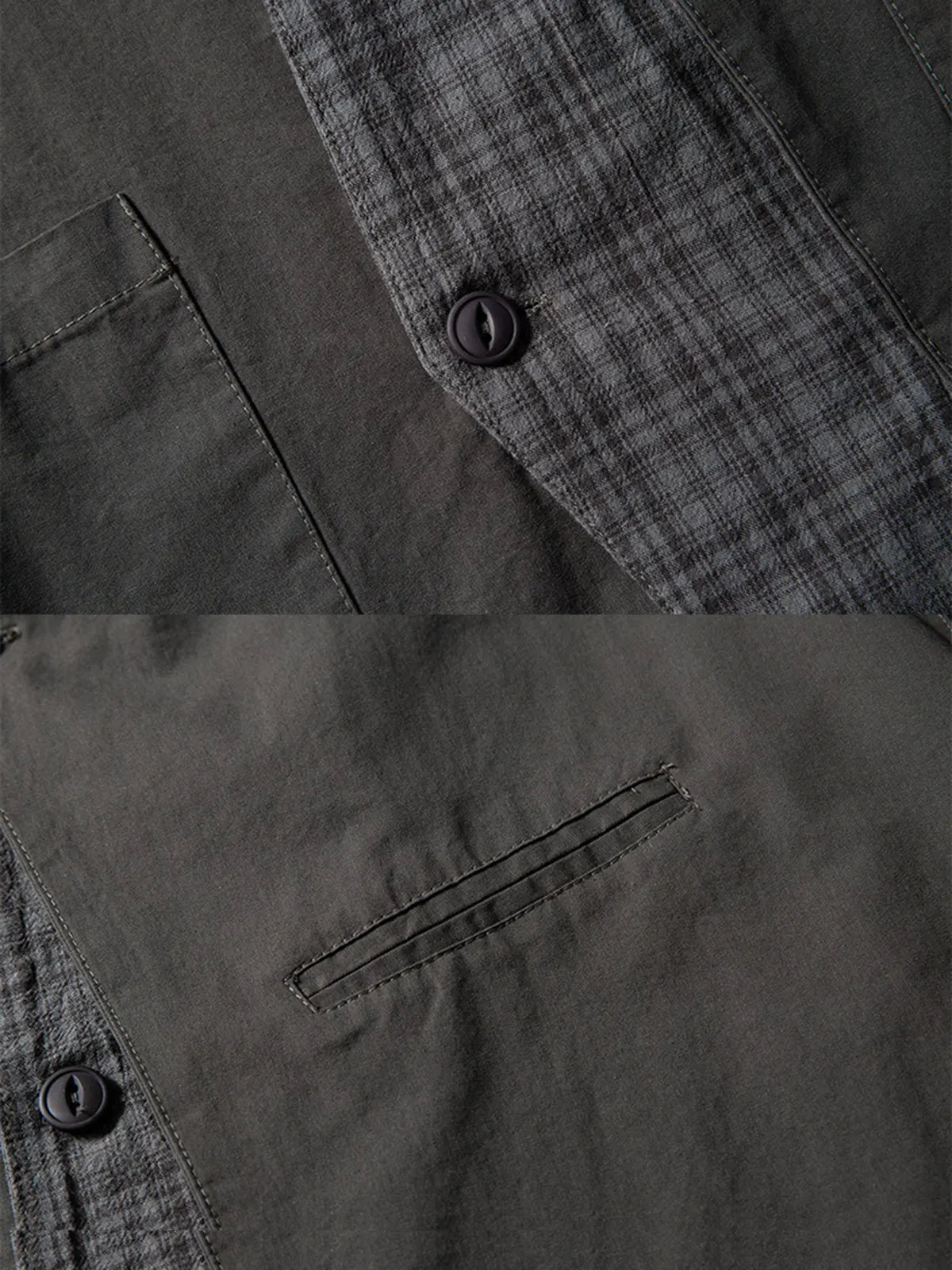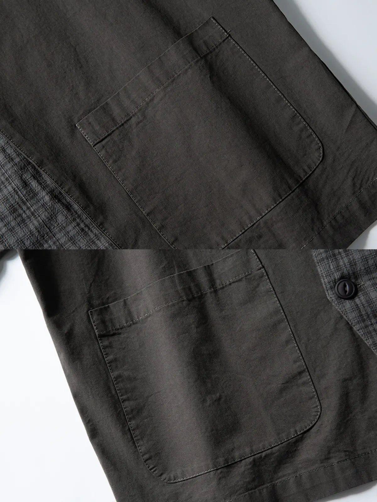 伝統的なワークウェアをベースに、フロント中央のチェック柄パネルと同色ポケットを組み合わせたデザインが特徴。ゆったりとしたボックスシルエットは、通気性に優れる薄手のコットン100%生地で仕立てられ、夏のデイリーユースに最適です。ノーカラーの襟元は首まわりを涼しく見せ、ショーツやワイドパンツとの相性も抜群。ストリートからリゾートまで、幅広いスタイリングに対応します。