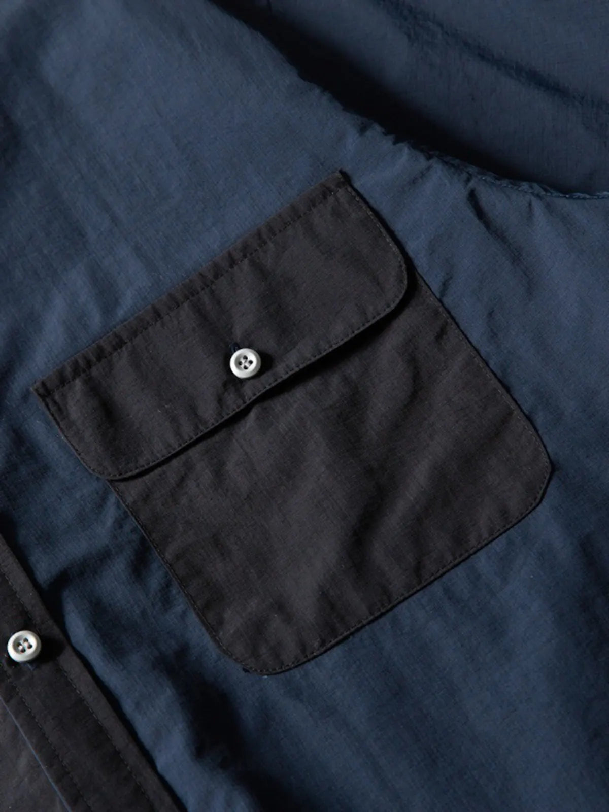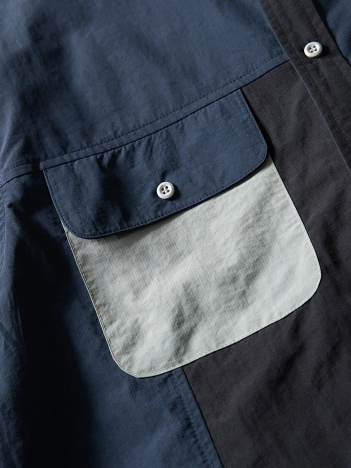 マルチカラーのパッチワークとユーティリティポケットが特徴のヴィンテージライクなナイロンワークシャツ。