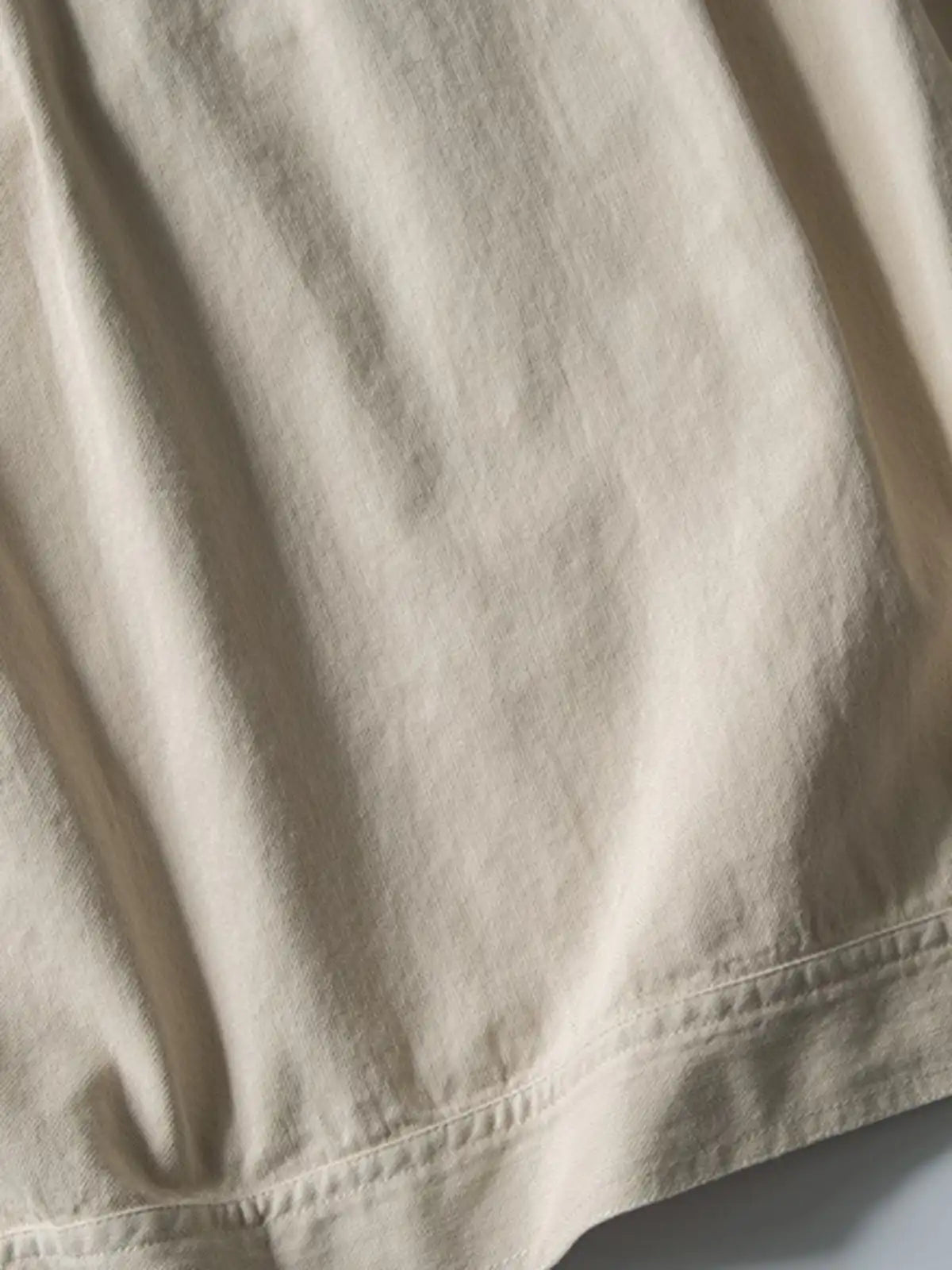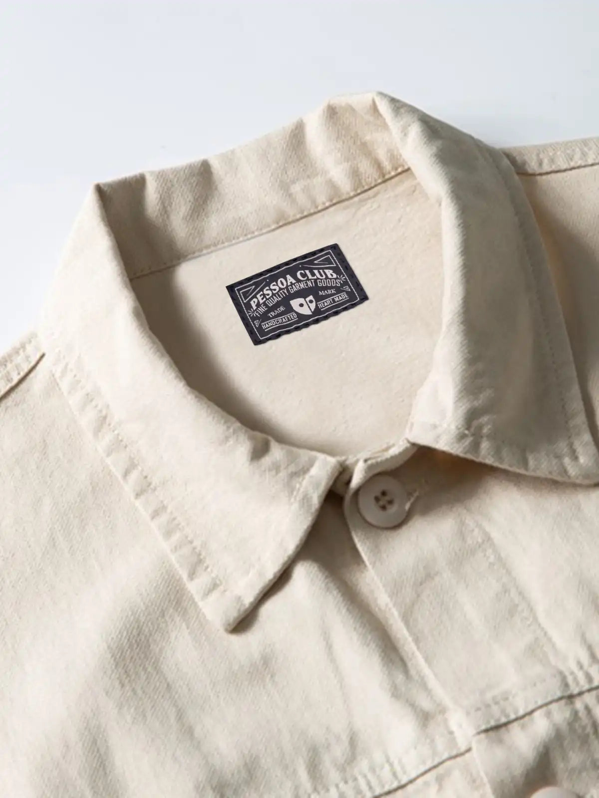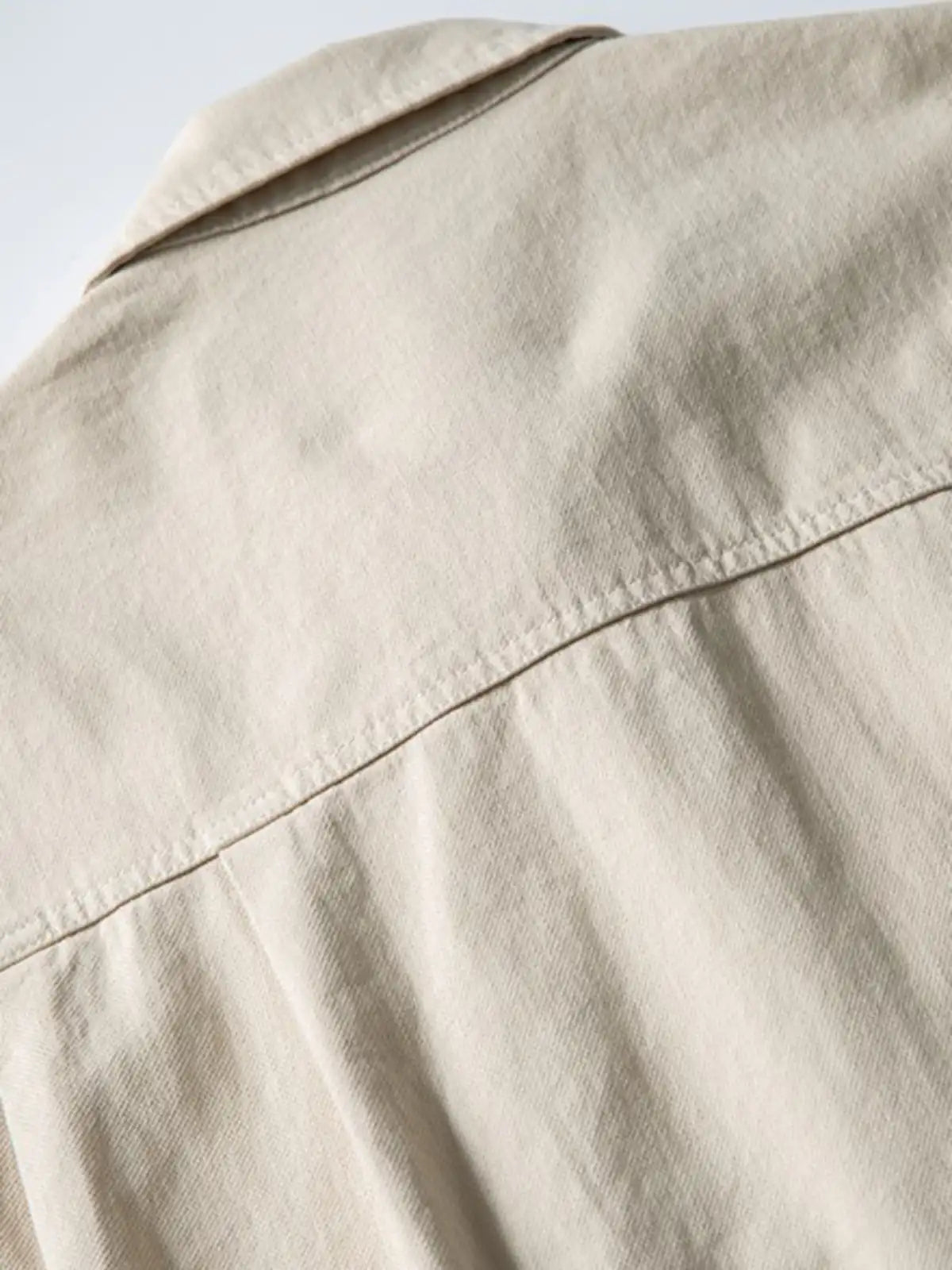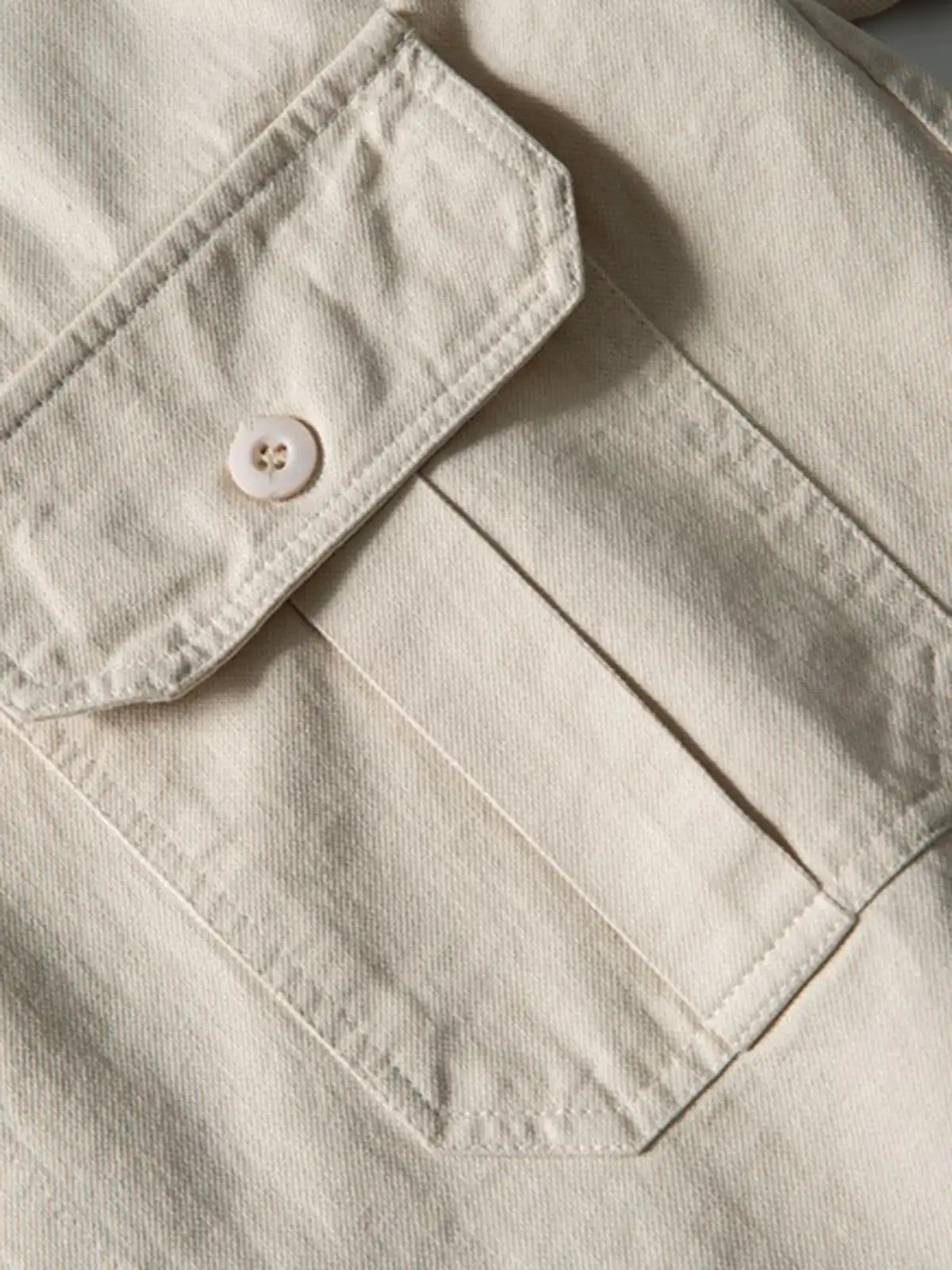 1940年代のワークウェアに着想を得たオープンカラーに、大容量のフラップポケットと上下の隠しボタンを配した実用的デザイン。ヘビーウェイトコットンを使用しながらもウォッシュで柔らかく仕上げ、ストレスフリーな着心地を実現。黒、ブラウン、ベージュの3色展開で、ミリタリーパンツやデニムとの相性も抜群です。