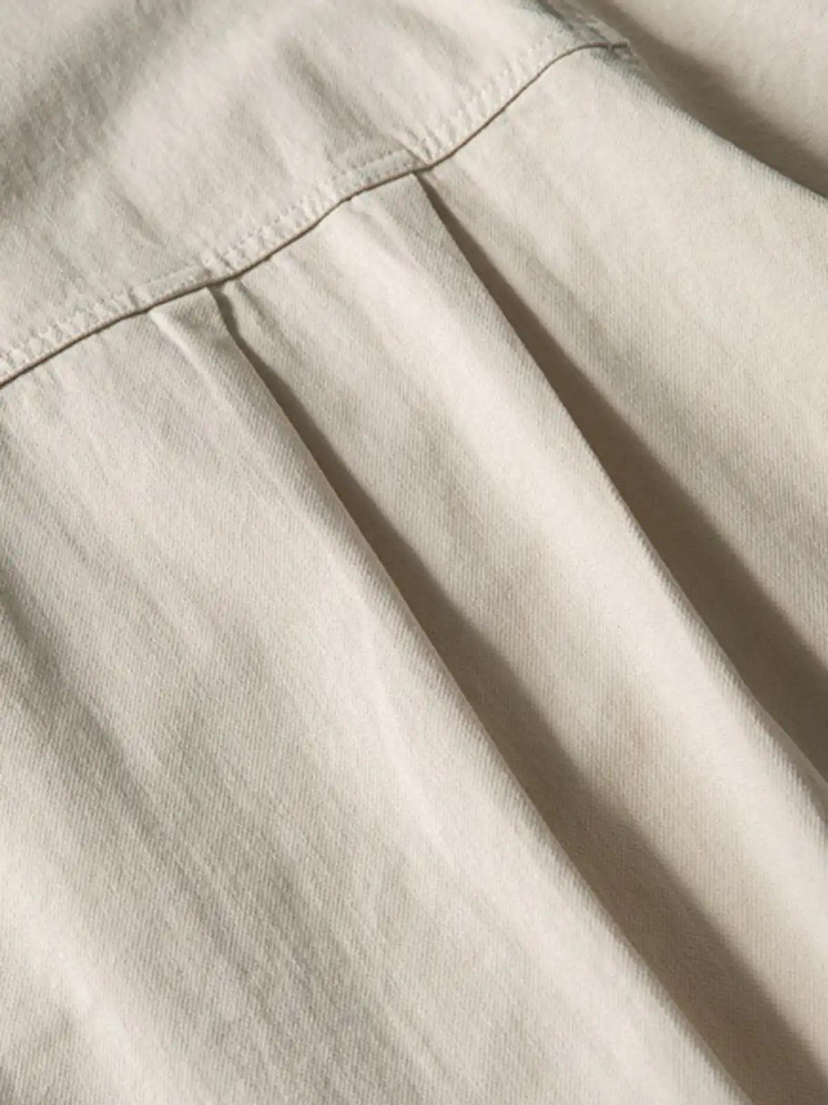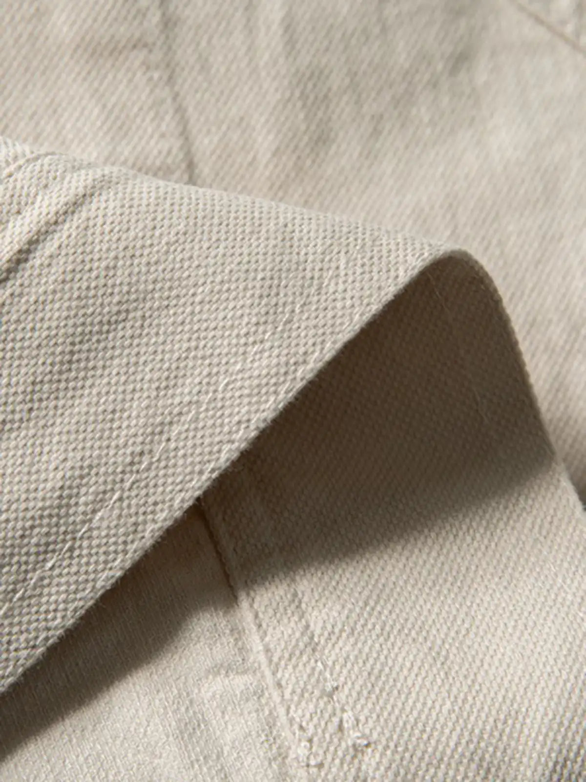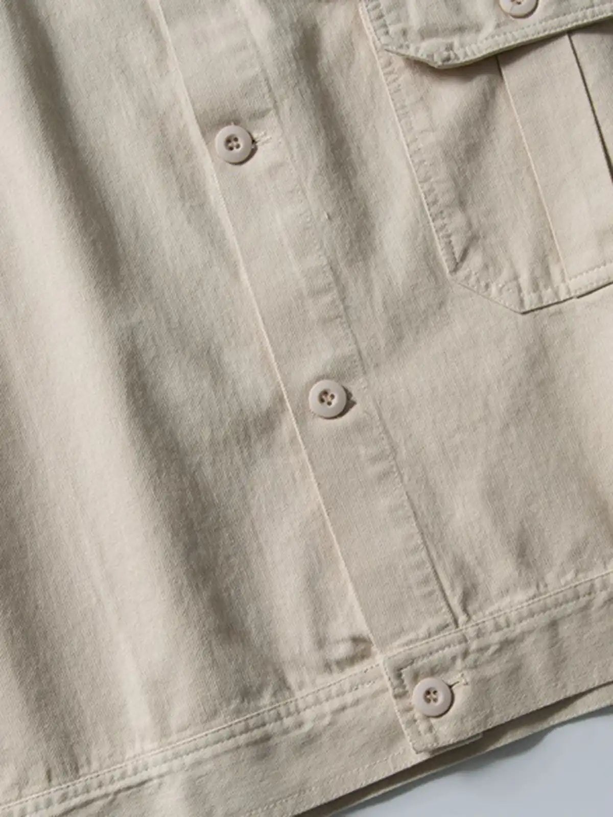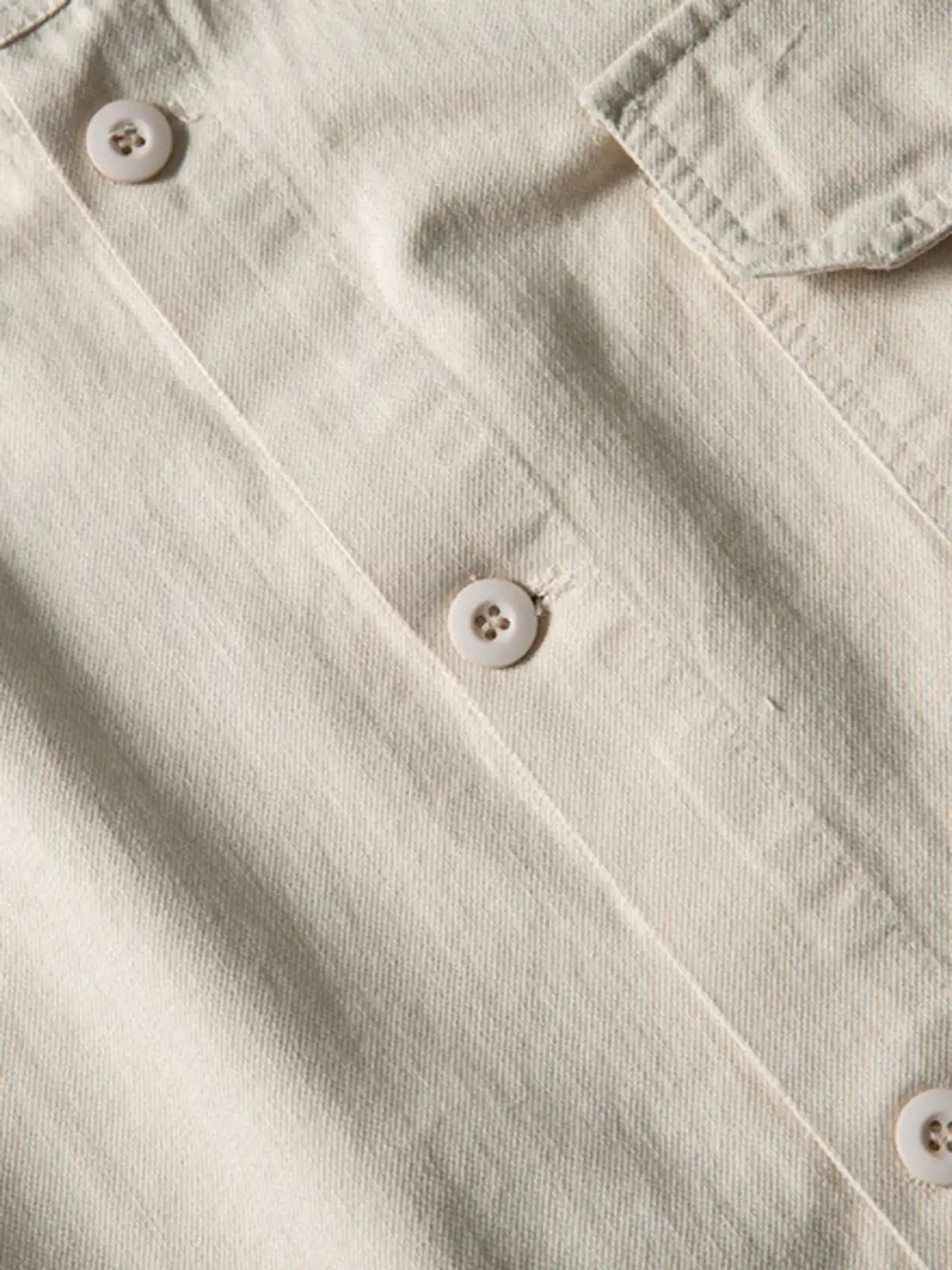 1940年代のワークウェアに着想を得たオープンカラーに、大容量のフラップポケットと上下の隠しボタンを配した実用的デザイン。ヘビーウェイトコットンを使用しながらもウォッシュで柔らかく仕上げ、ストレスフリーな着心地を実現。黒、ブラウン、ベージュの3色展開で、ミリタリーパンツやデニムとの相性も抜群です。