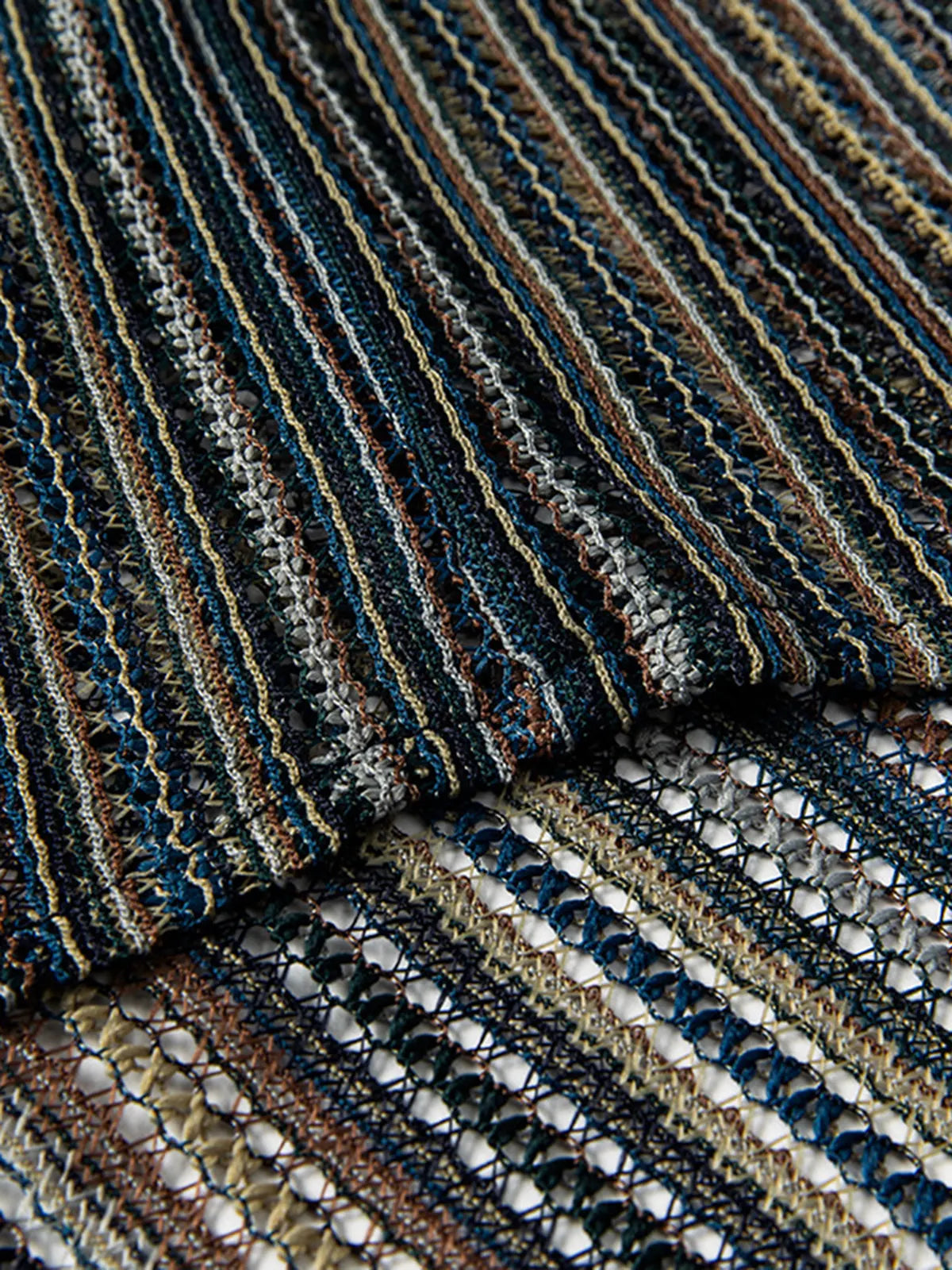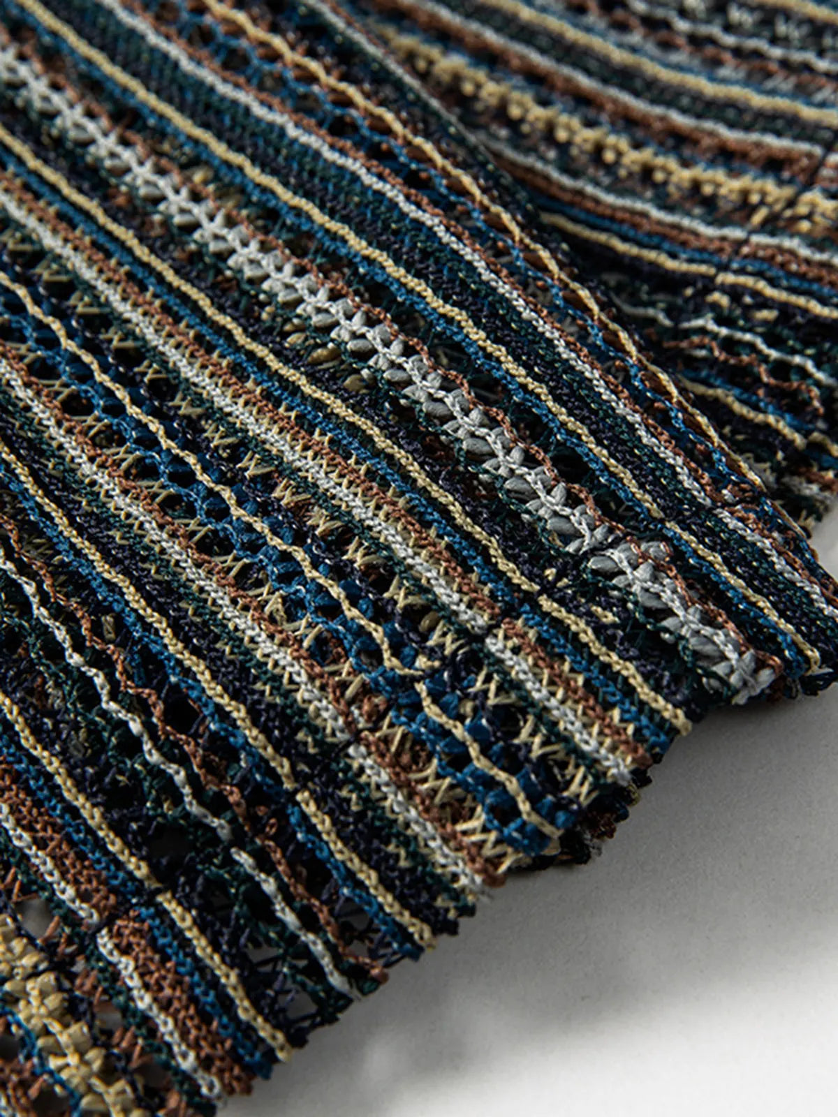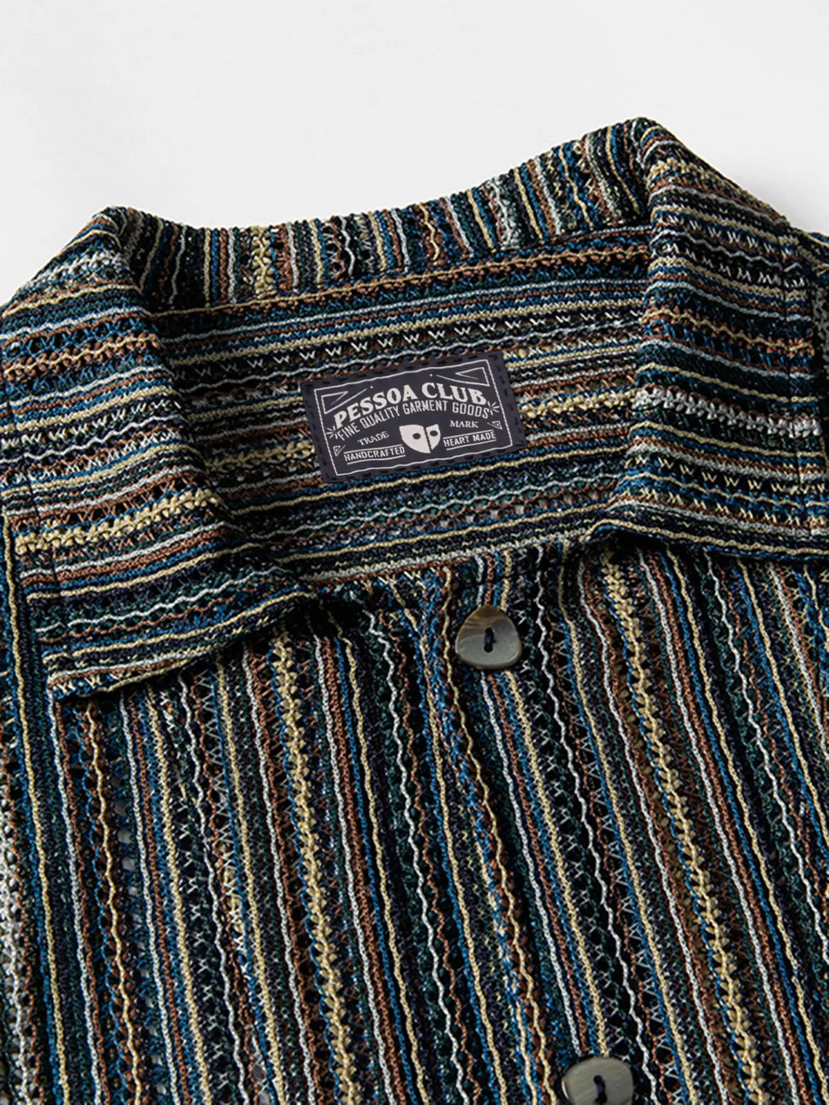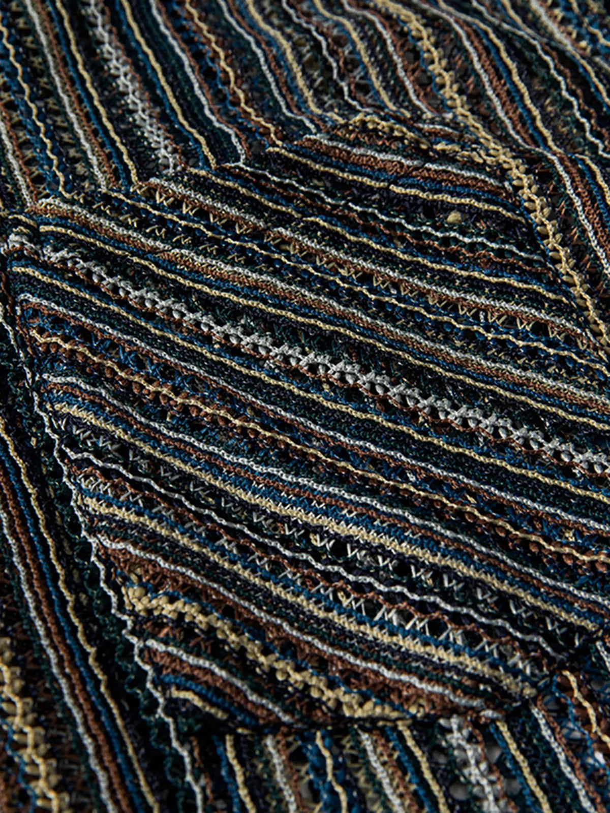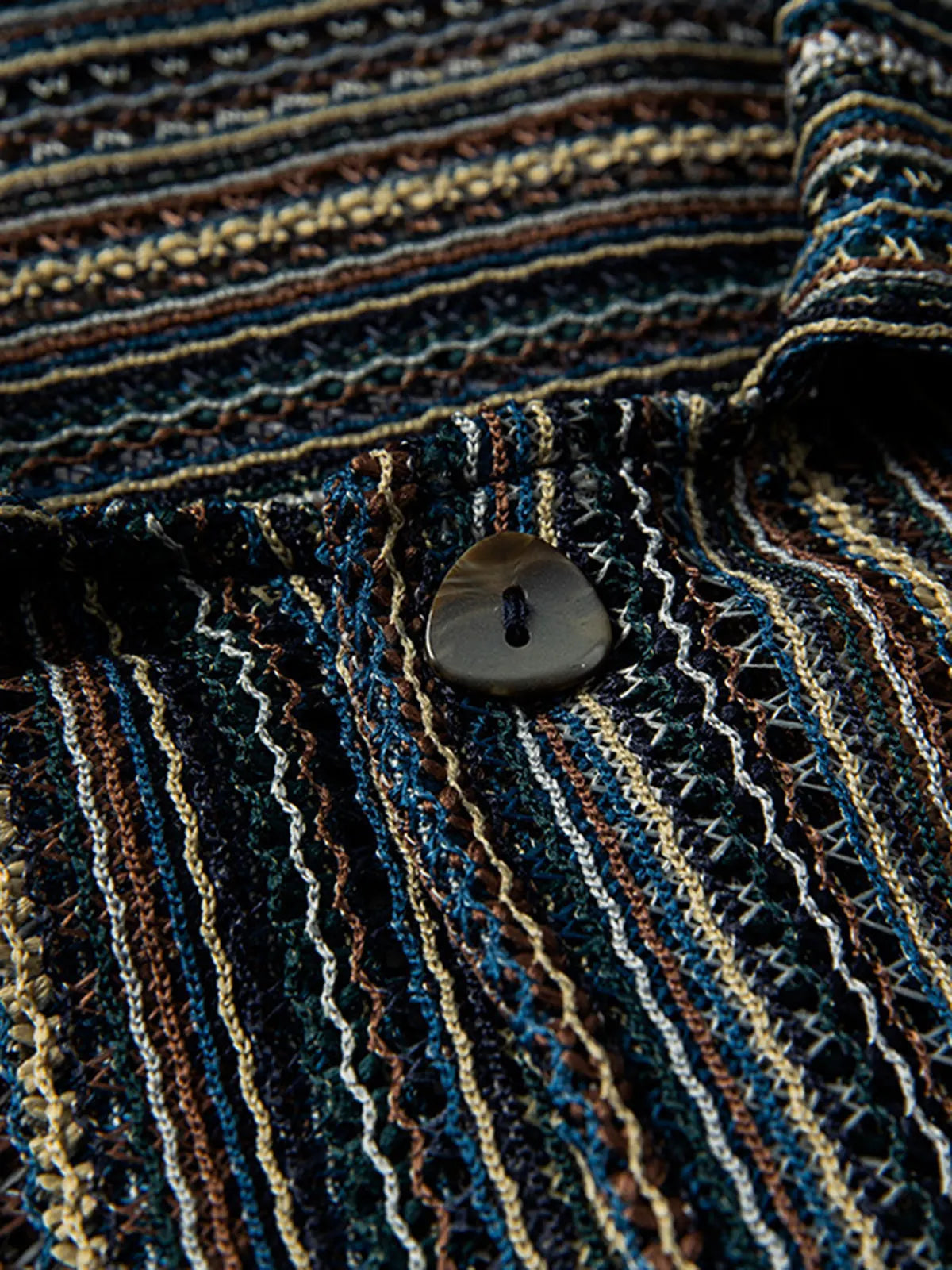 細番手のポリエステル糸を用いた空気穴編みニット生地は、縦方向に色糸を配して複雑な表情を編み出し、透けるほどの軽さと夏の通気性を両立。襟付きのオープンカラーと胸ポケットの斜め柄合わせがクラシックな印象を保ちつつ、裾をややラウンドさせたボックスシルエットはタックアウトでもタックインでもサマになるデザイン。生地の立体的な編み目が日差しを遮りつつ涼感を提供し、ショーツやライトデニムパンツと合わせるだけで、リゾートからタウンユースまで対応するレトロなモダンカジュアルが完成。