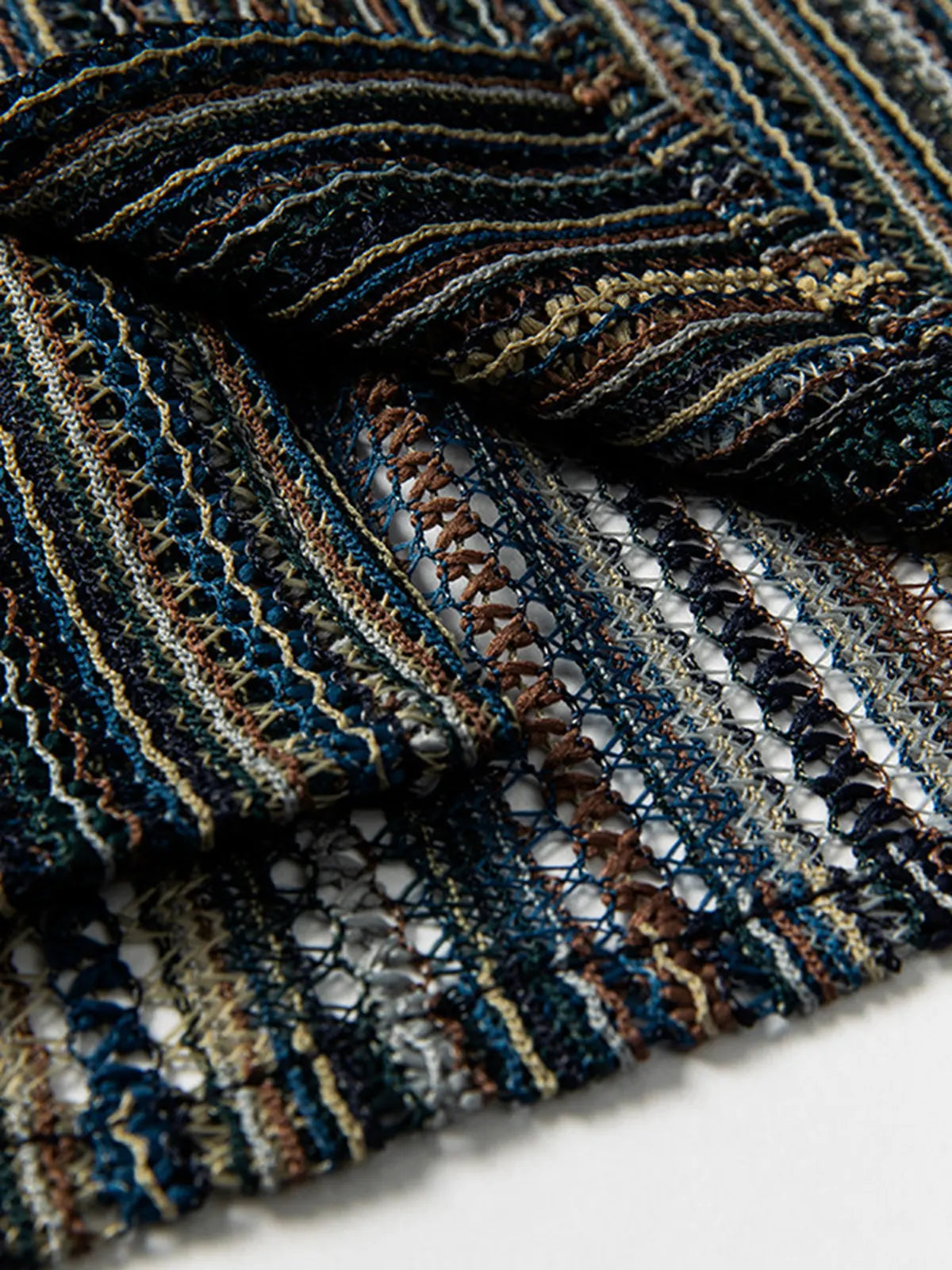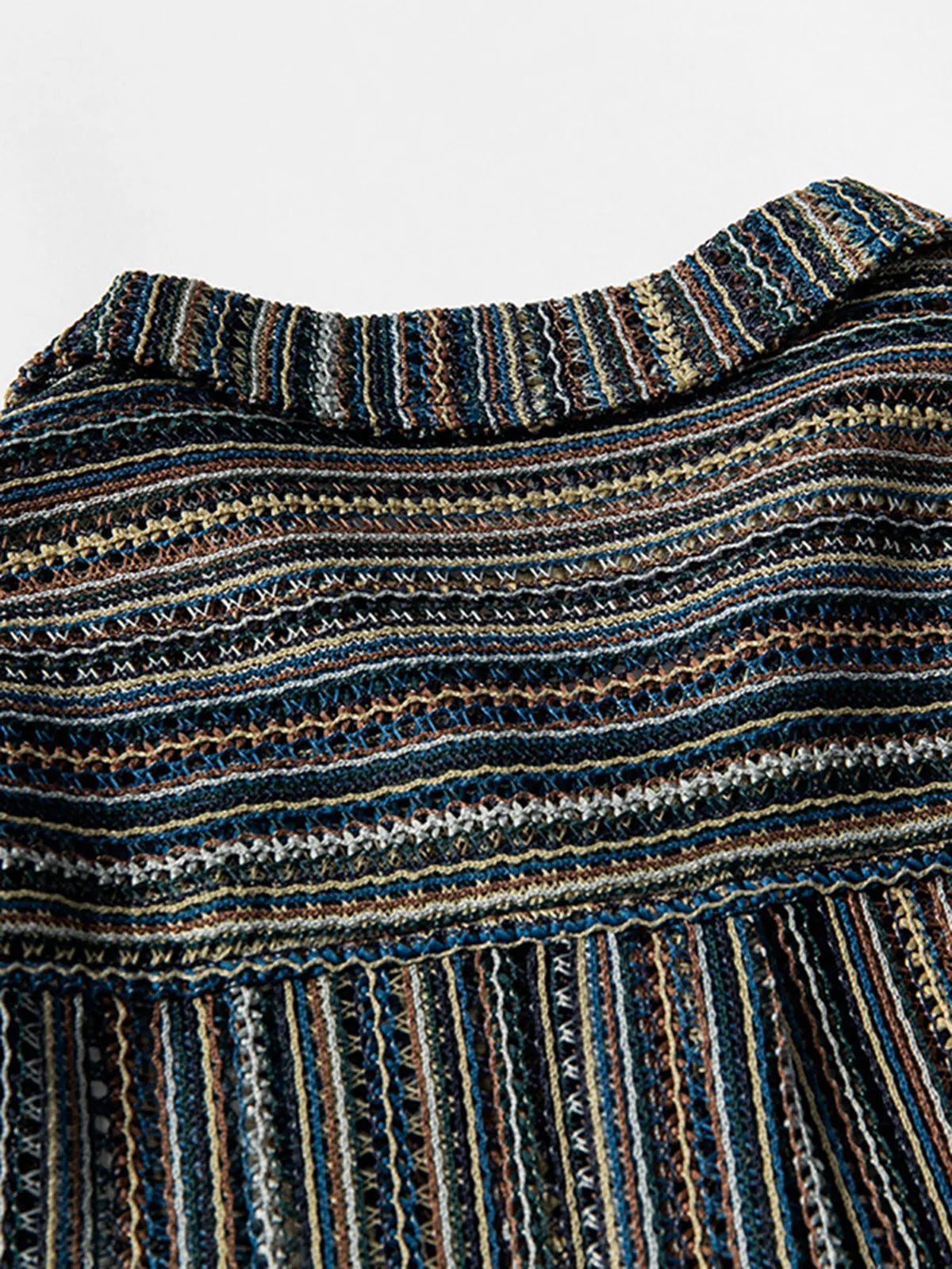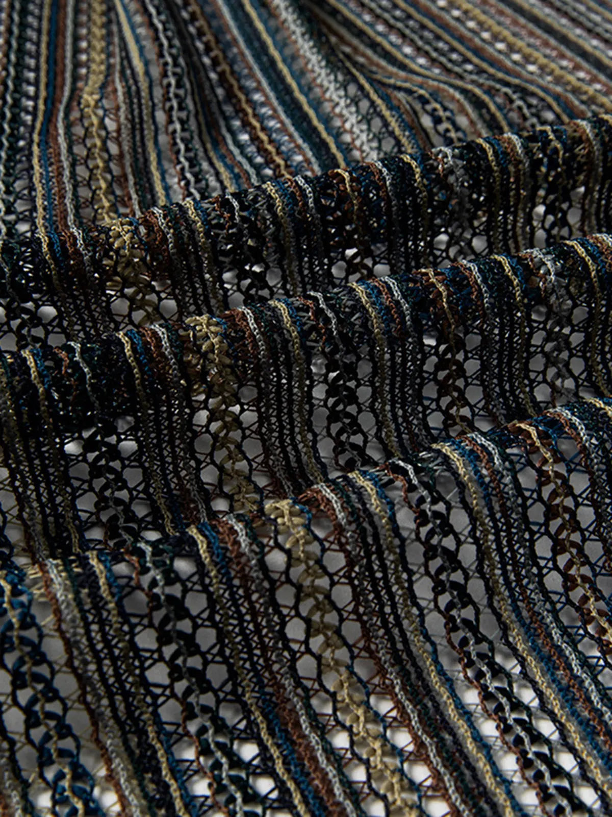 透け感ある空気穴編みの縦ストライプ柄が特徴の、軽やかな100%ポリエステル製オープンカラーシャツ。